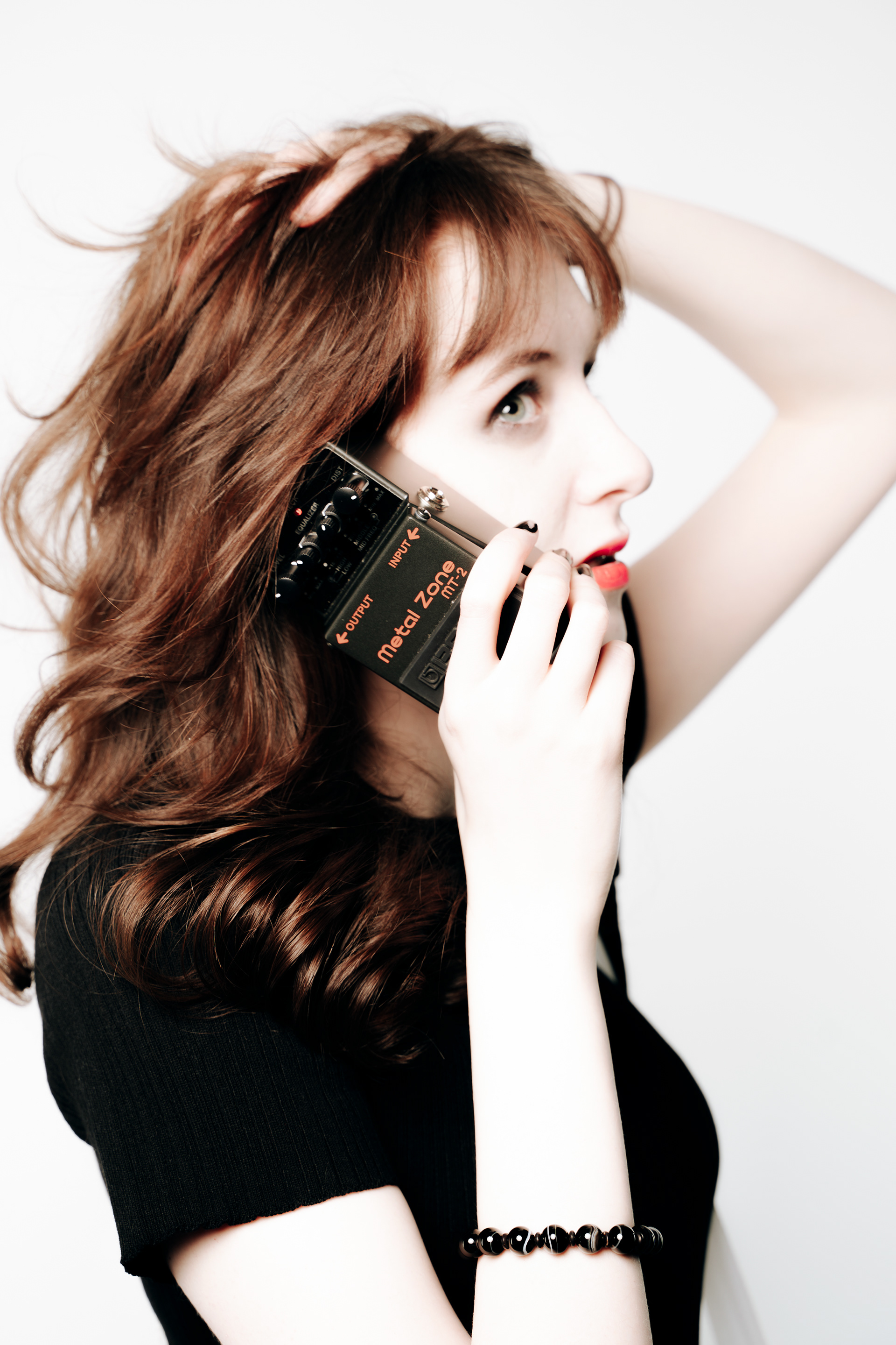 I picked these 3 images from the set because The first image shows the model posing with the pedal, the second with the guitar, and the final showing just the model. I feel these three would have been picked for an actual campaign for this reason and includes the one without any branding as to try and appear as if they are not only and directly selling. I also like the models poses in these images. The first image shows a very classic on the phone shot but with the pedal as the phone so I feel like it looks staged in a way that an audience would recognise as purposefully looking staged, the way she is looking and her hand in her hair shows stress which adds a comedic effect to the photo as the viewer knows she is not actually talking to anyone. The lighting falls softly on her hair keeping all its detail but still overexposes her face and hands. The red lips show the style of the time I am trying to replicate. because she is looking upwards we can also see the light in her eye which I think adds to the image.