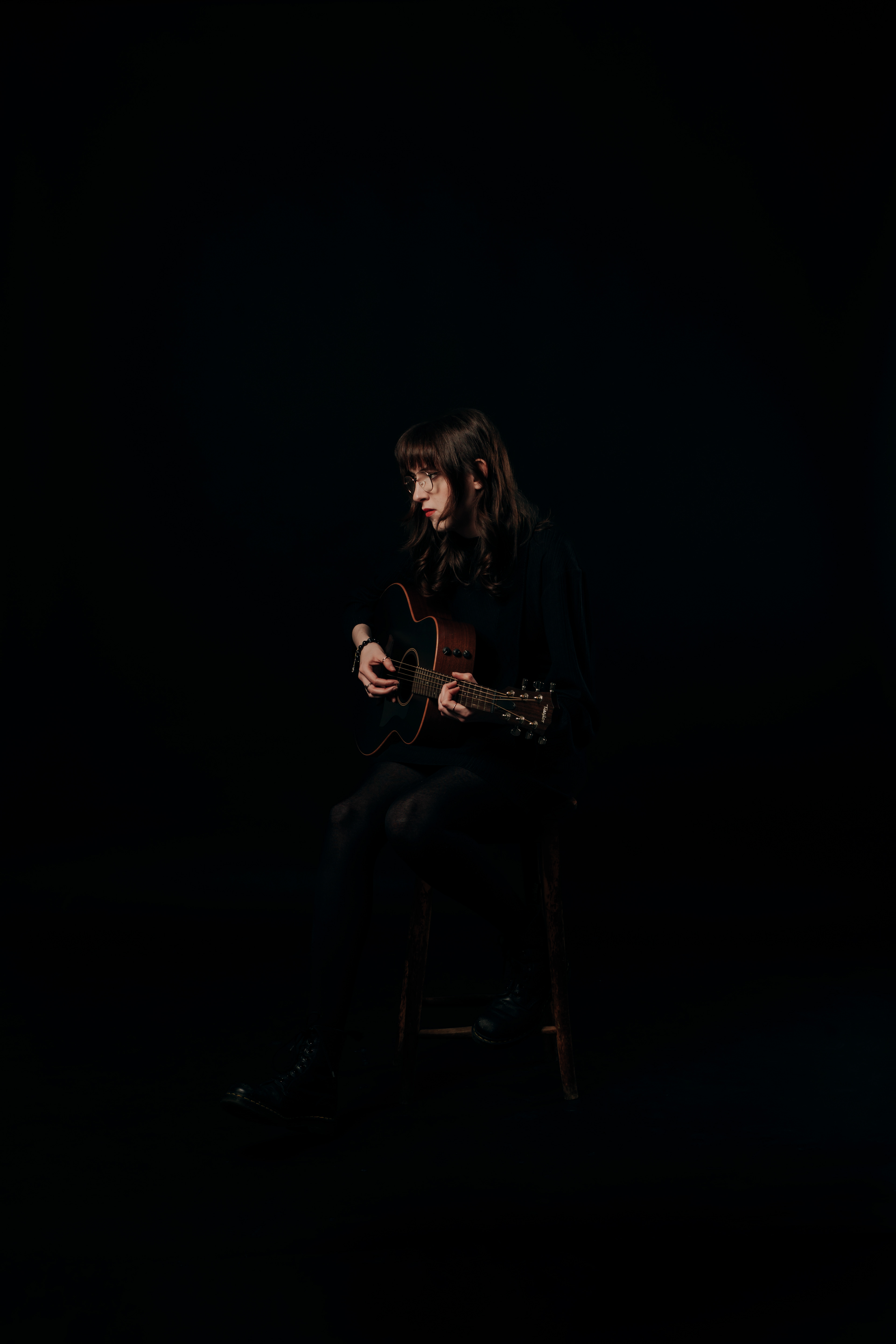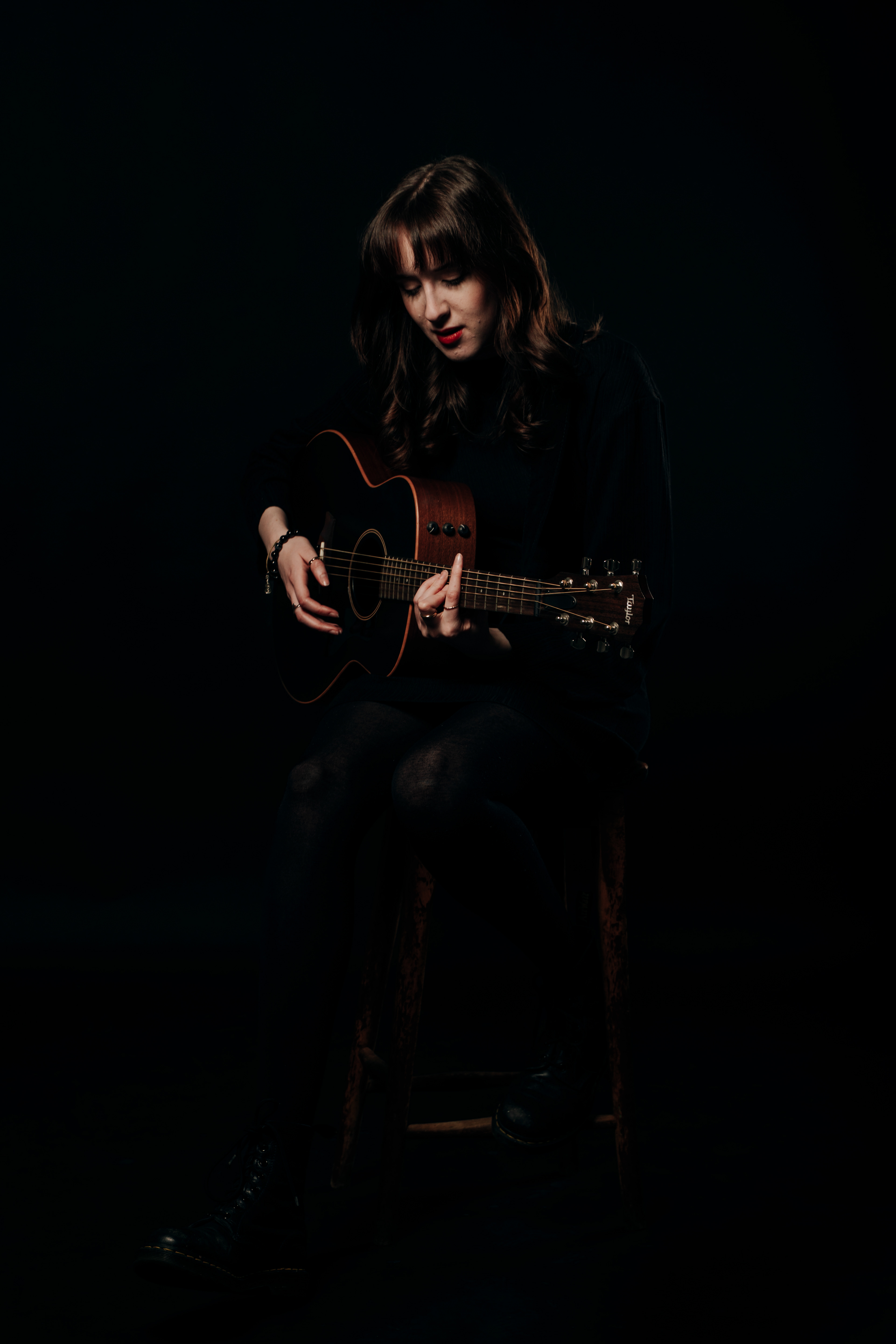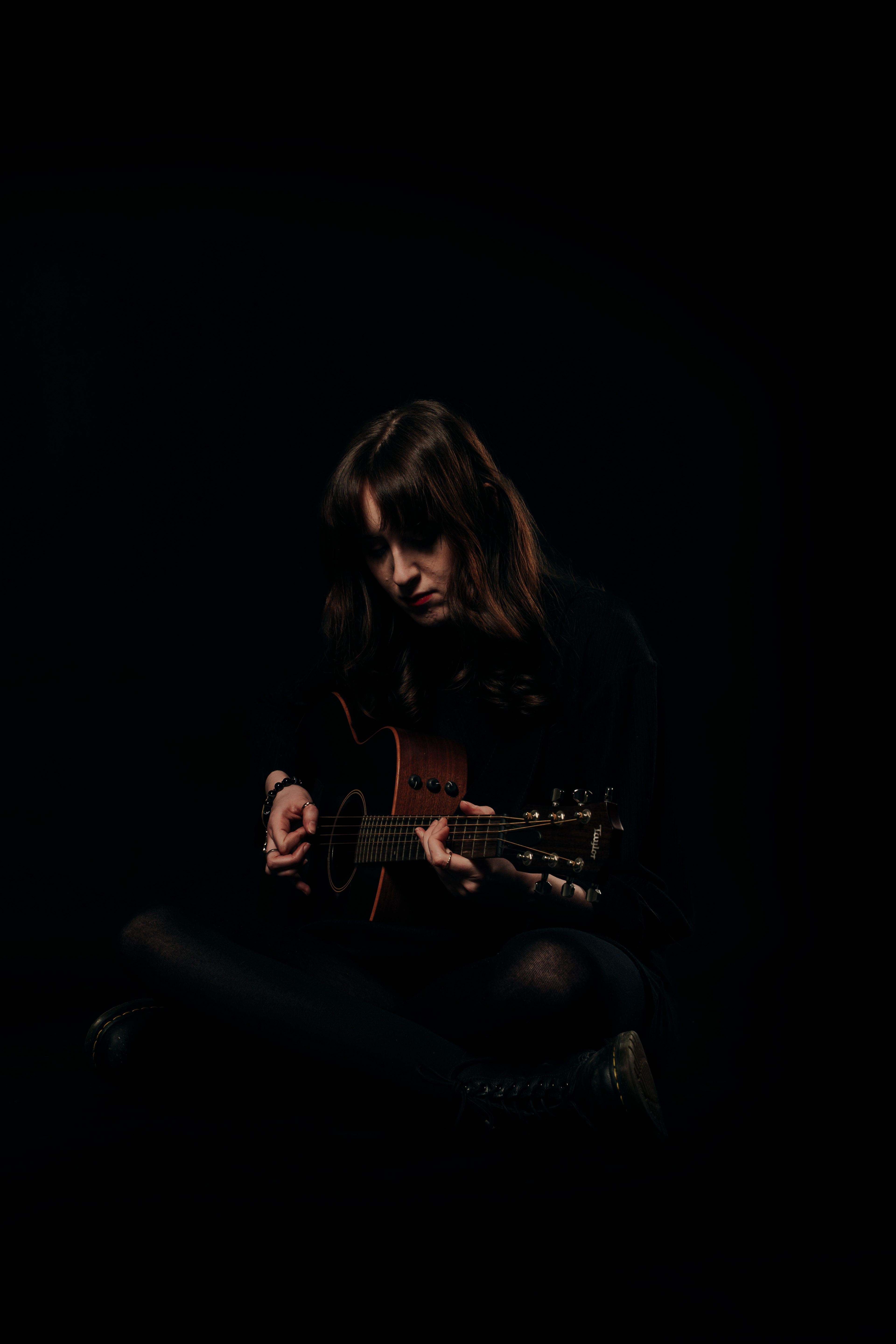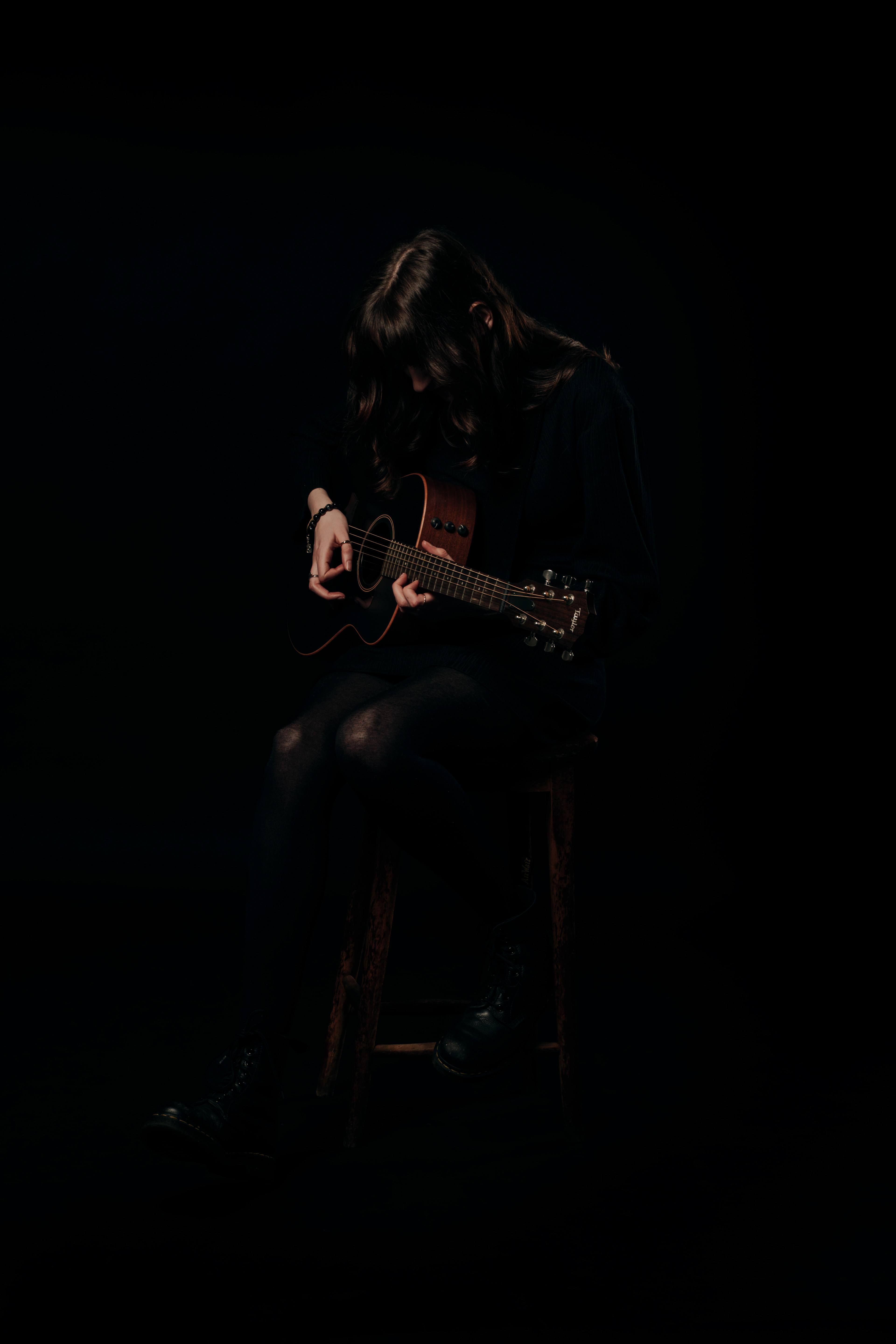 The third image shows the model looking towards the light with the guitar going behind her hair still showing the neck. This is a photo to purely show the subject but the guitar is kept in to remember the context and as the point is still advertising it is in the image subtly. This image has the light falling directly onto the subjects face unlike the last two which creates a beauty effect. the subject however still looks sad which brings could be because the gothic elements of the bats are still in the photo and because in this scene she is a female rockstar who often sing about depressing themes so this could be her brand. Keeping this sad brand and juxtaposing it with the first image brings another comedic value to the first image as it makes it even more clear to the viewer that she was asked to pose like that as it doesn't seem like something she would usually do with the other 2 images contexts.