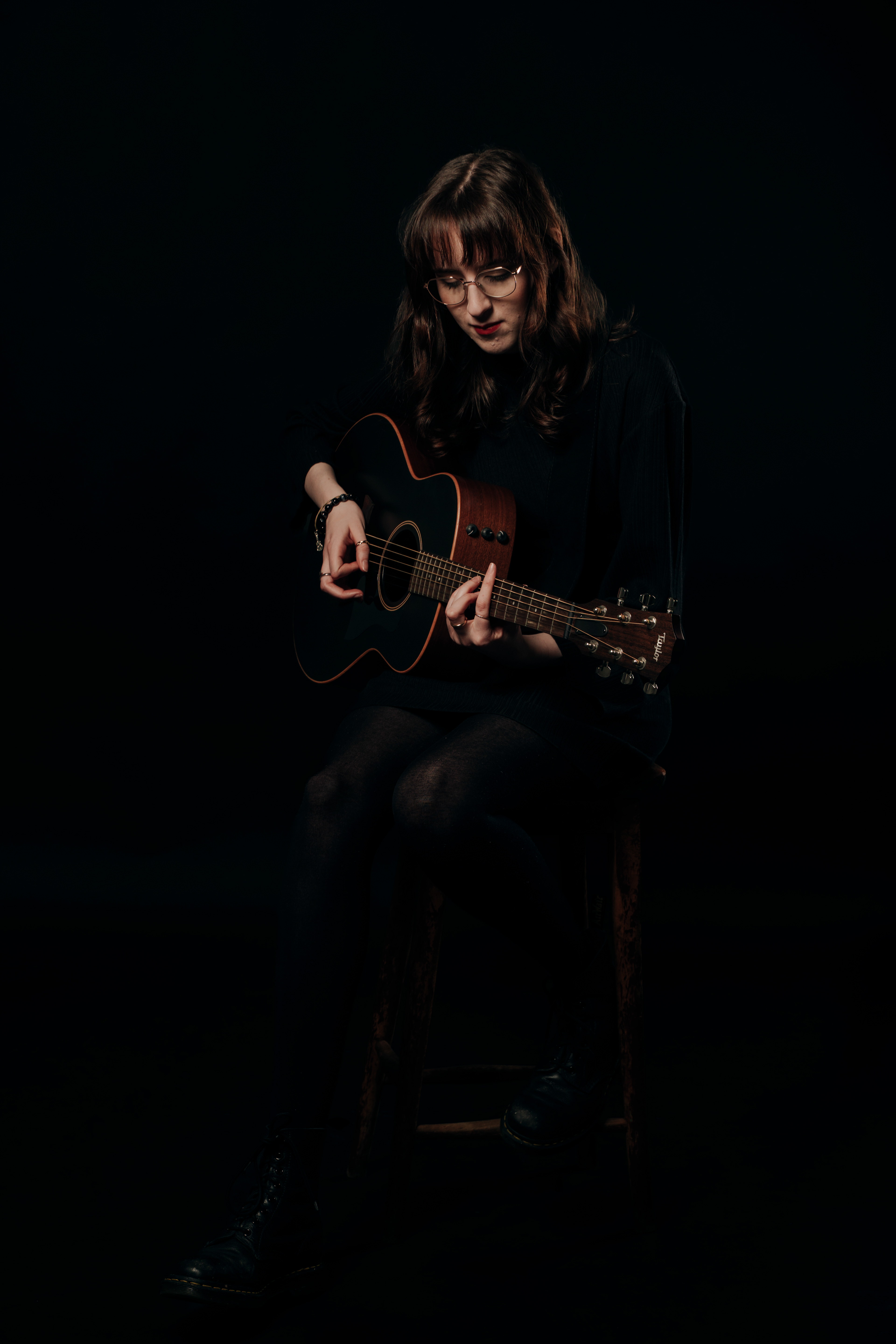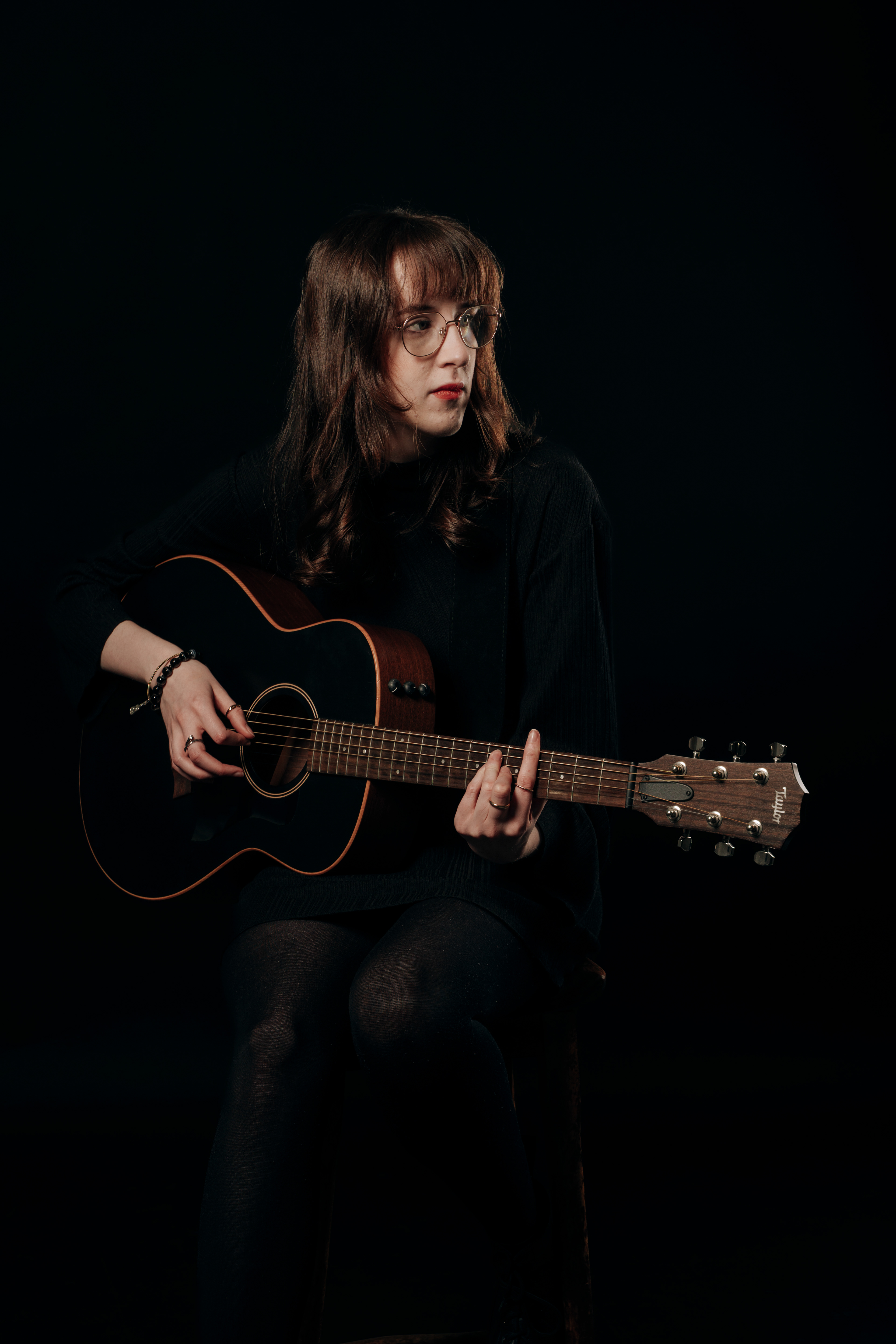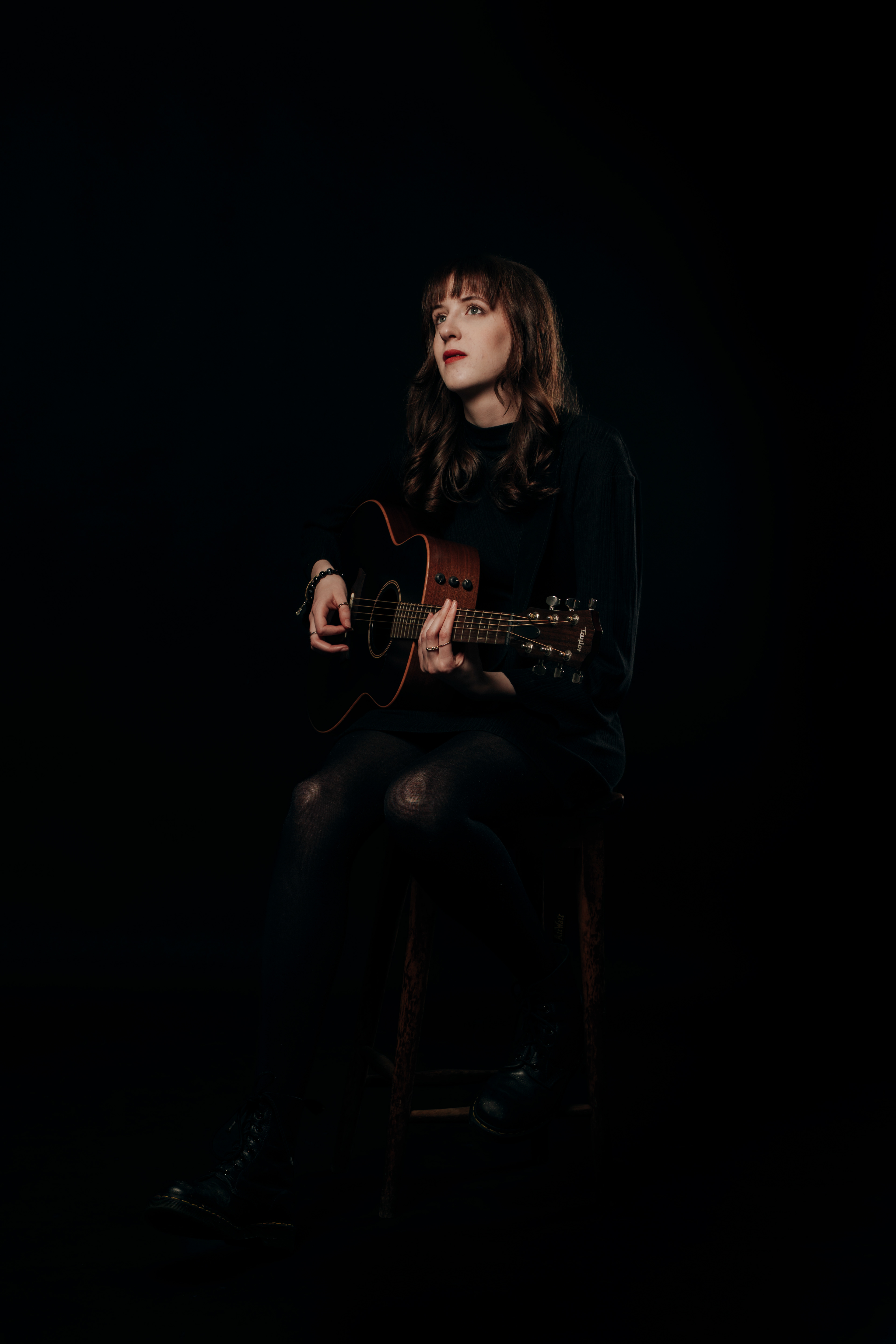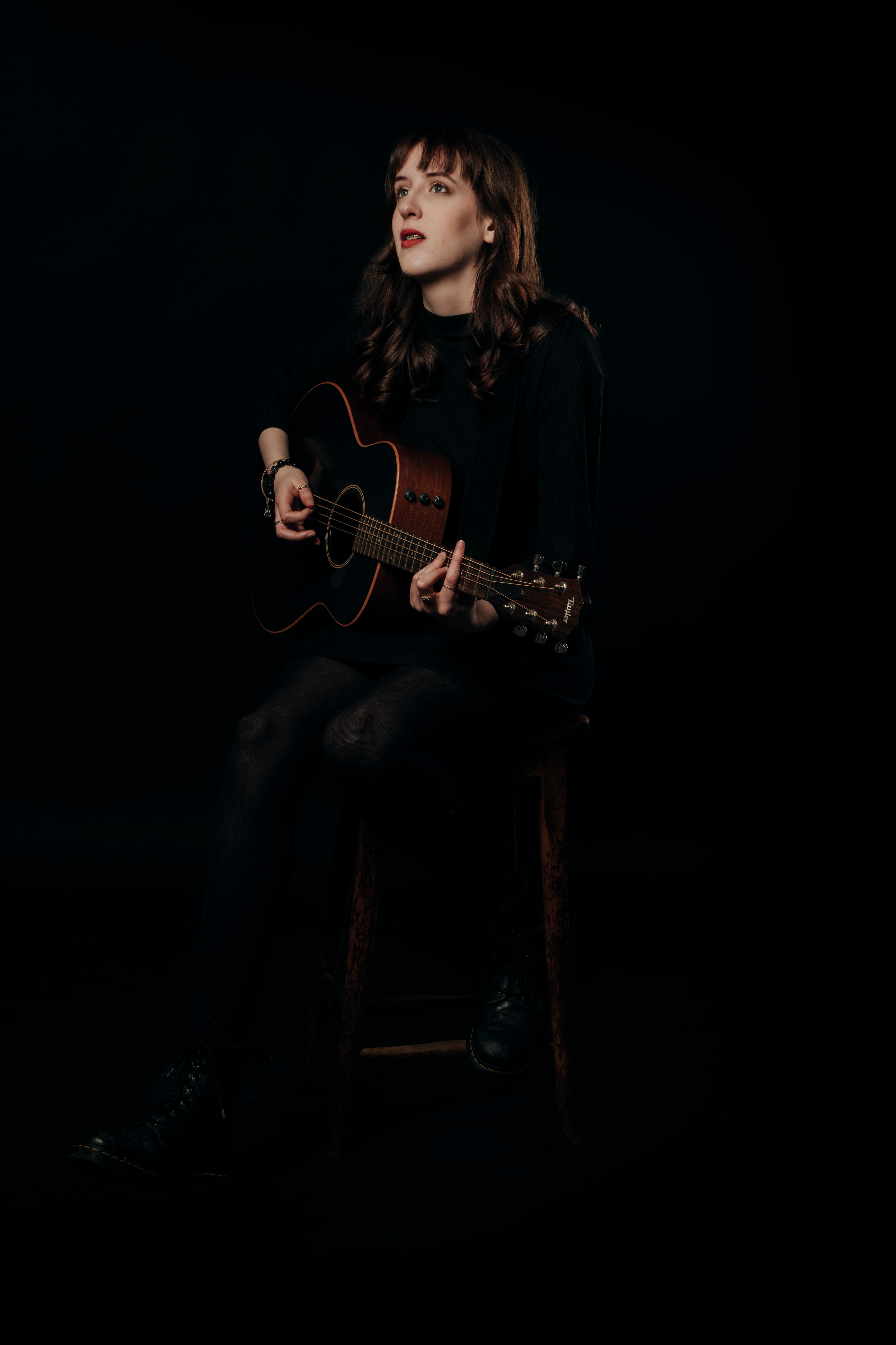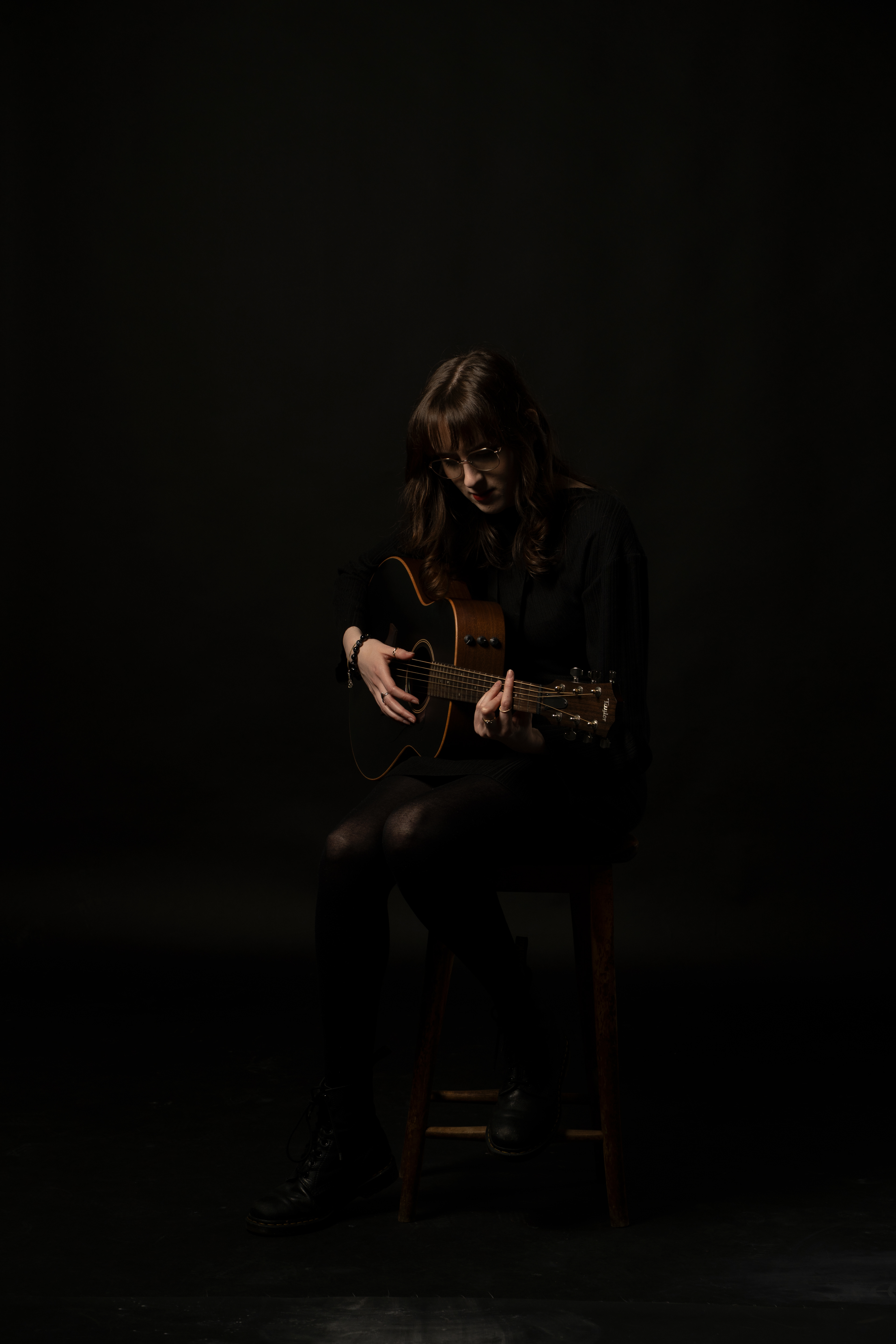 The third image shows the model looking towards the light with the guitar going behind her hair still showing the neck. This is a photo to purely show the subject but the guitar is kept in to remember the context and as the point is still advertising it is in the image subtly. This image has the light falling directly onto the subjects face unlike the last two which creates a beauty effect. the subject however still looks sad which brings could be because the gothic elements of the bats are still in the photo and because in this scene she is a female rockstar who often sing about depressing themes so this could be her brand. Keeping this sad brand and juxtaposing it with the first image brings another comedic value to the first image as it makes it even more clear to the viewer that she was asked to pose like that as it doesn't seem like something she would usually do with the other 2 images contexts.
