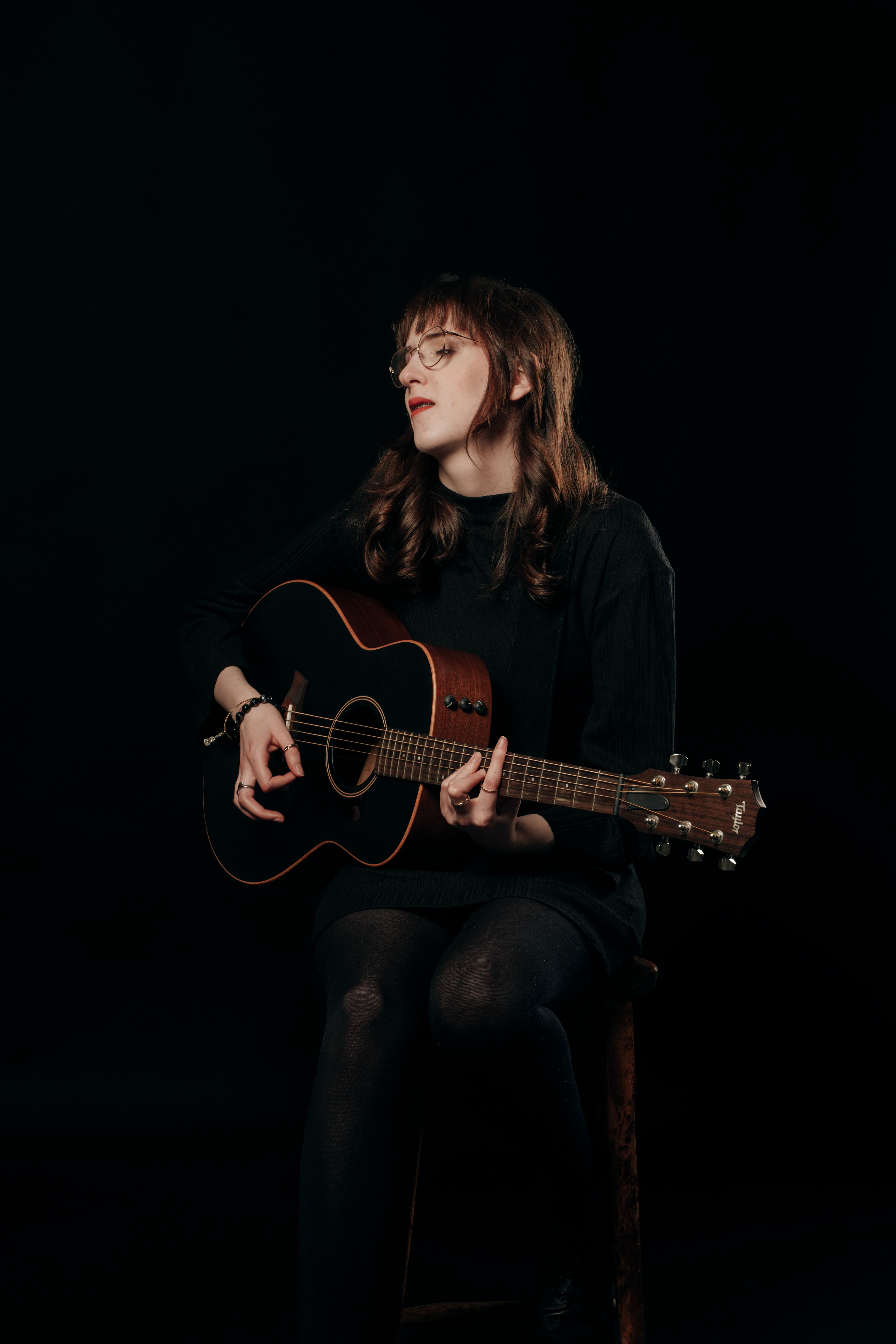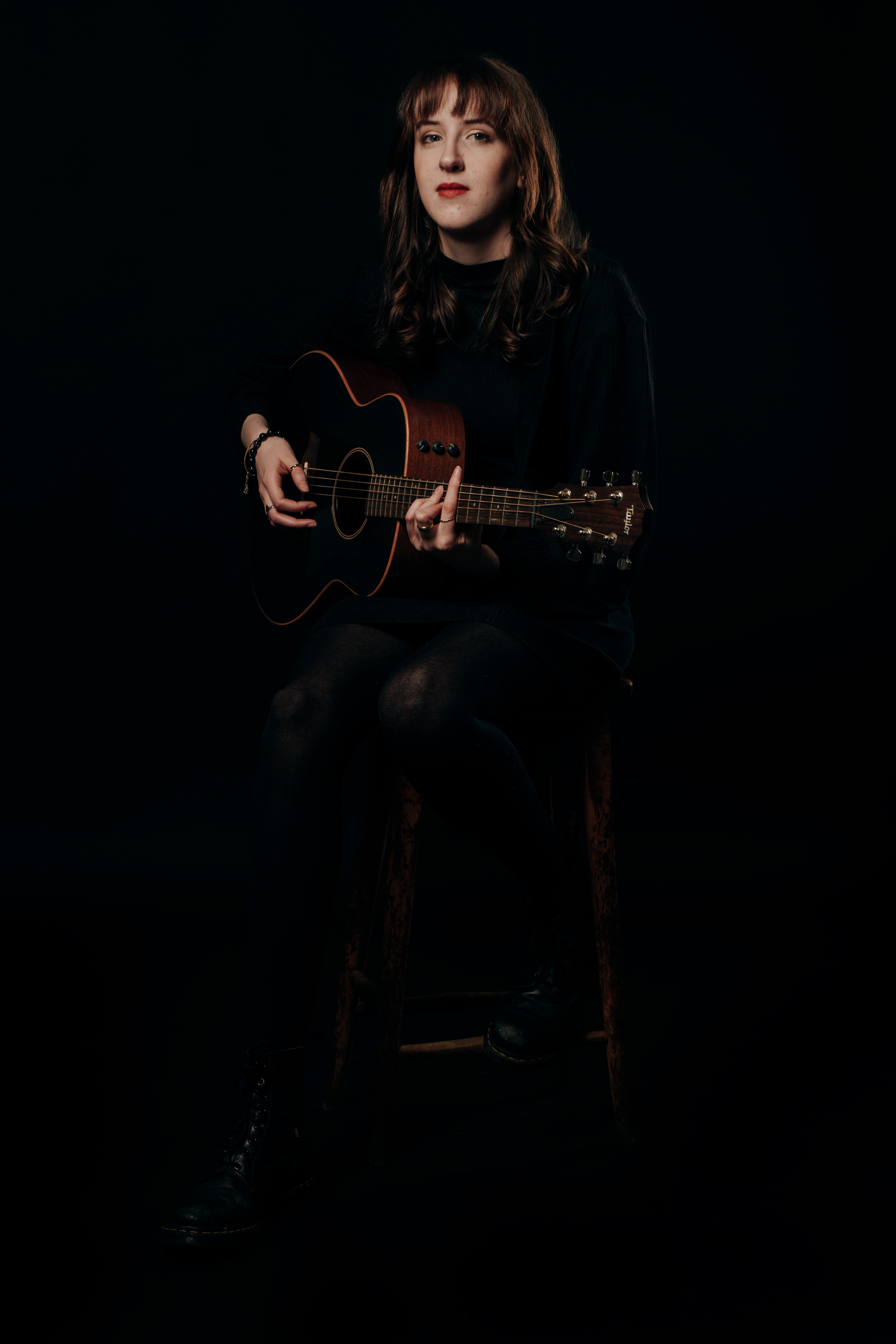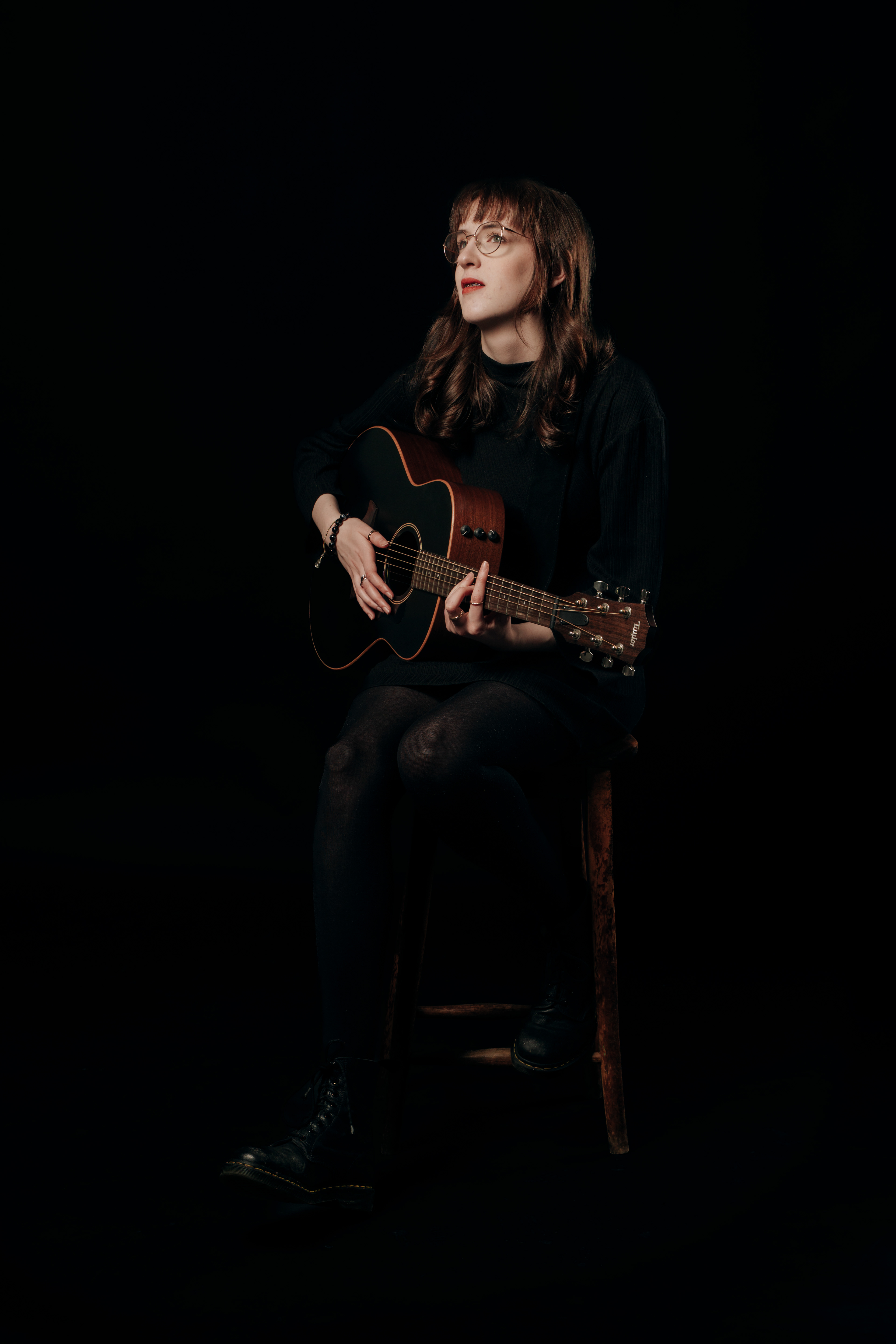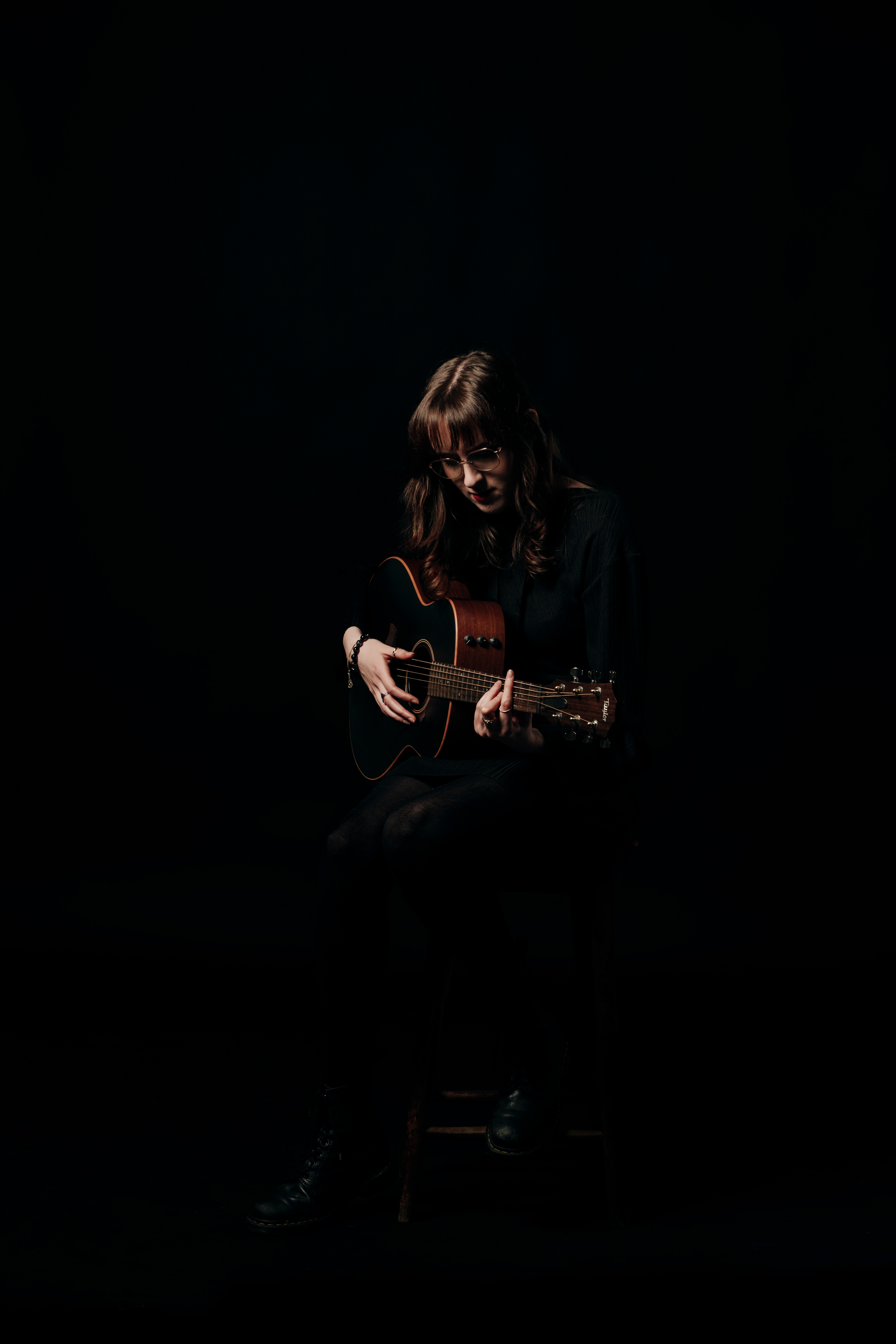 The third image shows the model looking towards the light with the guitar going behind her hair still showing the neck. This is a photo to purely show the subject but the guitar is kept in to remember the context and as the point is still advertising it is in the image subtly. This image has the light falling directly onto the subjects face unlike the last two which creates a beauty effect. the subject however still looks sad which brings could be because the gothic elements of the bats are still in the photo and because in this scene she is a female rockstar who often sing about depressing themes so this could be her brand. Keeping this sad brand and juxtaposing it with the first image brings another comedic value to the first image as it makes it even more clear to the viewer that she was asked to pose like that as it doesn't seem like something she would usually do with the other 2 images contexts.