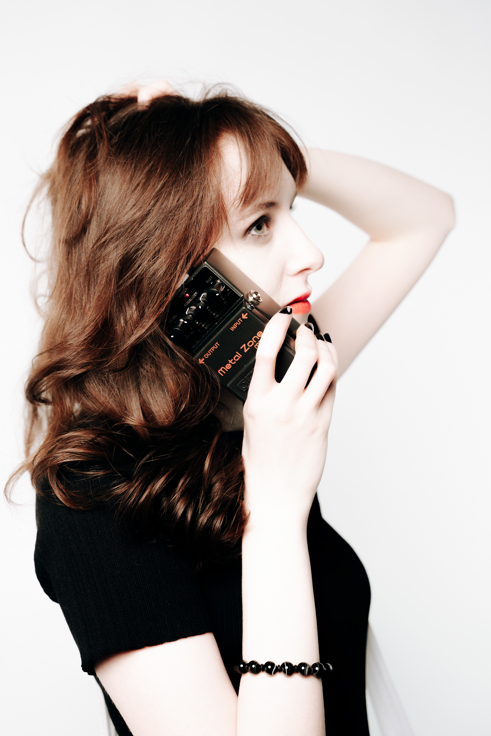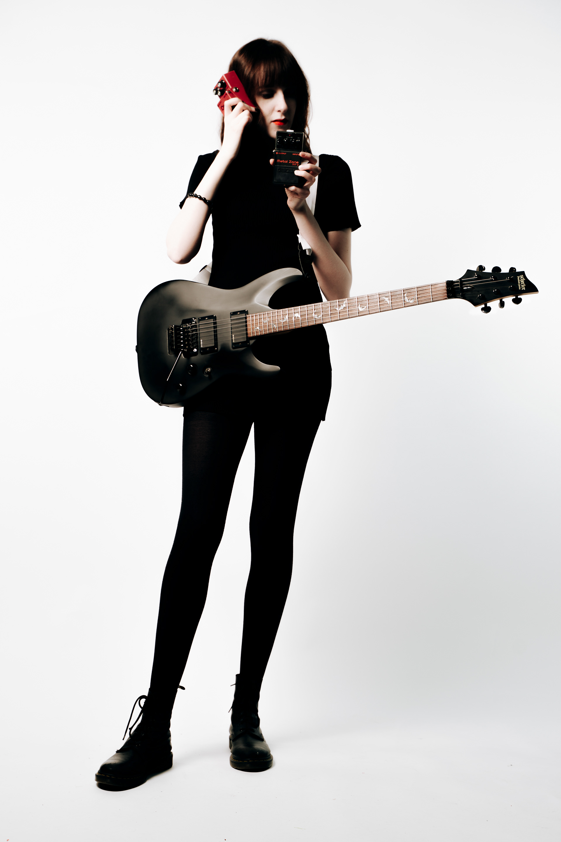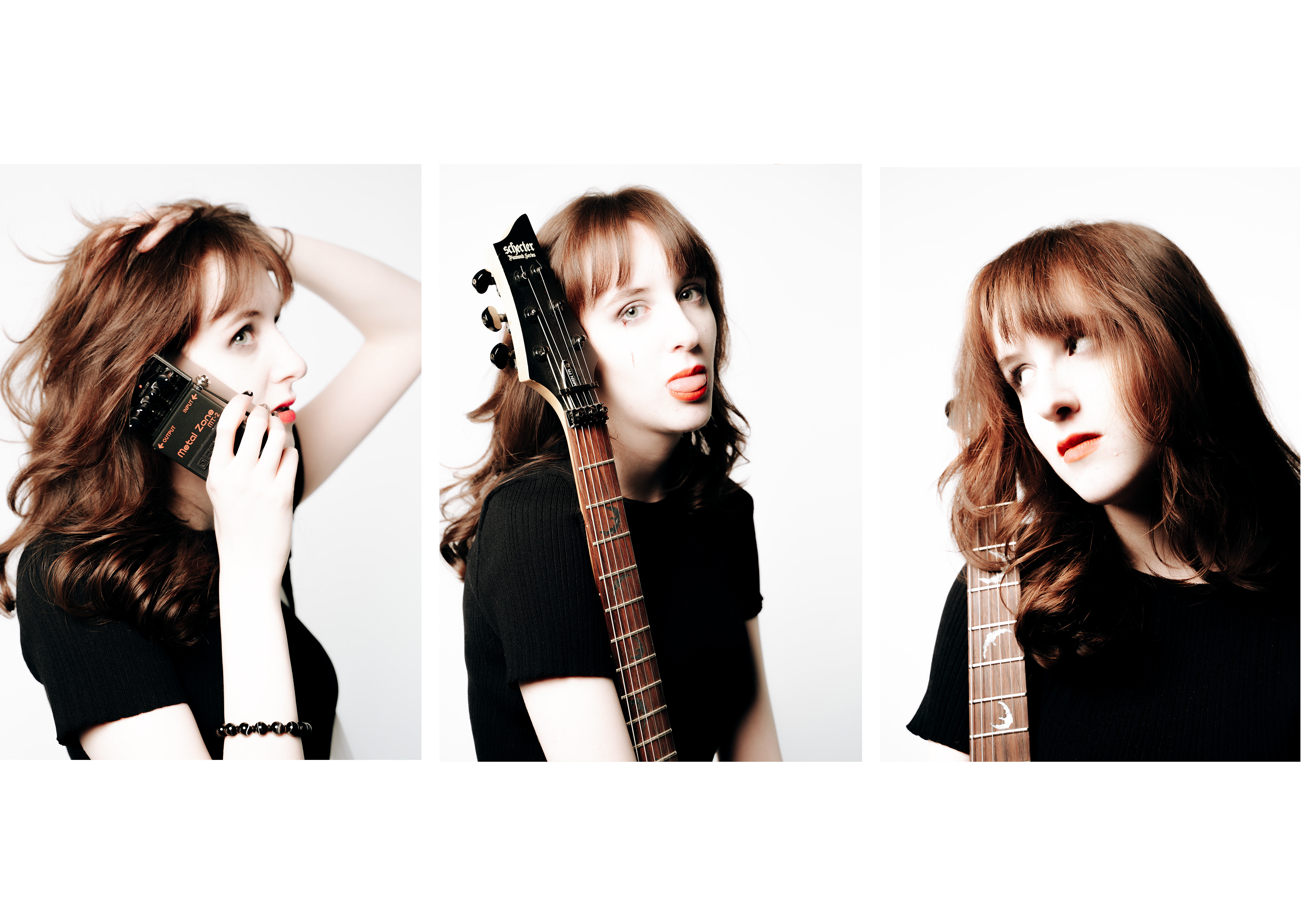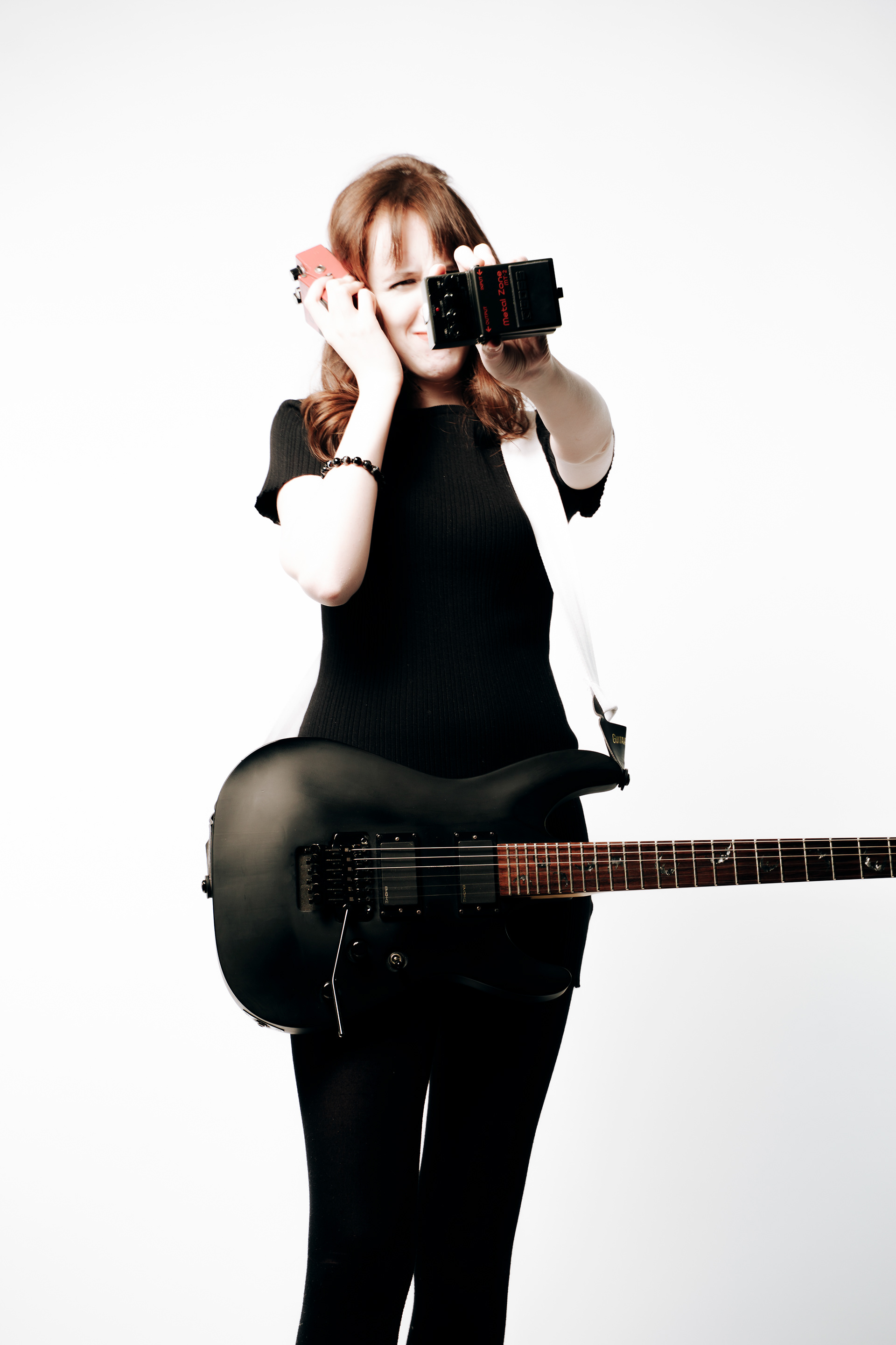I decided to go for a completely contrasting look with this set of images and aimed for a "pop punk" kind of style. My idea was to try and create a rockstar who is doing a promotional shoot for her signature guitar items. This is common in the music industry- often popular guitarists will have brand deals with pedal and guitar brands as they sell well because people buy to be able to sound like their favourite artists. this shoot was intended to be a joint shoot between Boss, the pedal brand, and schecter, the guitar brand- working together to use the artist to sell the products together. I took these photos on a white background and overexposed to get a high-key distinct look which I desired to replicate the early 2000s atheistic with female artists often being portrayed as extremely pale. In editing I crushed the shadows down to remove details from the dress and attempt to make it look solid black as well as bringing the highlights near to the top to create a very contrasty image - feeling like black and white in the portions away from the face. doing this also creates a doll like effect through removing any blemishes or detail in the skin which was often popular around the time. I experimented with classic rockstar poses like the reaching forward hands and and the first 3 images before moving into more casual marketing positions showing off the gear alongside the model. I am happier with this set than the last one as I feel they are less generic and as far as I can see, using the guitar pedal like you'd hold a phone has never been done in a photoshoot before. I feel these images are more exciting than my first shoot with the editing style and posing being more unique and eye catching. During this shoot I used a 28-75mm f2.8 and stuck around f.3.5-f.5.6 which brough some blur into the image and helped the background stay clear white at such short focal lengths. I used the whole range of the lens through this set, experimenting with somewhat fisheye images but for the final images they are all taken towards the telephoto side of the lens.