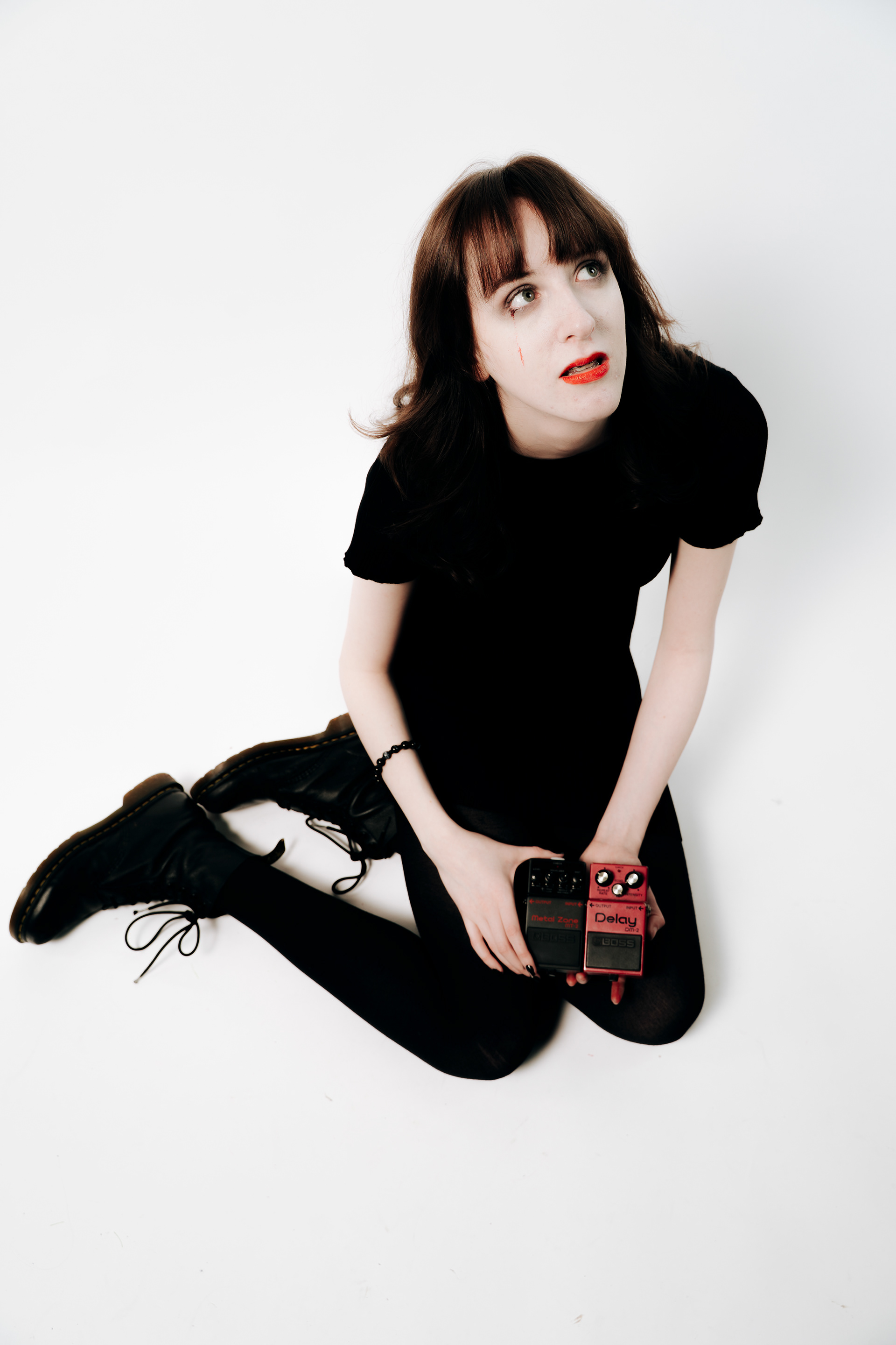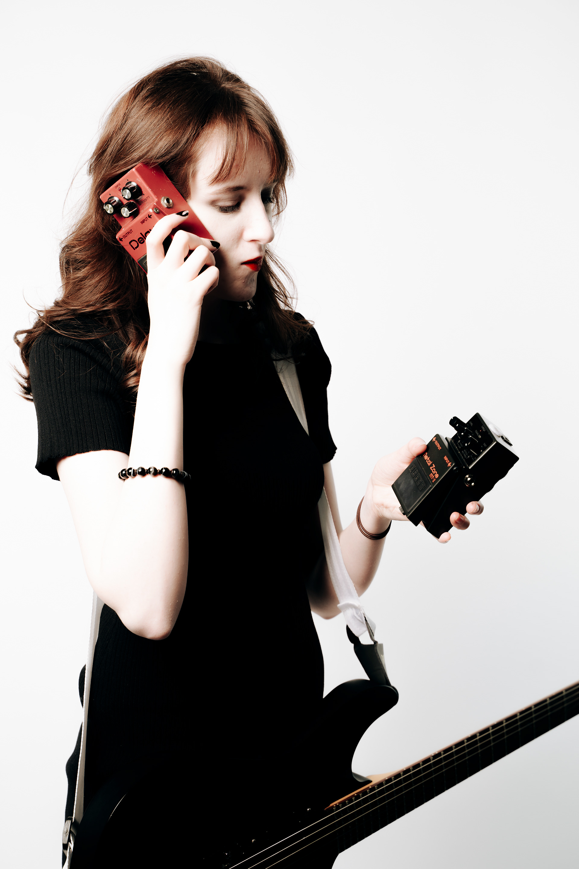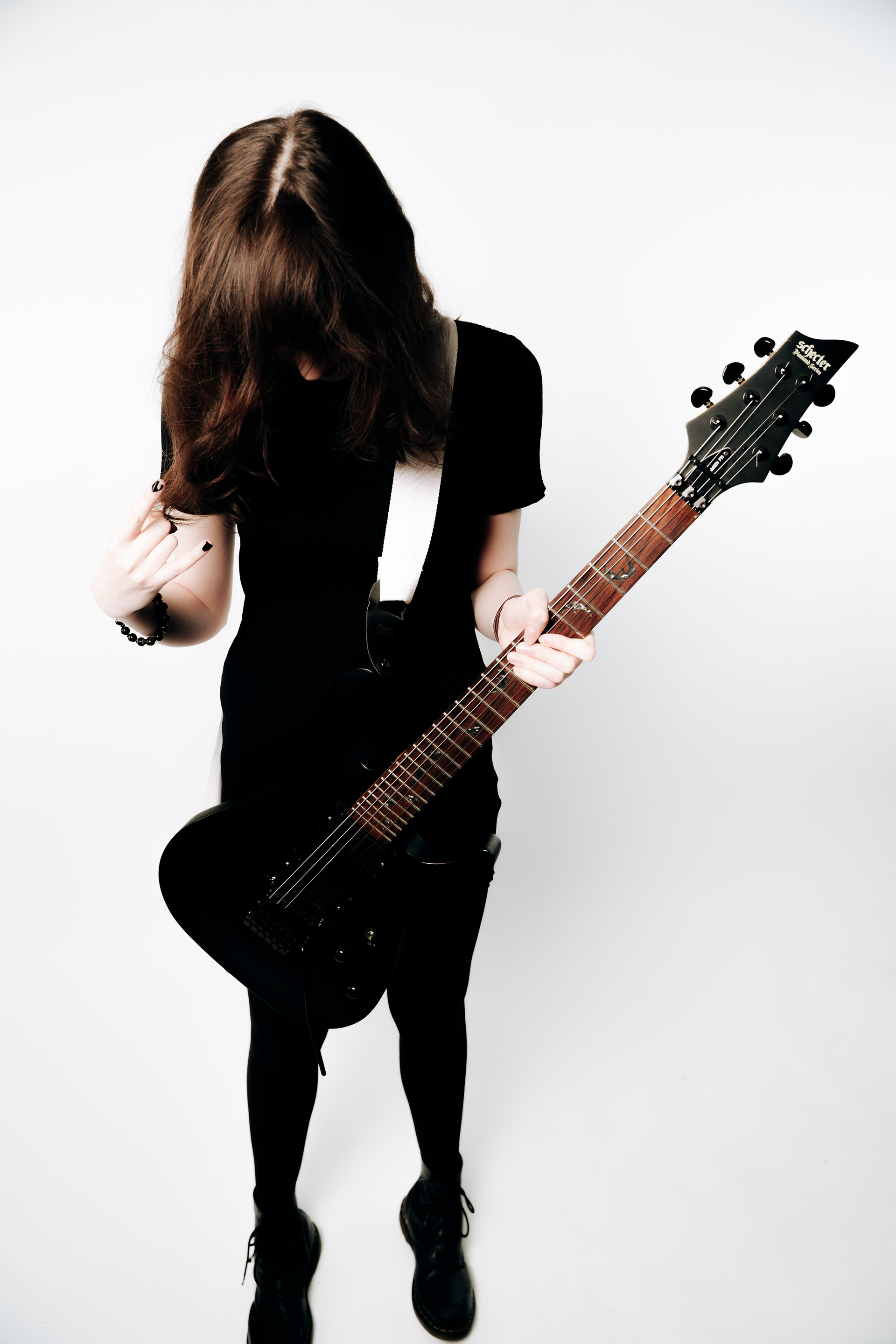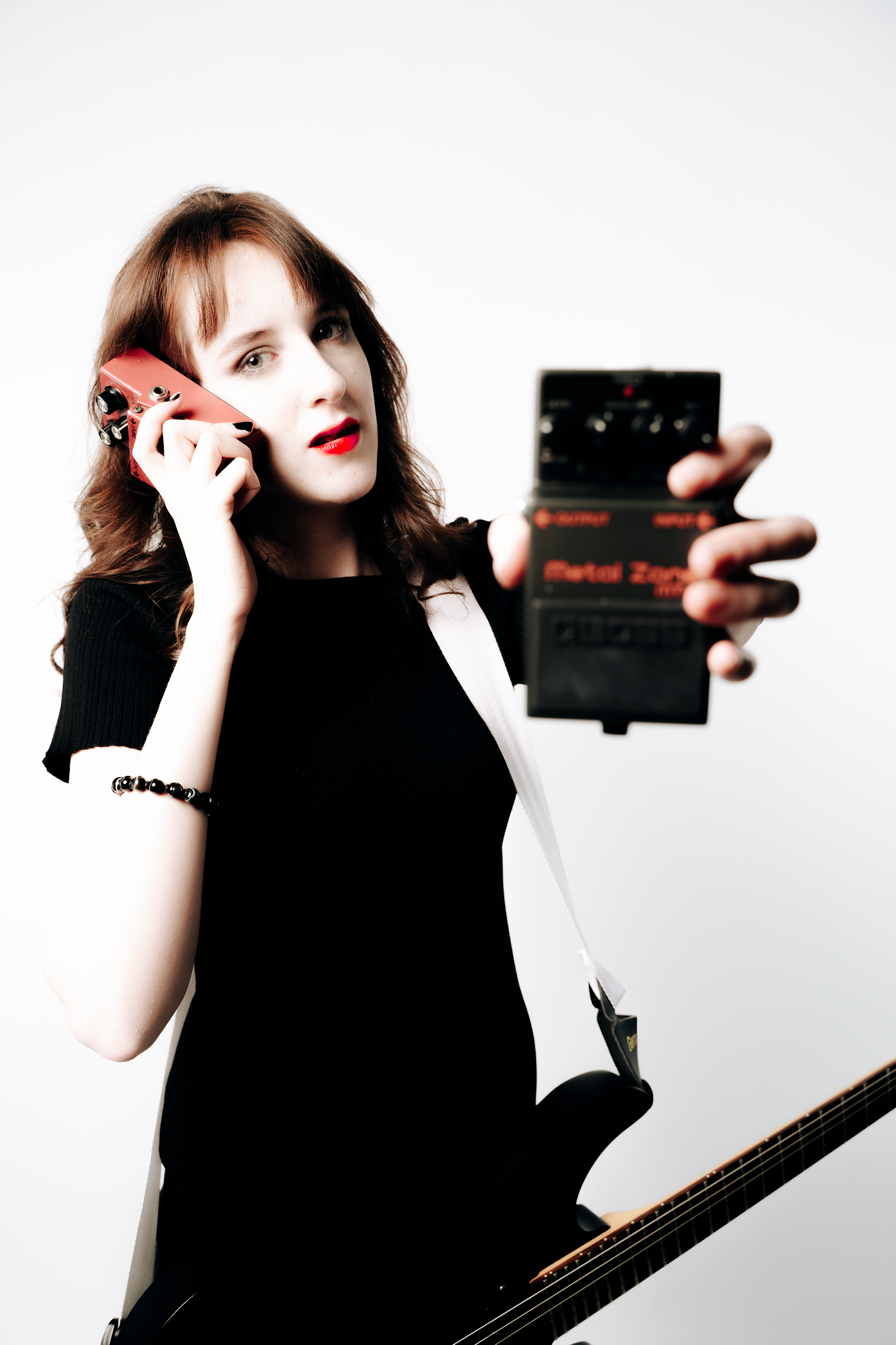 I decided to go for a completely contrasting look with this set of images and aimed for a "pop punk" kind of style. My idea was to try and create a rockstar who is doing a promotional shoot for her signature guitar items. This is common in the music industry- often popular guitarists will have brand deals with pedal and guitar brands as they sell well because people buy to be able to sound like their favourite artists. this shoot was intended to be a joint shoot between Boss, the pedal brand, and schecter, the guitar brand- working together to use the artist to sell the products together. I took these photos on a white background and overexposed to get a high-key distinct look which I desired to replicate the early 2000s atheistic with female artists often being portrayed as extremely pale. In editing I crushed the shadows down to remove details from the dress and attempt to make it look solid black as well as bringing the highlights near to the top to create a very contrasty image - feeling like black and white in the portions away from the face. doing this also creates a doll like effect through removing any blemishes or detail in the skin which was often popular around the time. I experimented with classic rockstar poses like the reaching forward hands and and the first 3 images before moving into more casual marketing positions showing off the gear alongside the model. I am happier with this set than the last one as I feel they are less generic and as far as I can see, using the guitar pedal like you'd hold a phone has never been done in a photoshoot before. I feel these images are more exciting than my first shoot with the editing style and posing being more unique and eye catching. During this shoot I used a 28-75mm f2.8 and stuck around f.3.5-f.5.6 which brough some blur into the image and helped the background stay clear white at such short focal lengths. I used the whole range of the lens through this set, experimenting with somewhat fisheye images but for the final images they are all taken towards the telephoto side of the lens.