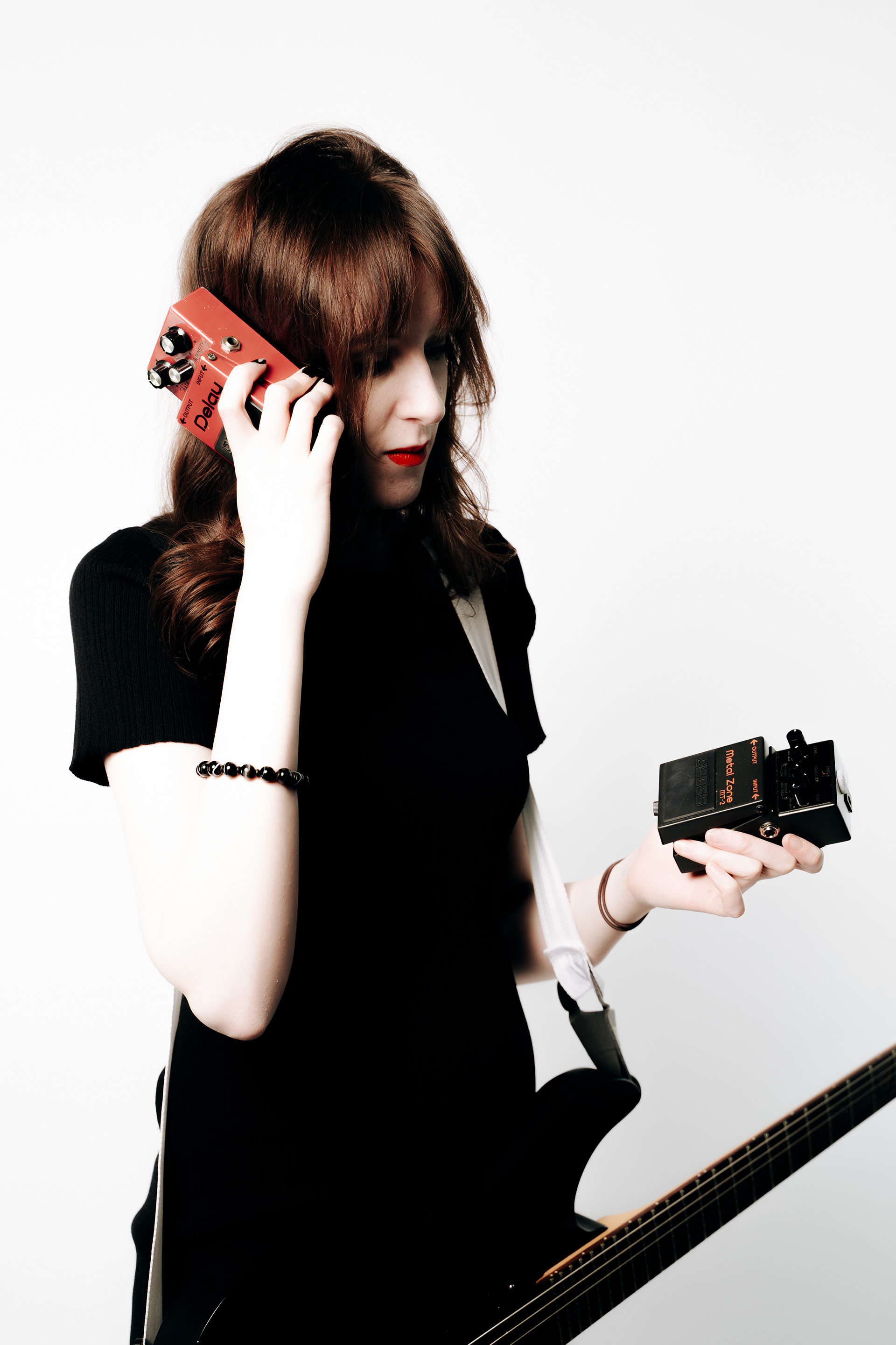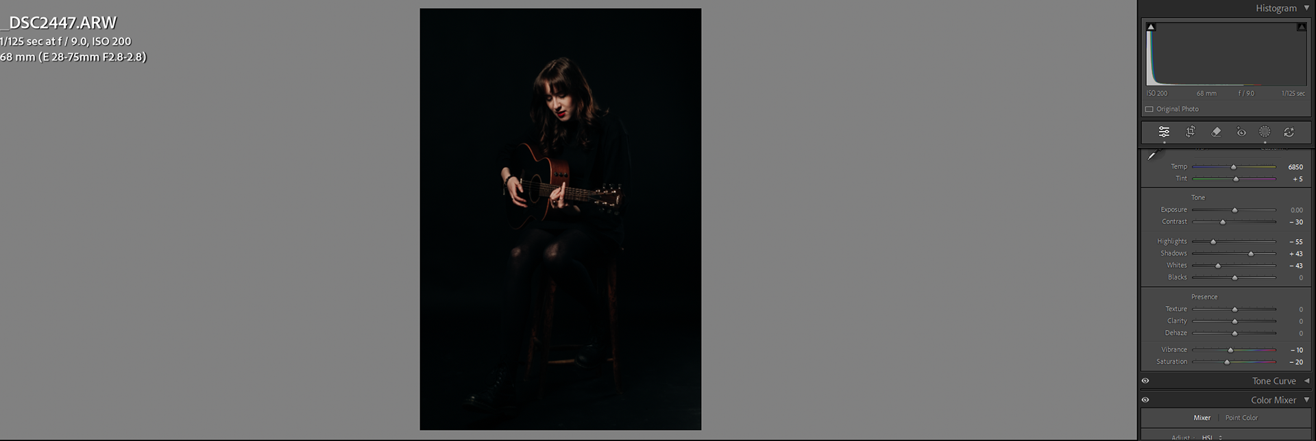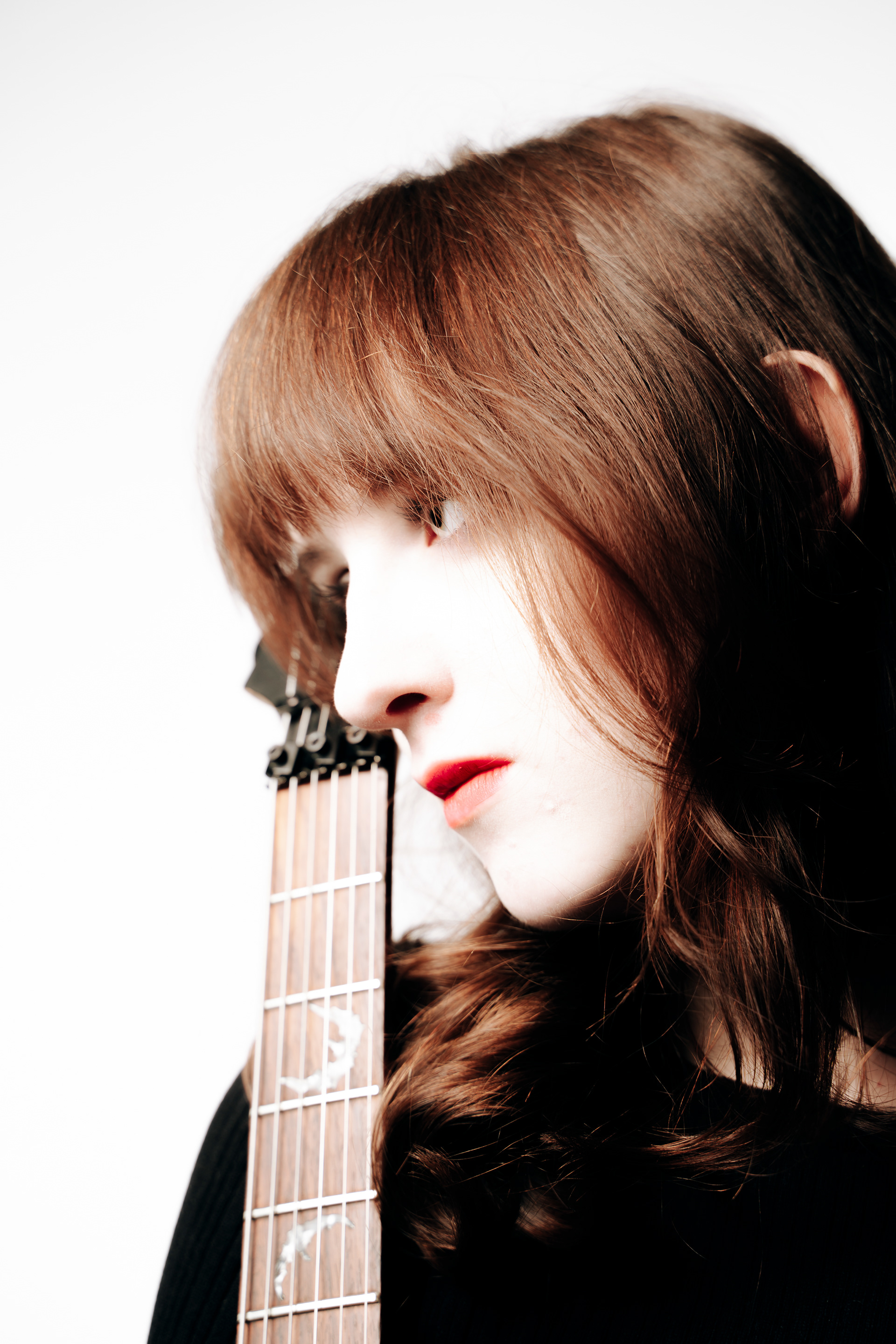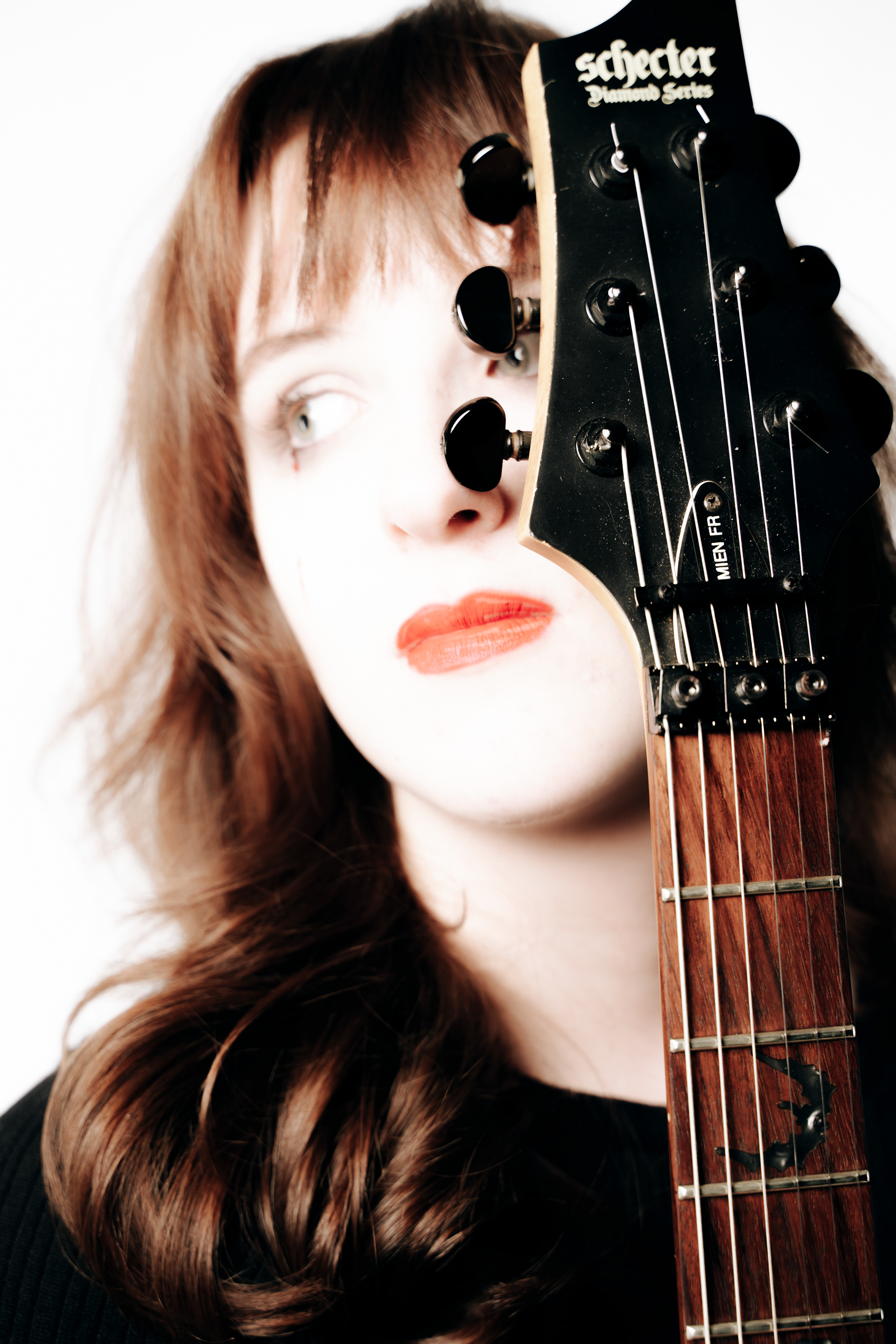All the photos were edited similarly in lightroom, using masking on the guitar neck to bring back any overexposed details such as the wood grain and the bat inlays, and masking the pedal to bring back details in the text and make sure it wasn't pure black, as well as saturation masking on the lips to make them pop more against the white in the face.