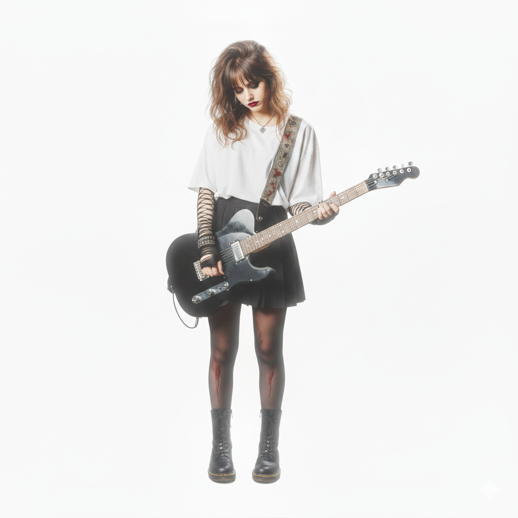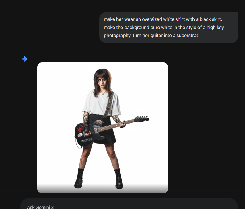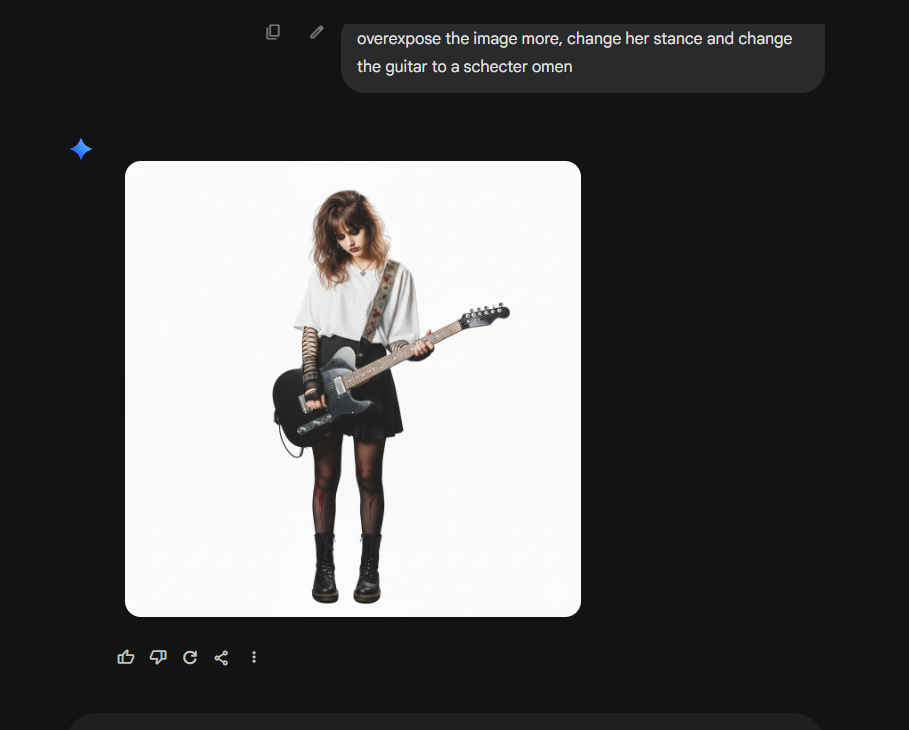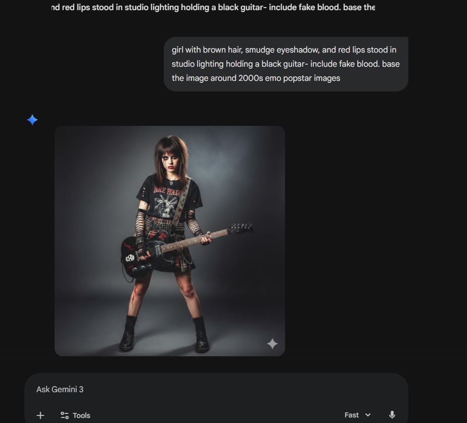 For the second shoot I am planning to use image 1 and 3 from the first set and create a middle image for these in a completely different style. As these images are trying to be album covers in a way I would like to create one of a more metal and emo vibe to sit in the middle showing versatility of the artist. The next shoot will feature an electric guitar in a high key lighting setup similar to 2000s popstars. I could not find an image for reference of this shoot so I went into Ai to build something which could similarly explain the image in my head. this is far from the perfect image in my head but it has given me a rough idea for how the lighting will work. Avril Lavigne's early photoshoots will be an inspiration for the lighting and basic premise.