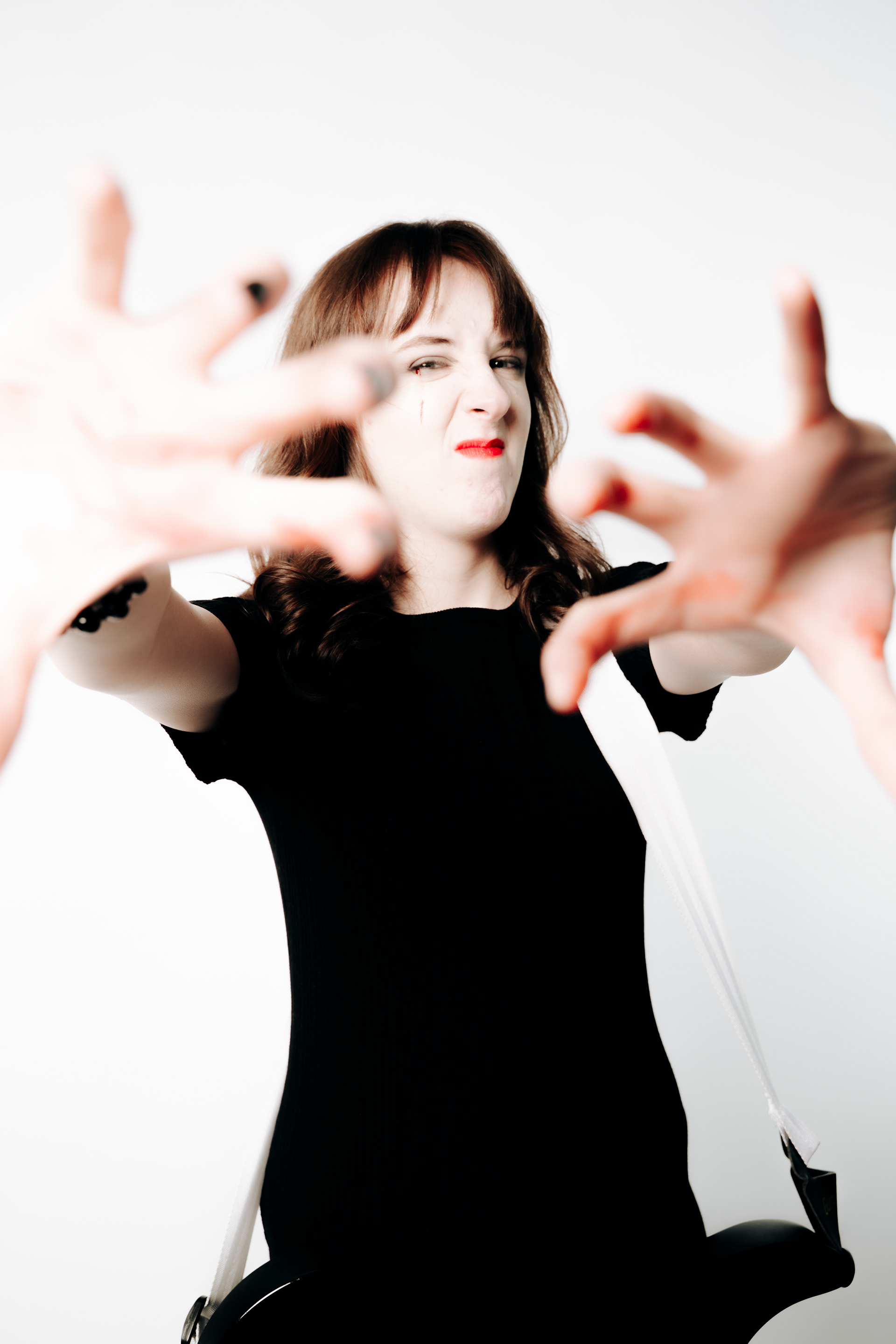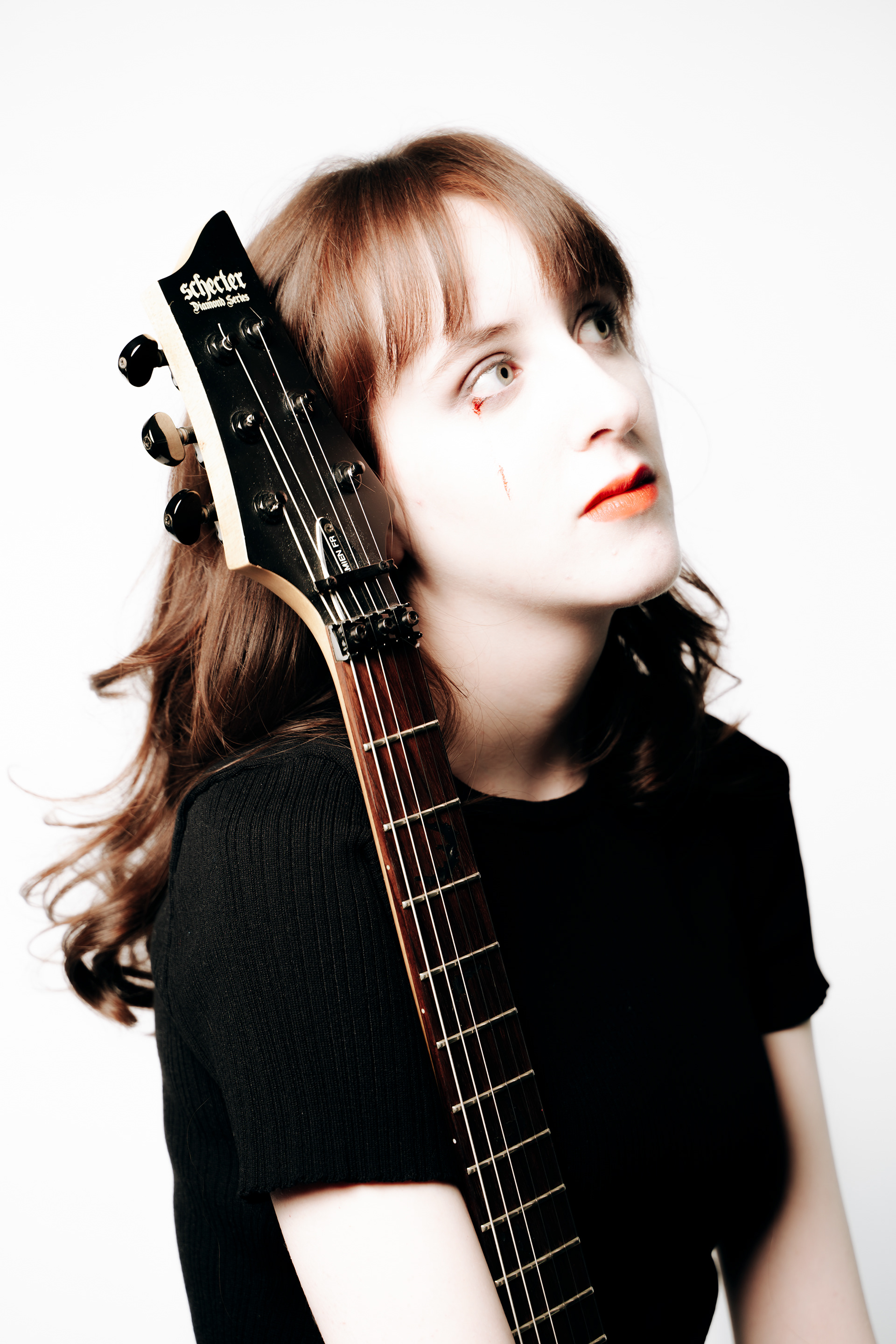 The second image shows the model posed with the guitar, she had fake blood under her eye dripping down in a tear formation and is sticking her tongue out which creates a juxtapositions of emotions- like the is pretending to be okay when she is not. this is further exemplified by the guitar which has bats on the inlay which is an inherently "gothic" feature- as well as the guitar and her dress being black- there is a gothic sense which is contradicted by seeing her tongue.