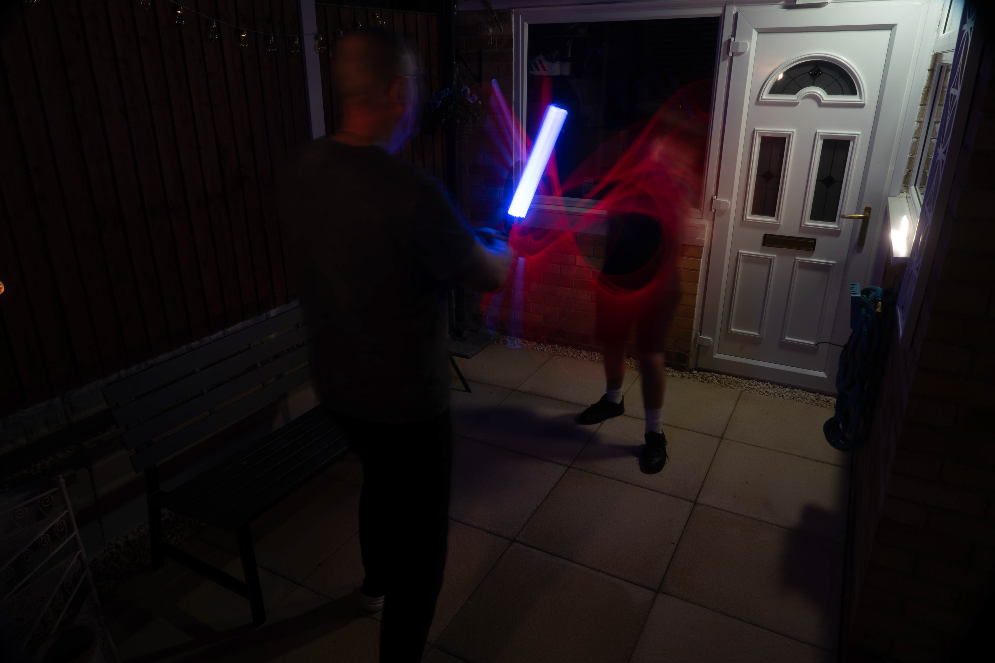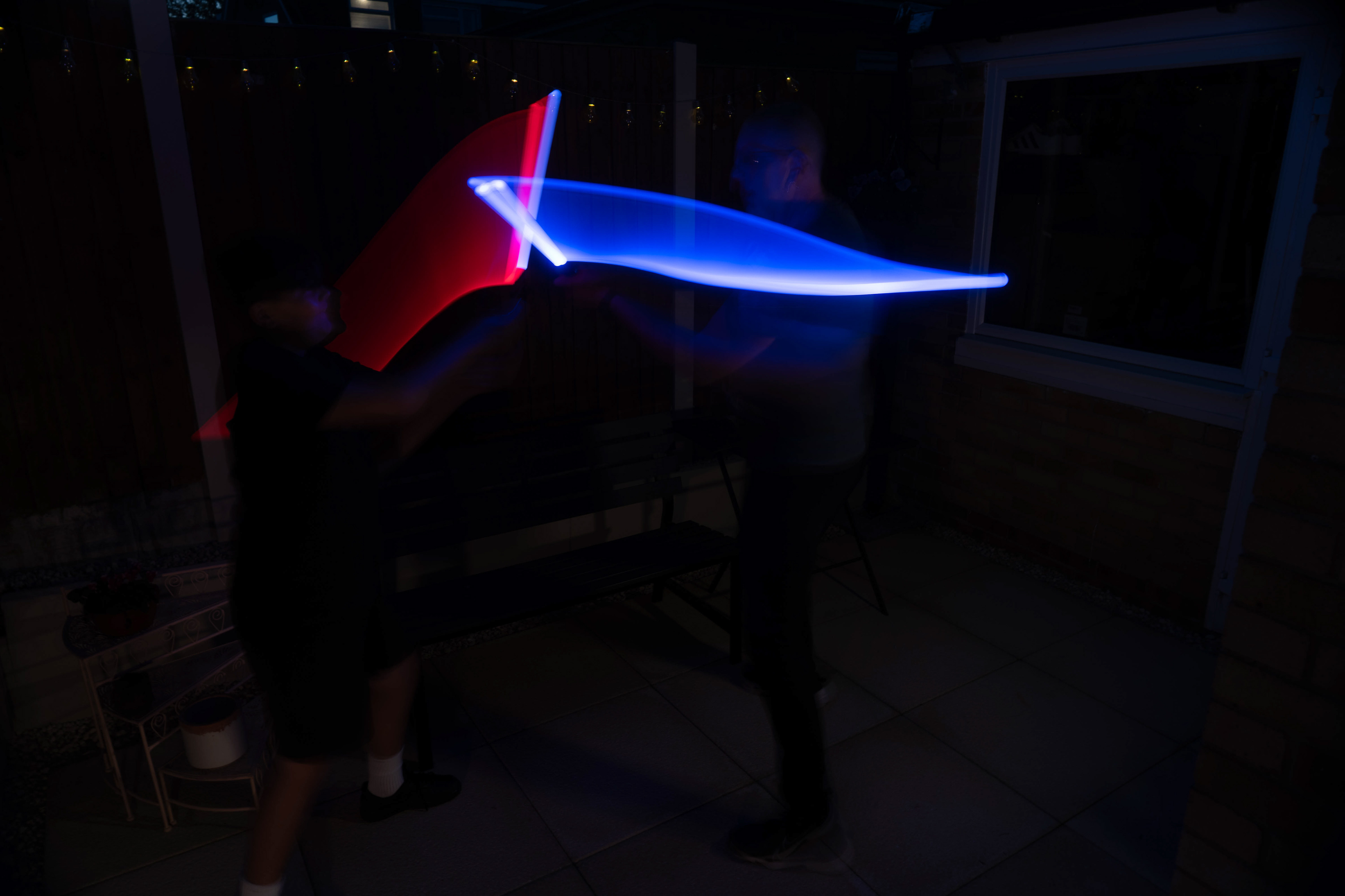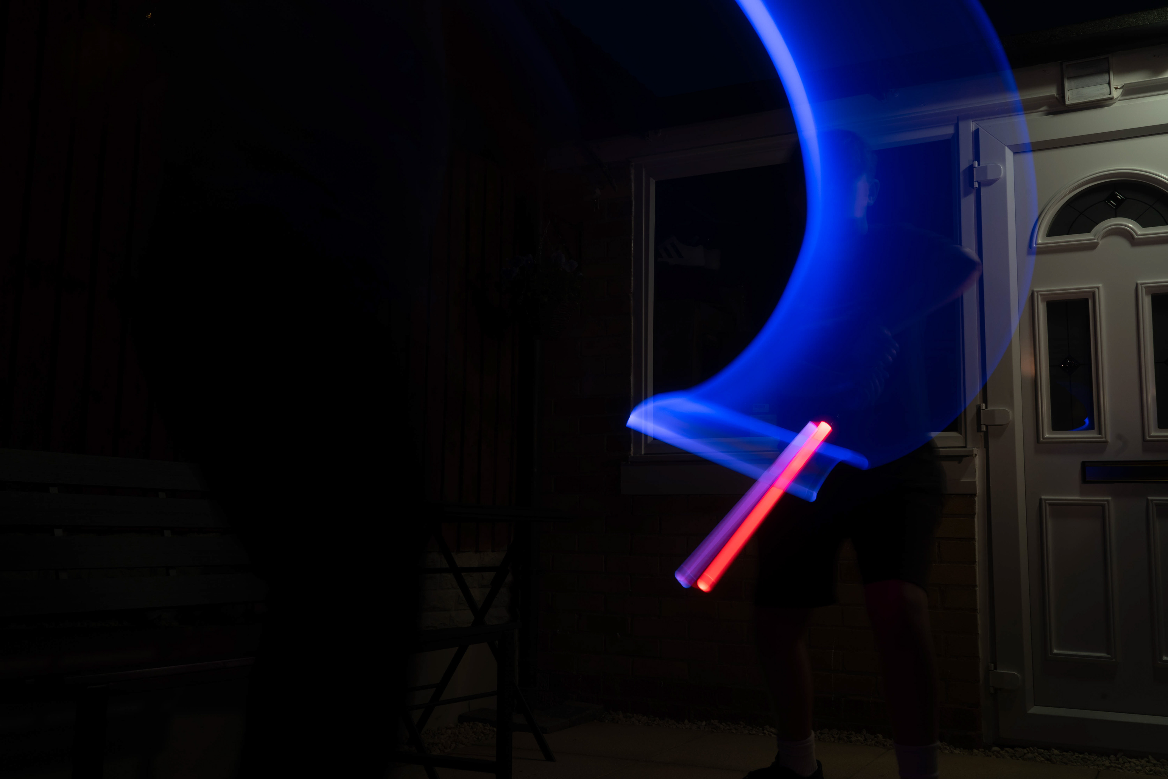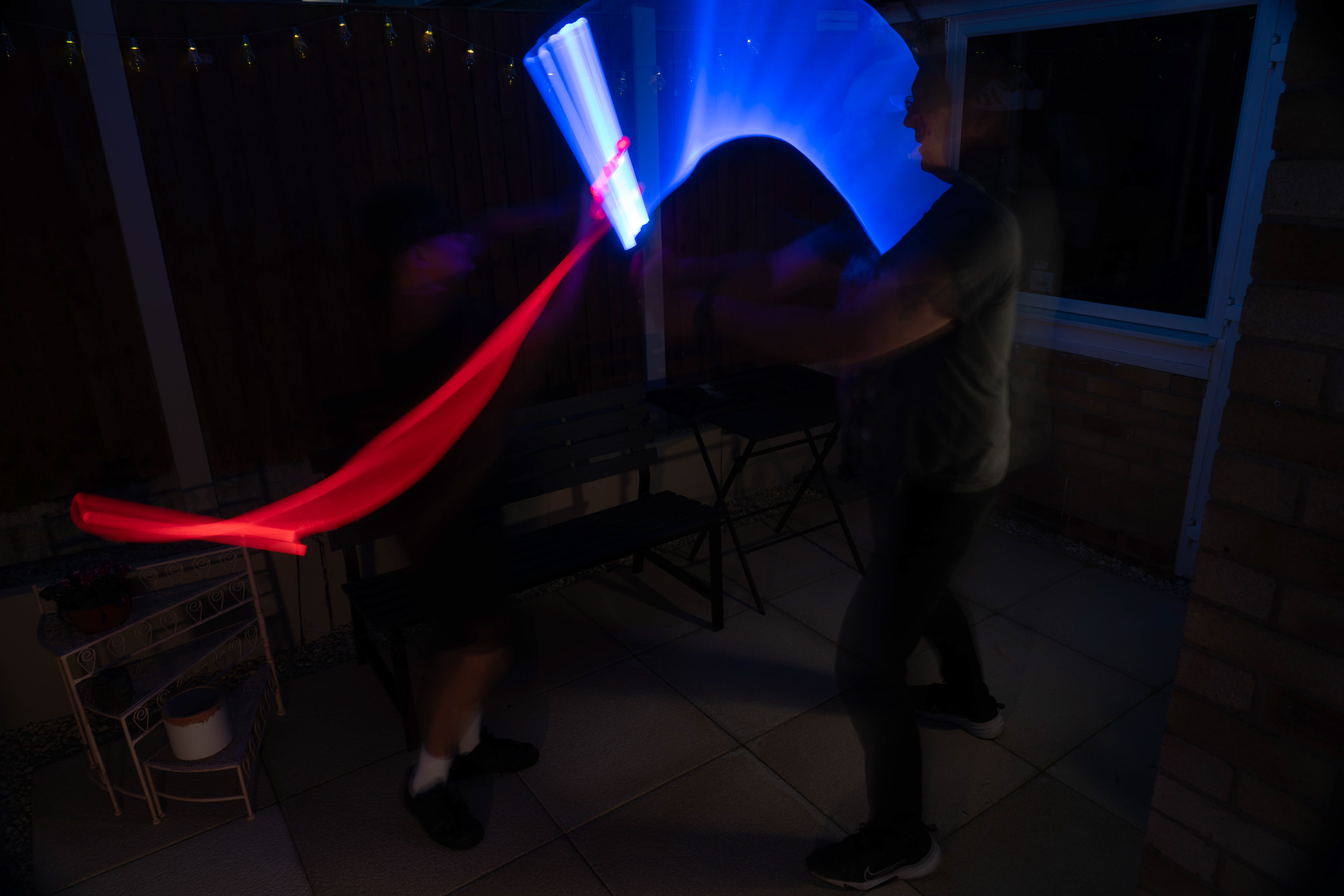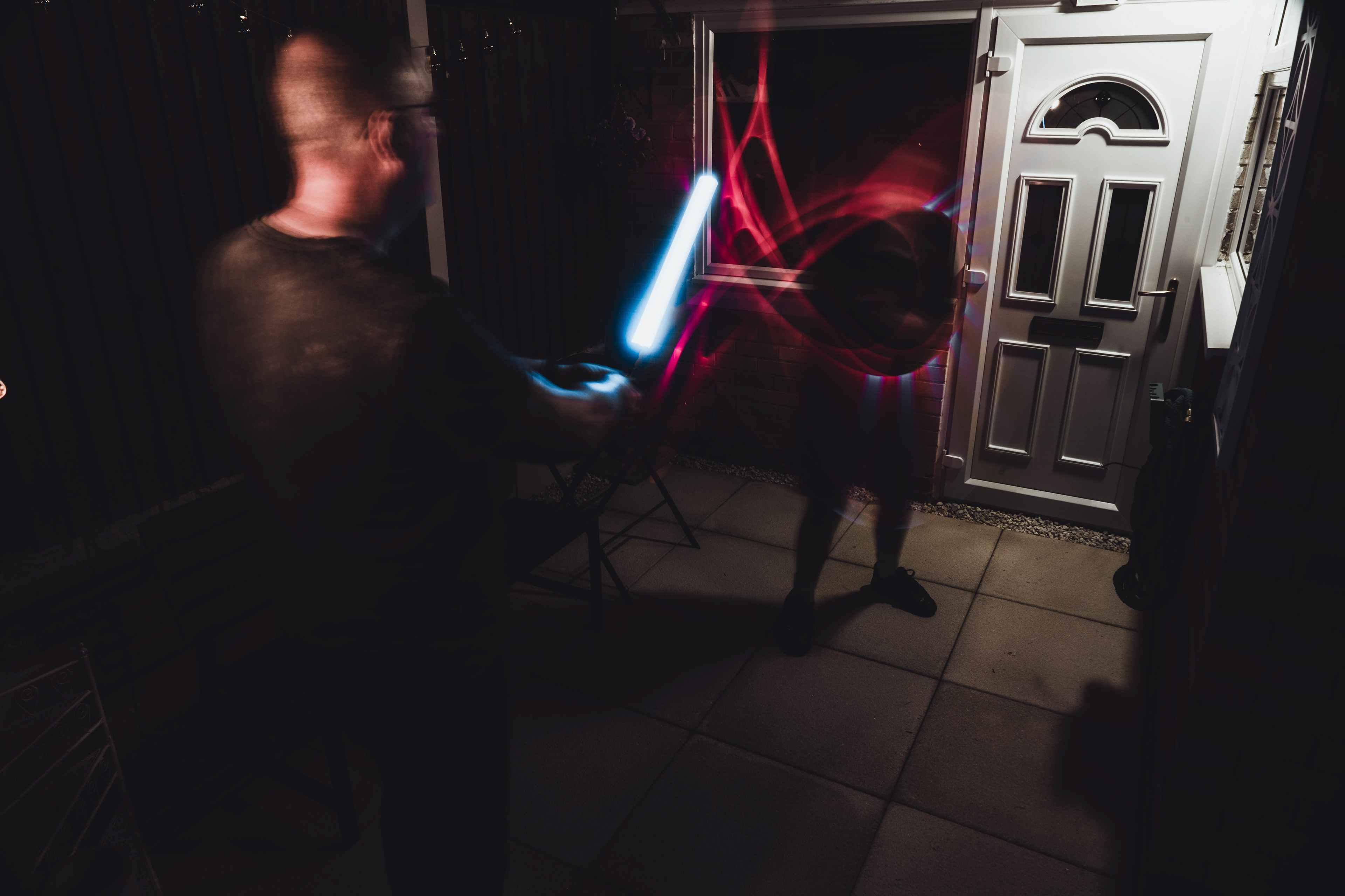 These images were taken in my back garden with my brother and dad. this is a series of images showing a fight scene inspired by star wars. all of these photos are taken on a long exposure time of around a second with lights placed camera left and right to light the subjects and surrounding area so that not only the lightsabers can be seen. the first image shows the start of the "fight" and shows the 2 subjects with their blades touching, this photo was taken on --1 second-- with the models slightly moving their lightsabers to create a wider effect of light- this is not a feature i will be using in future progressions of this as I feel it takes stability away from the photo. the red light from the lightsaber is hitting the subjects face illuminating him in a red shade which could be inferred as making him more "evil" in this situation, his elbow is also rim lit by the light behind. the subject camera right is lit a lot by a light off screen showing he is the "good" guy as he is not shrowded in darkness like the other.