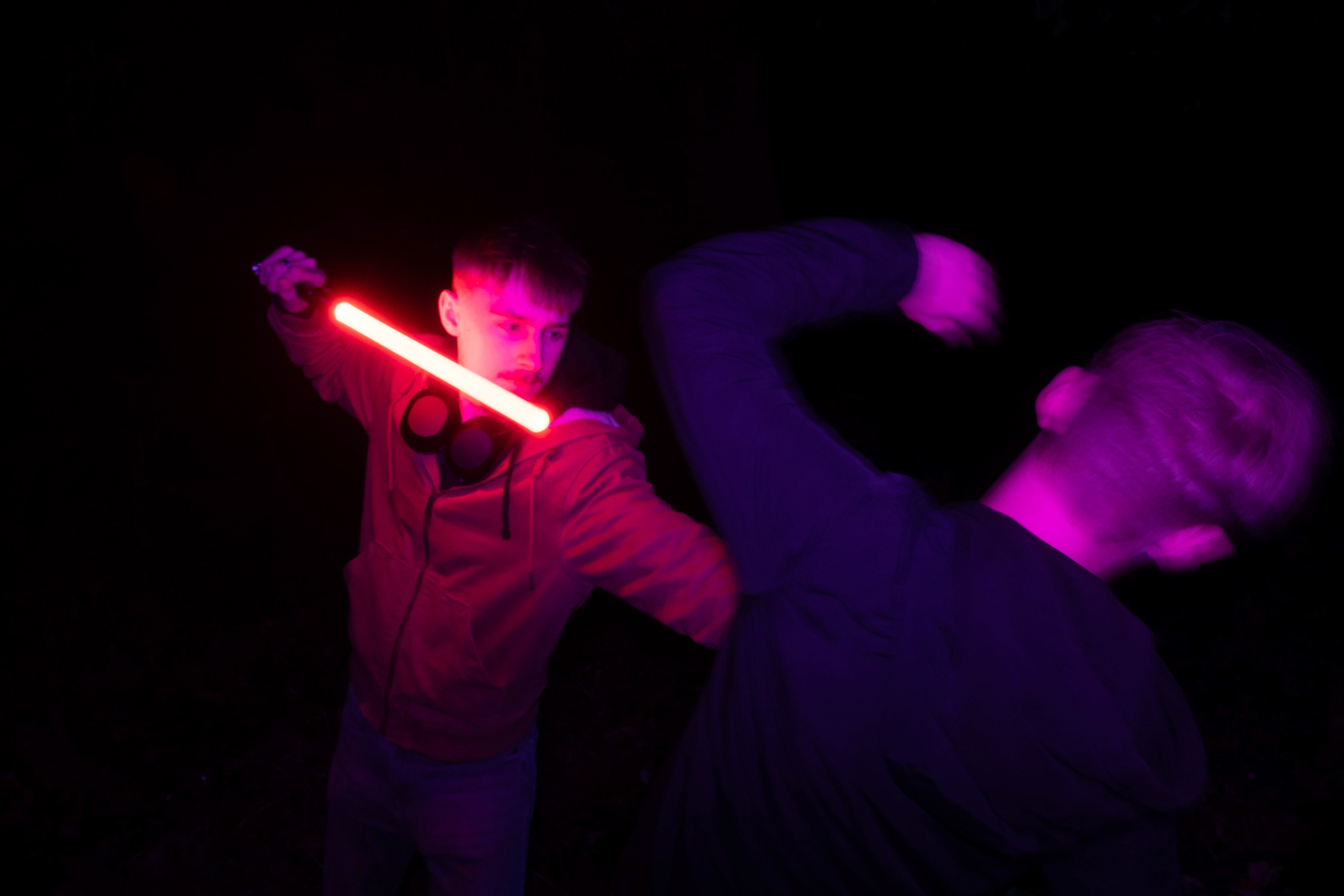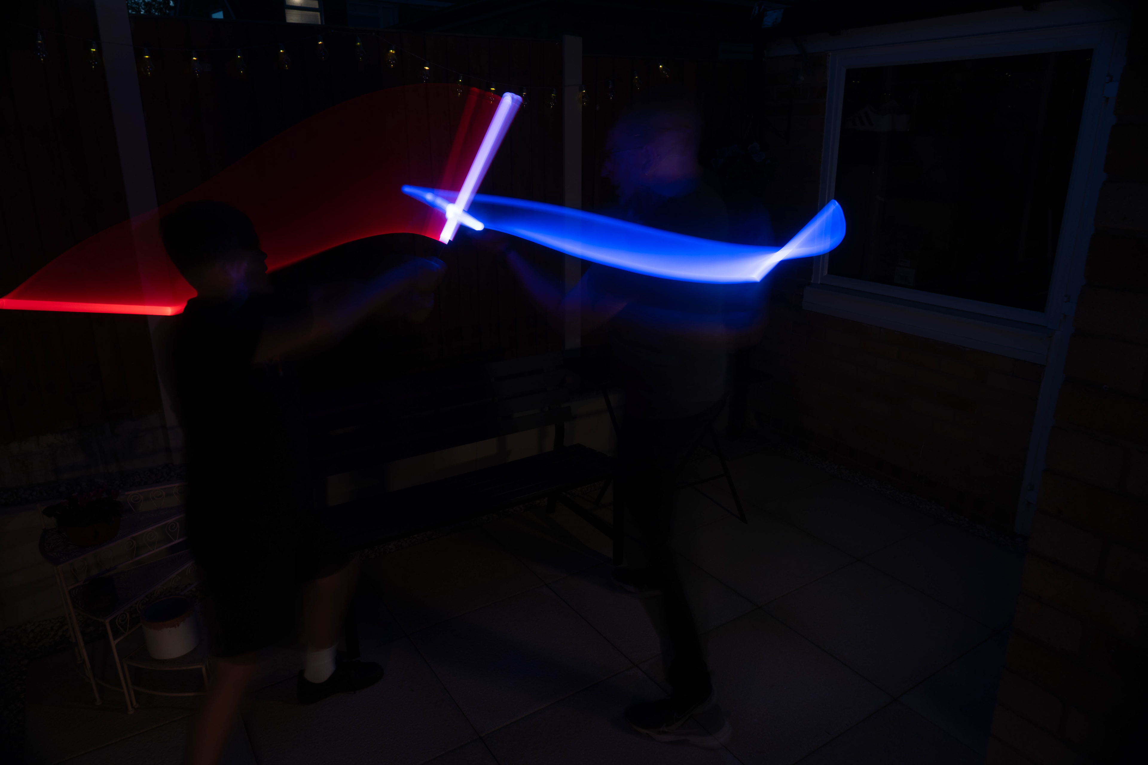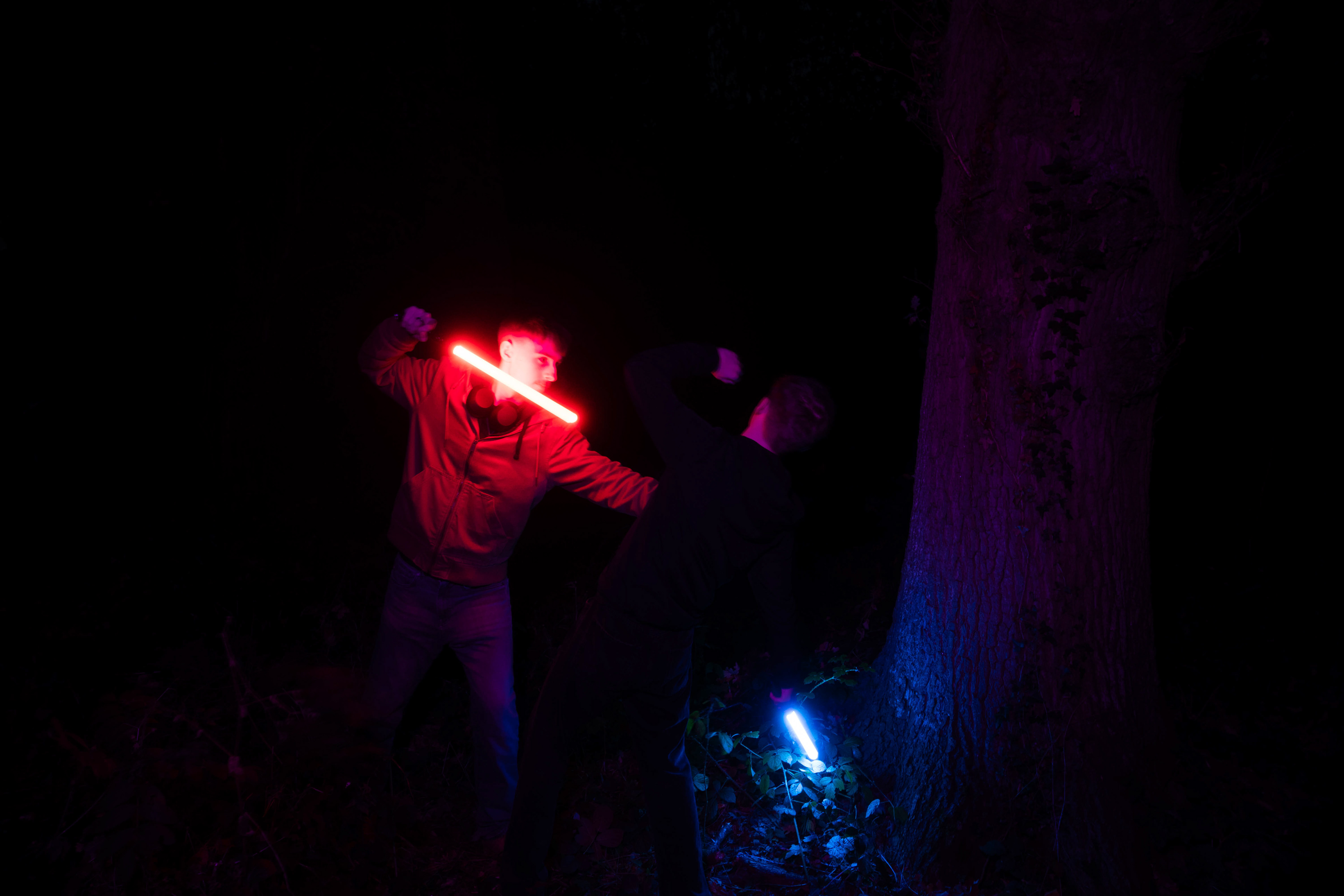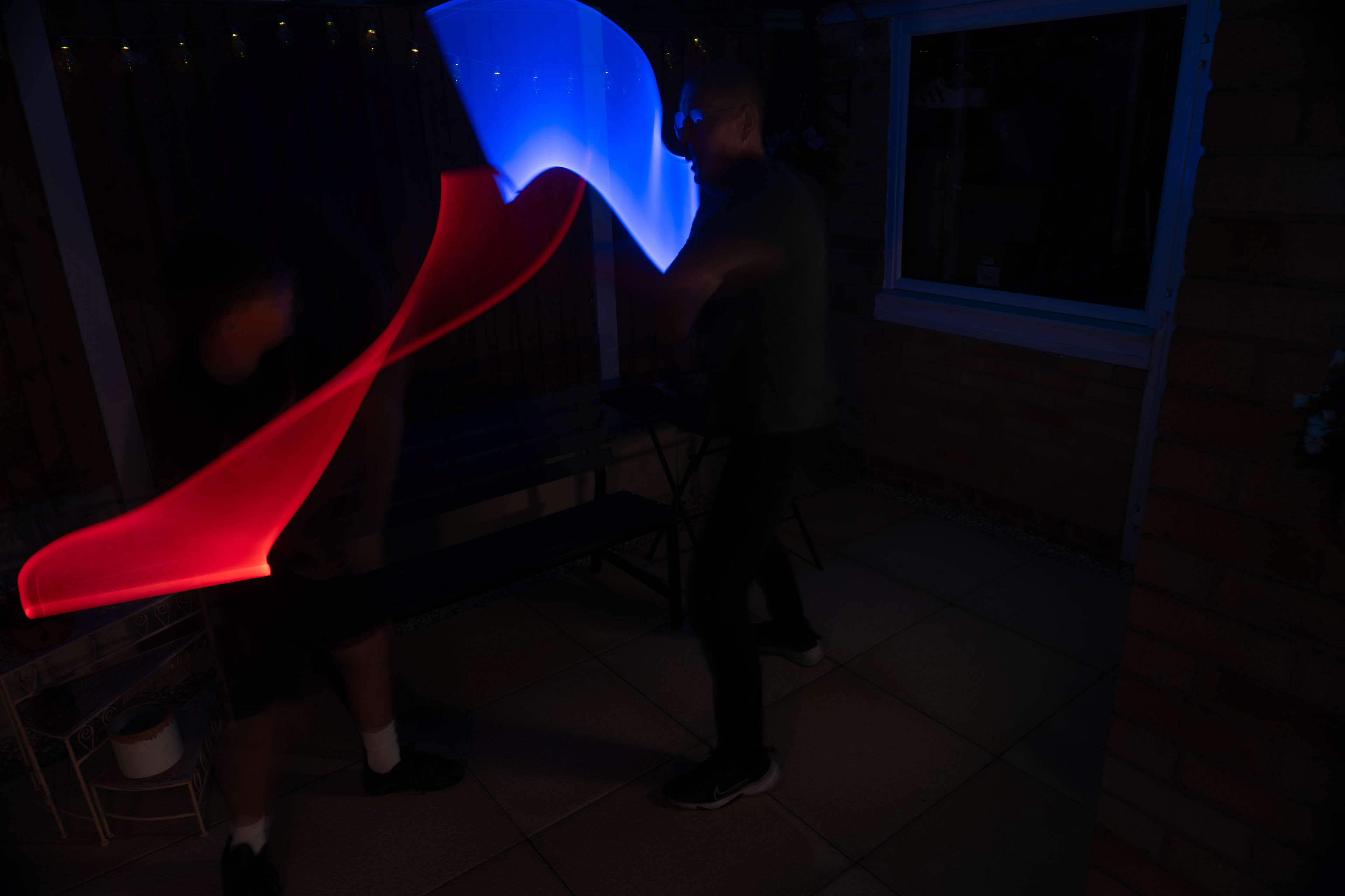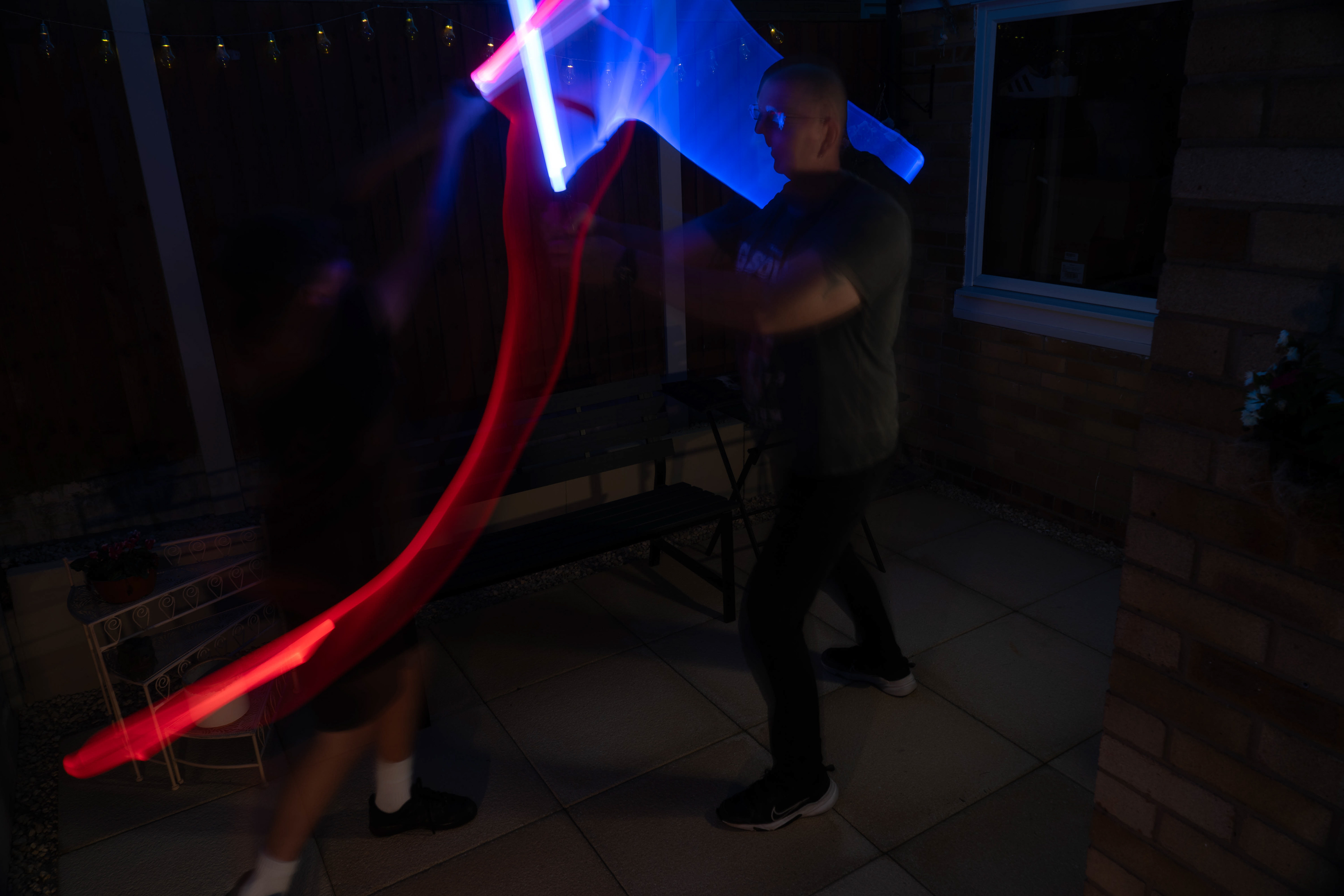 These images were taken in my back garden with my brother and dad. this is a series of images showing a fight scene inspired by star wars. all of these photos are taken on a long exposure time of around a second with lights placed camera left and right to light the subjects and surrounding area so that not only the lightsabers can be seen. the first image shows the start of the "fight" and shows the 2 subjects with their blades touching, this photo was taken on --1 second-- with the models slightly moving their lightsabers to create a wider effect of light- this is not a feature i will be using in future progressions of this as I feel it takes stability away from the photo. the red light from the lightsaber is hitting the subjects face illuminating him in a red shade which could be inferred as making him more "evil" in this situation, his elbow is also rim lit by the light behind. the subject camera right is lit a lot by a light off screen showing he is the "good" guy as he is not shrowded in darkness like the other.