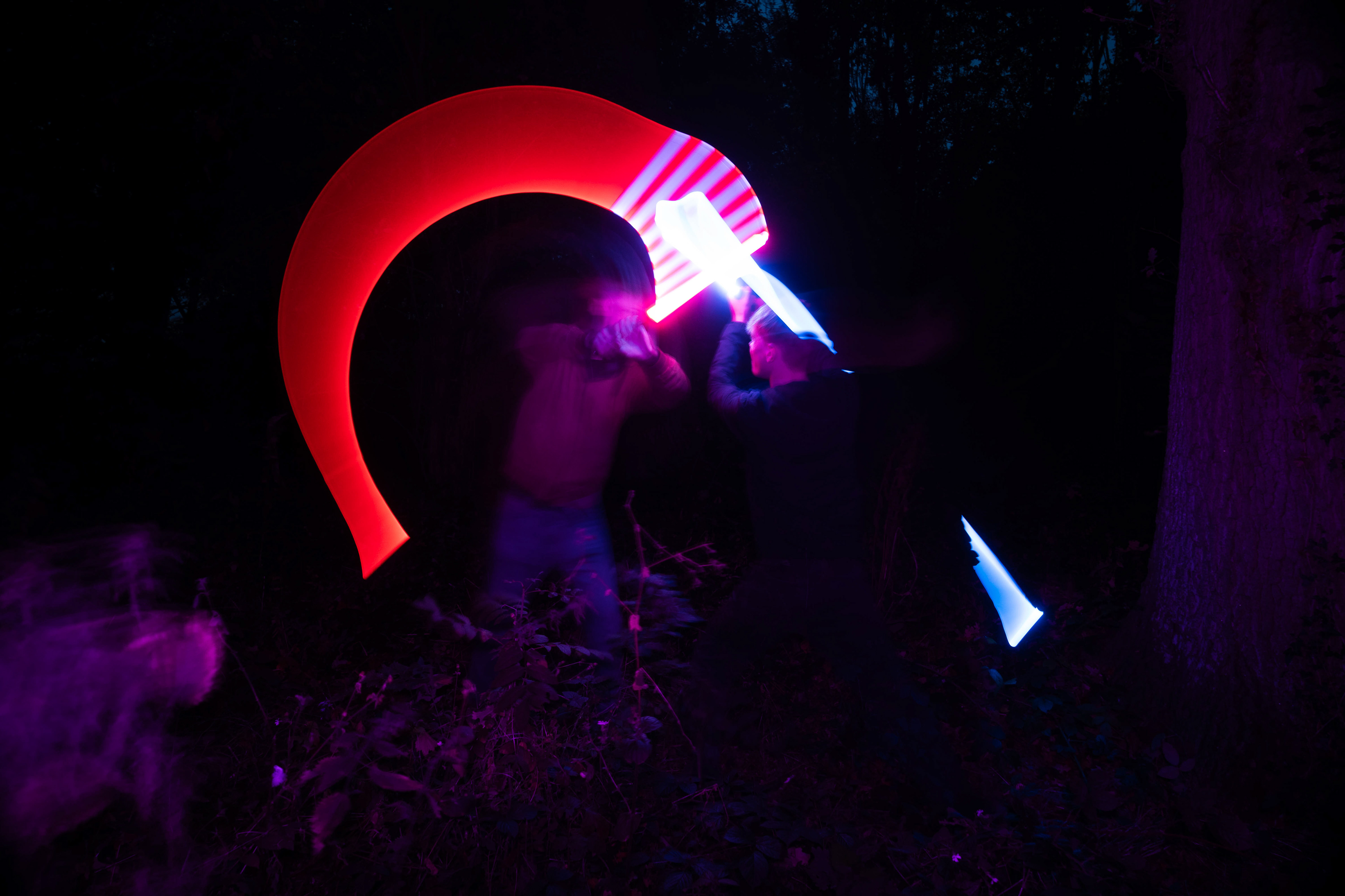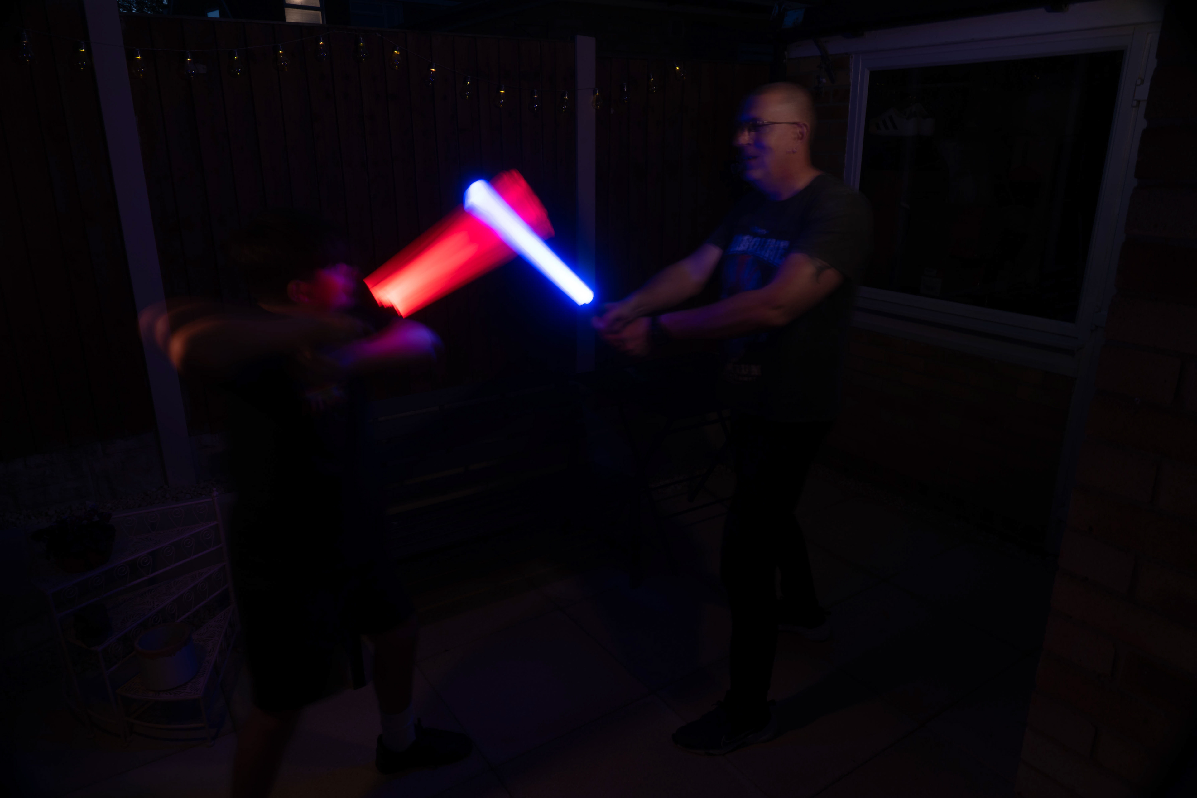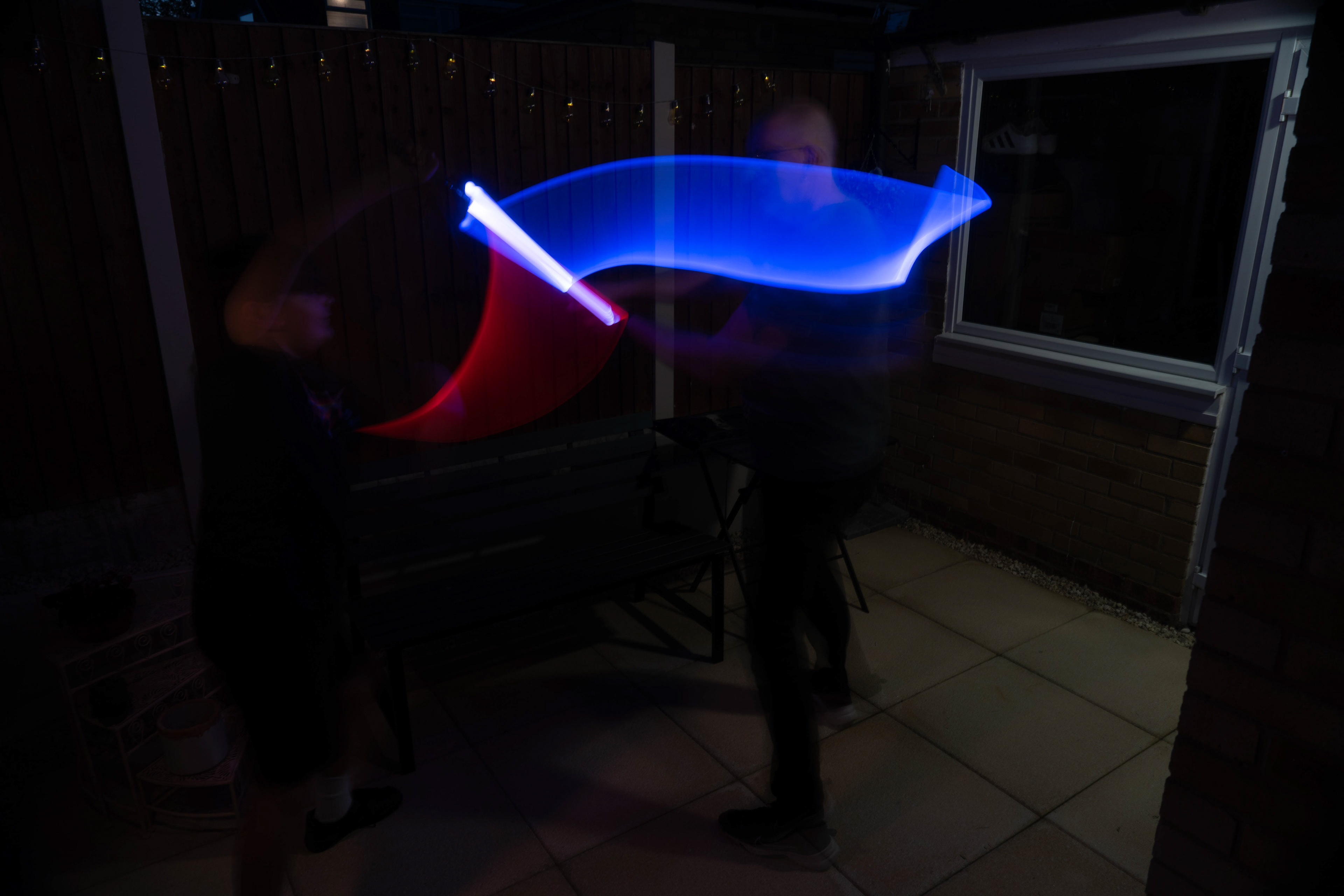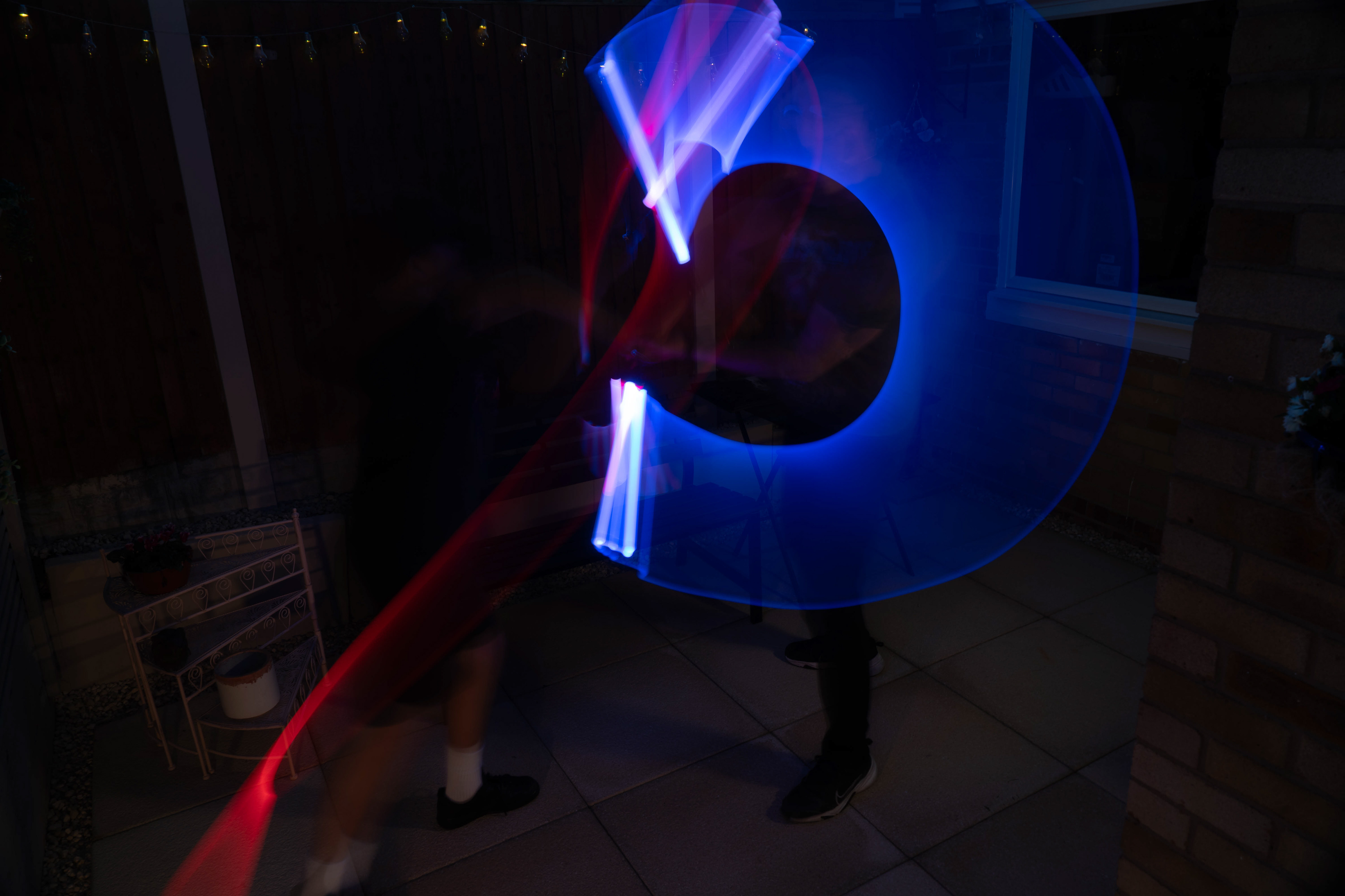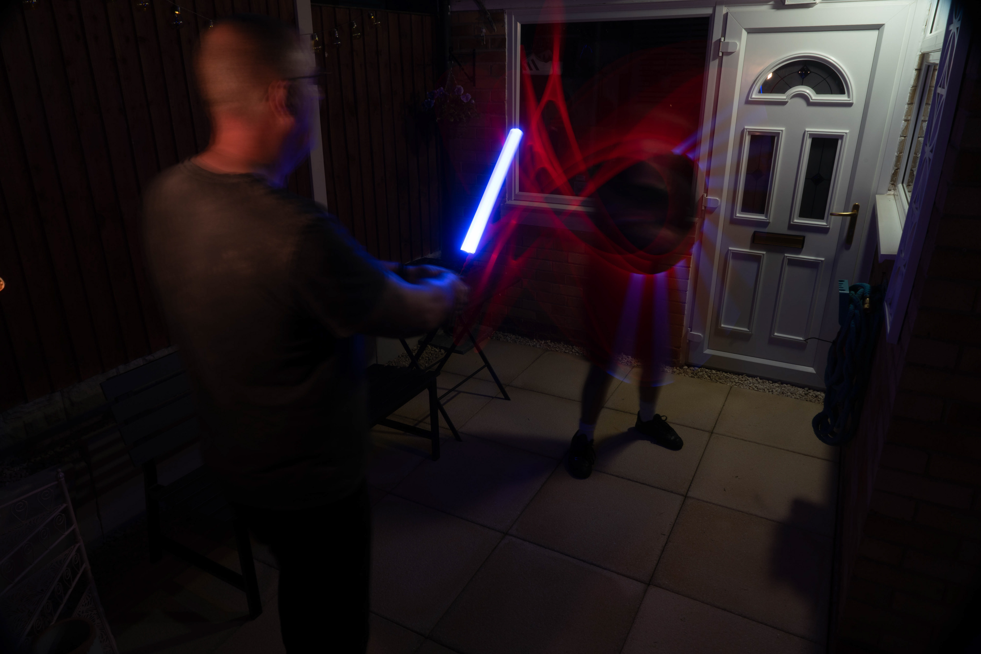 These images were taken in my back garden with my brother and dad. this is a series of images showing a fight scene inspired by star wars. all of these photos are taken on a long exposure time of around a second with lights placed camera left and right to light the subjects and surrounding area so that not only the lightsabers can be seen. the first image shows the start of the "fight" and shows the 2 subjects with their blades touching, this photo was taken on --1 second-- with the models slightly moving their lightsabers to create a wider effect of light- this is not a feature i will be using in future progressions of this as I feel it takes stability away from the photo. the red light from the lightsaber is hitting the subjects face illuminating him in a red shade which could be inferred as making him more "evil" in this situation, his elbow is also rim lit by the light behind. the subject camera right is lit a lot by a light off screen showing he is the "good" guy as he is not shrowded in darkness like the other.