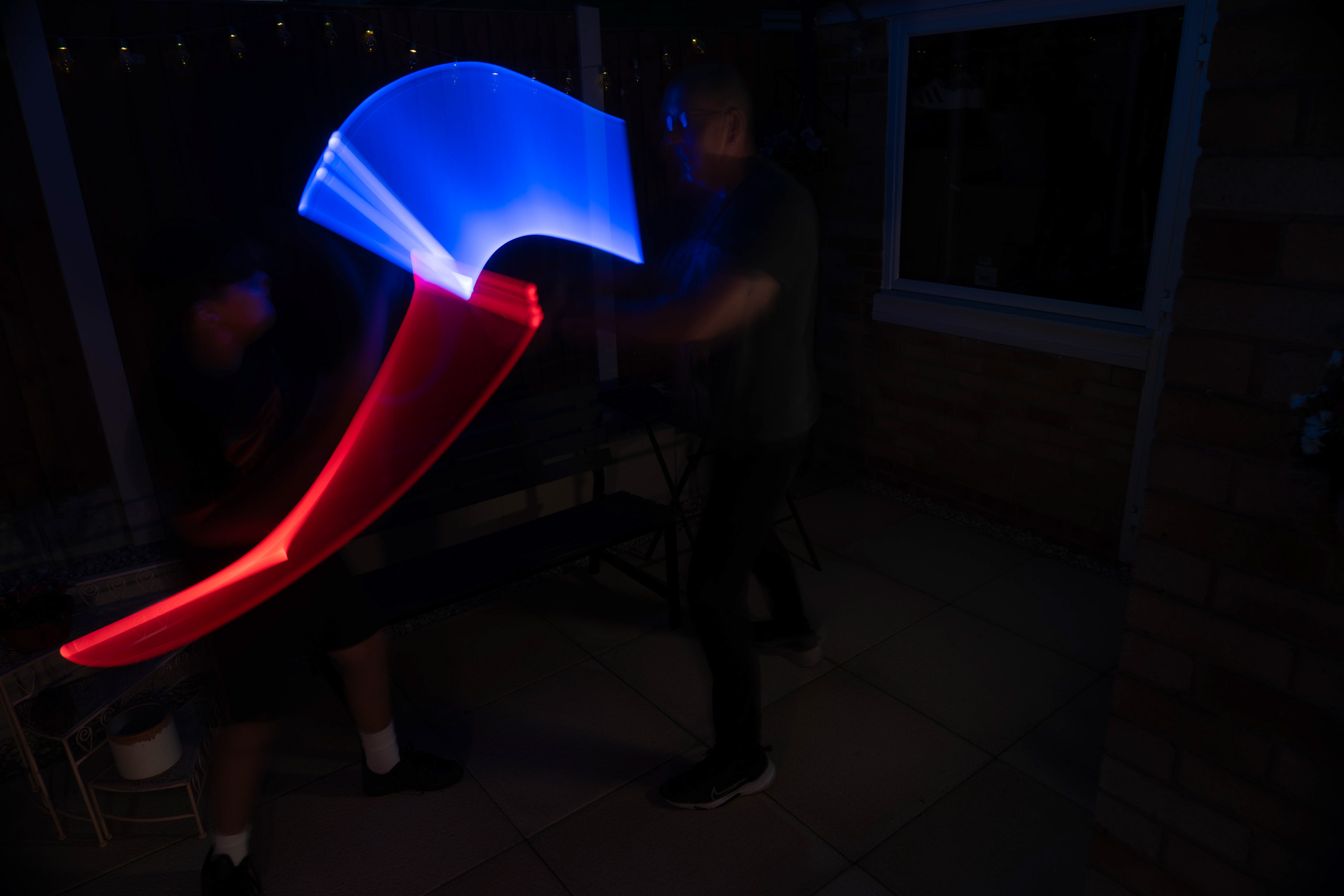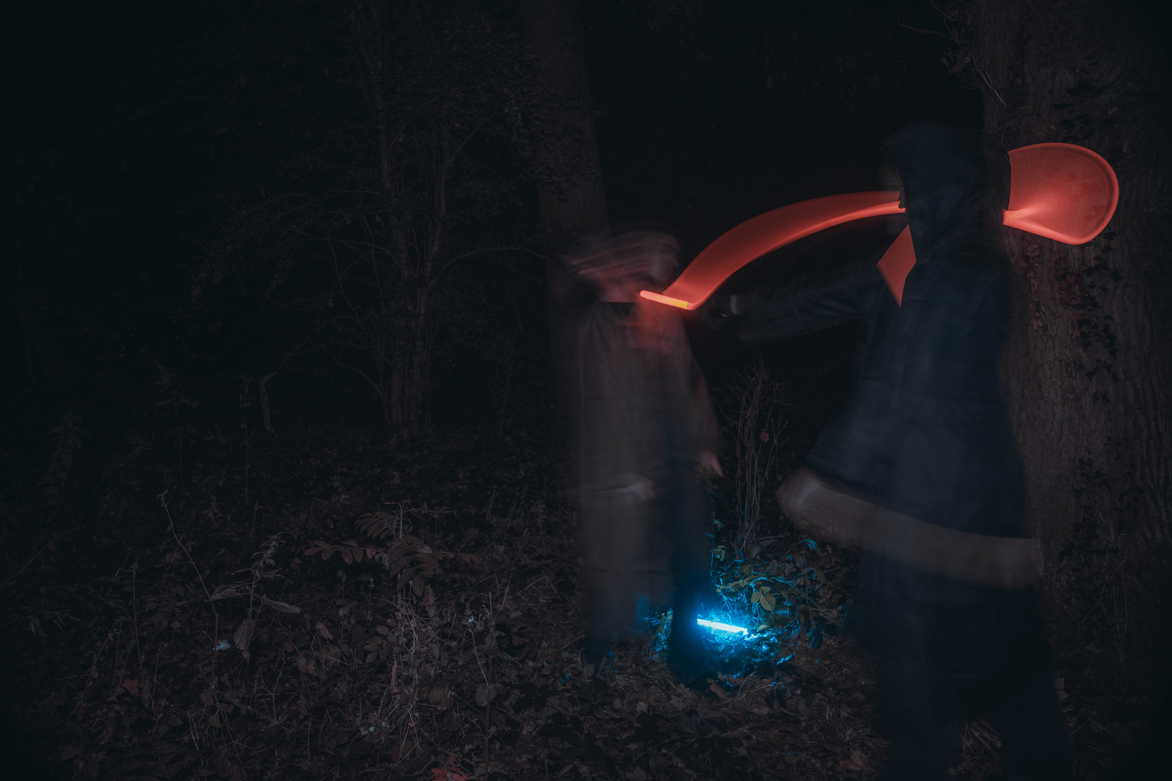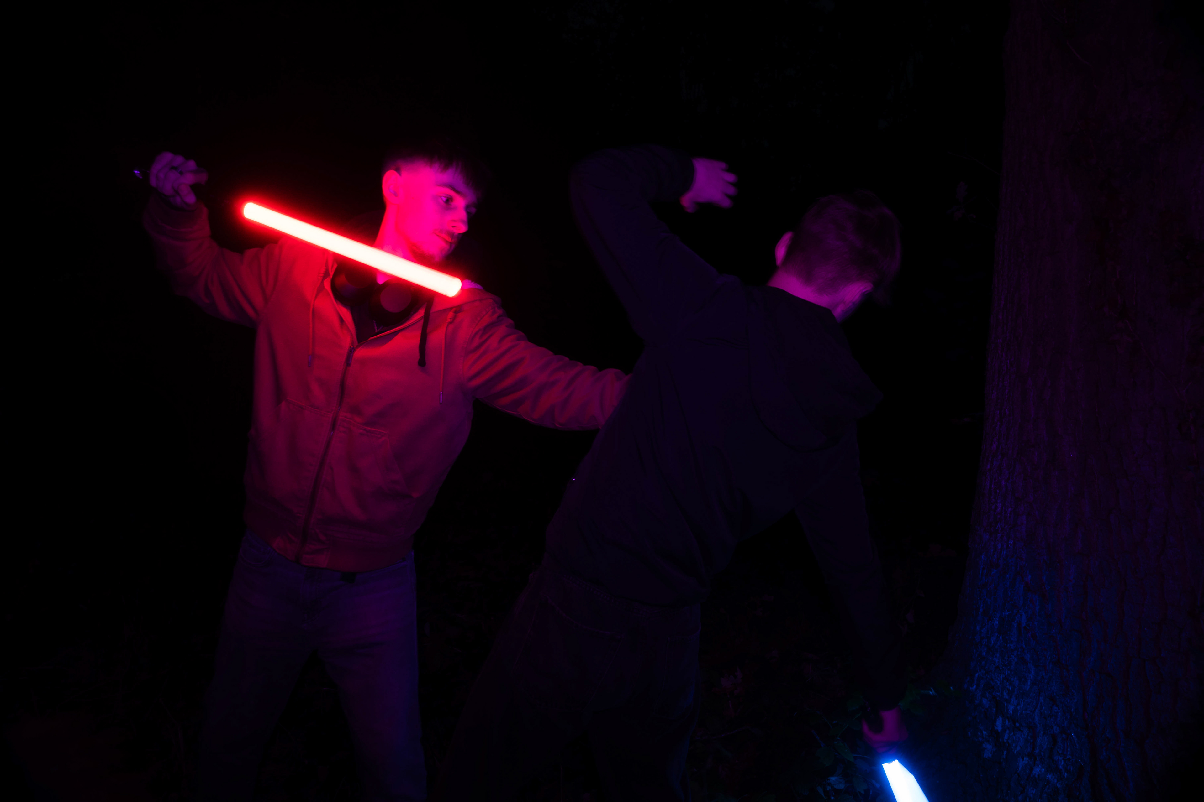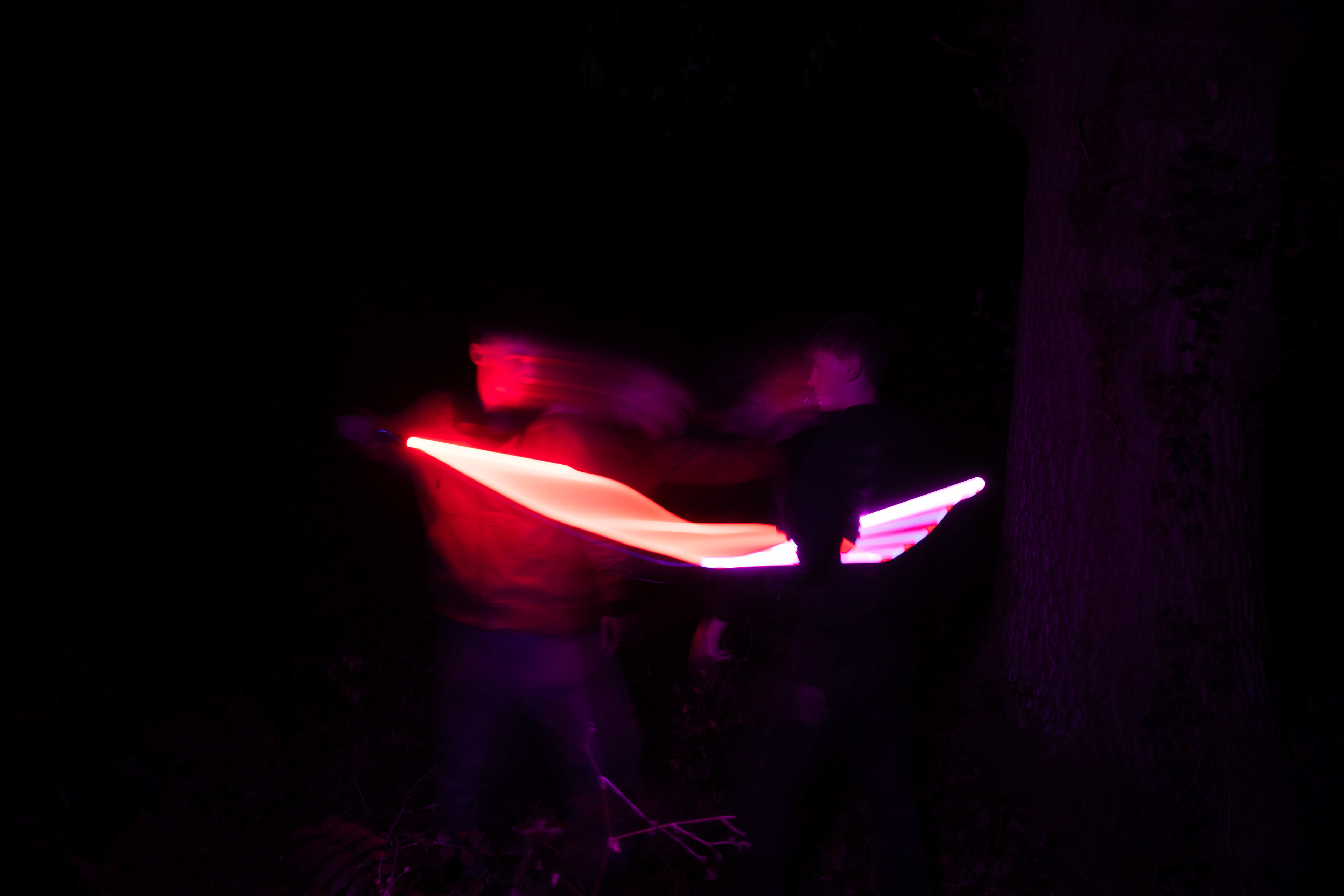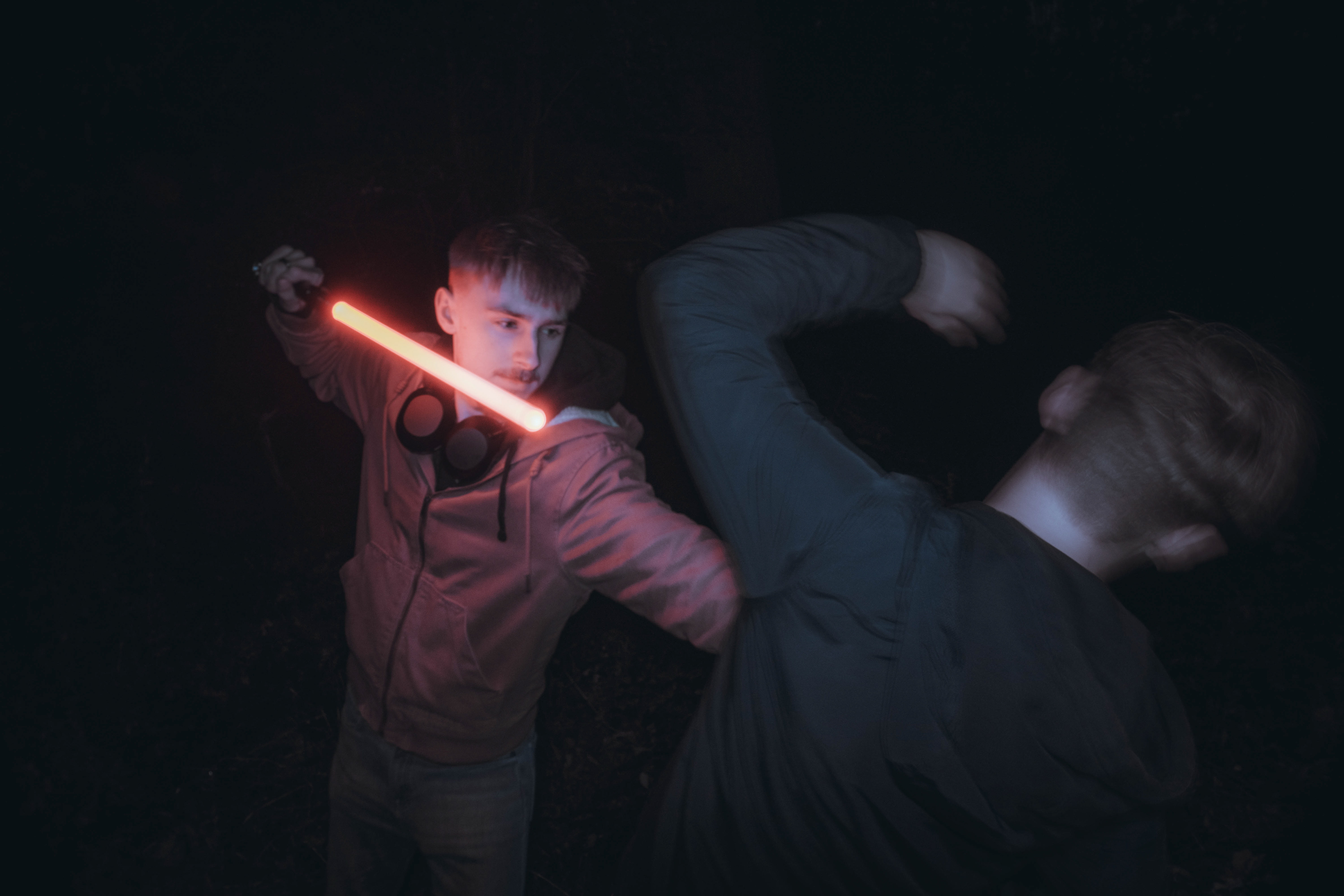 These images were taken in my back garden with my brother and dad. this is a series of images showing a fight scene inspired by star wars. all of these photos are taken on a long exposure time of around a second with lights placed camera left and right to light the subjects and surrounding area so that not only the lightsabers can be seen. the first image shows the start of the "fight" and shows the 2 subjects with their blades touching, this photo was taken on --1 second-- with the models slightly moving their lightsabers to create a wider effect of light- this is not a feature i will be using in future progressions of this as I feel it takes stability away from the photo. the red light from the lightsaber is hitting the subjects face illuminating him in a red shade which could be inferred as making him more "evil" in this situation, his elbow is also rim lit by the light behind. the subject camera right is lit a lot by a light off screen showing he is the "good" guy as he is not shrowded in darkness like the other.