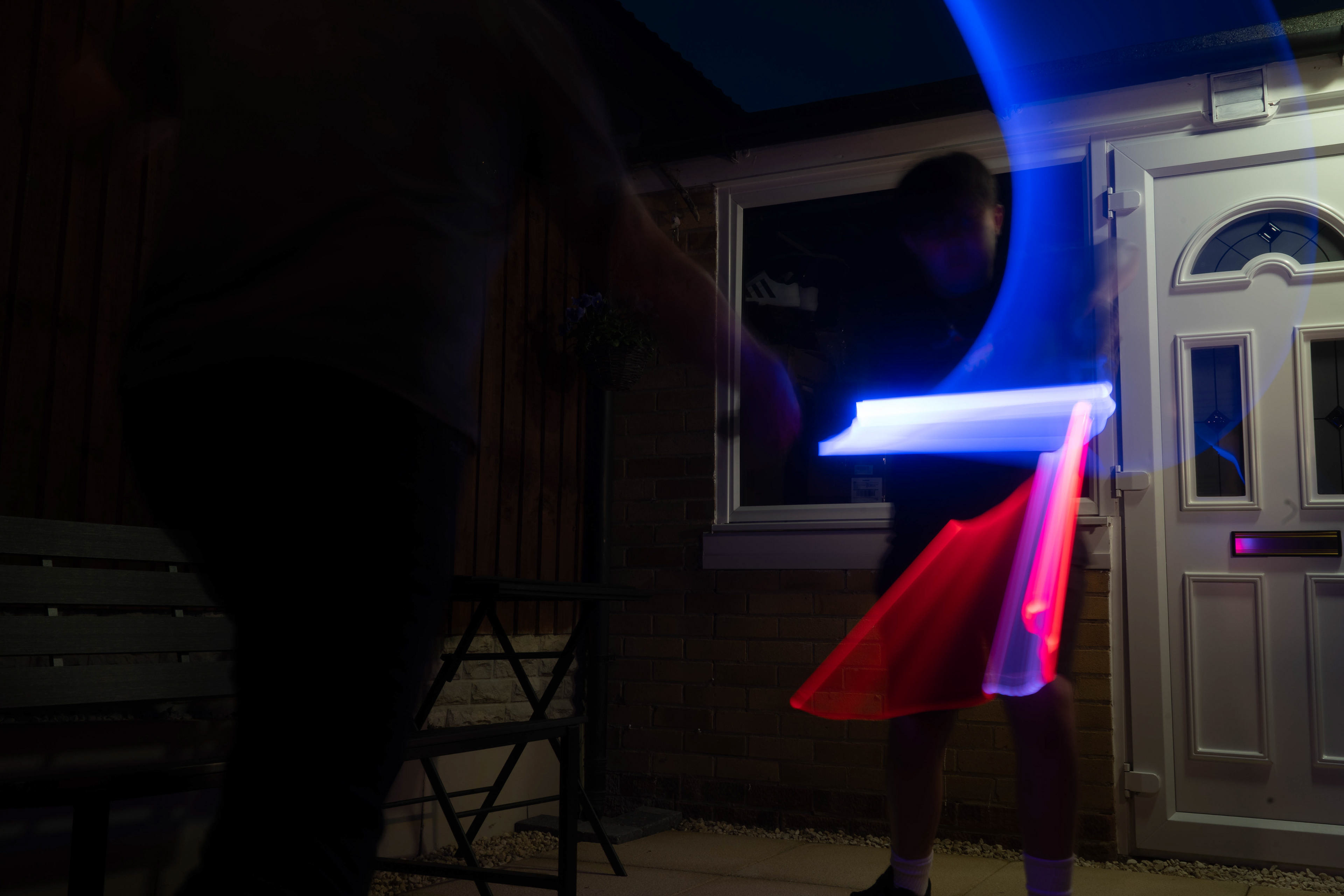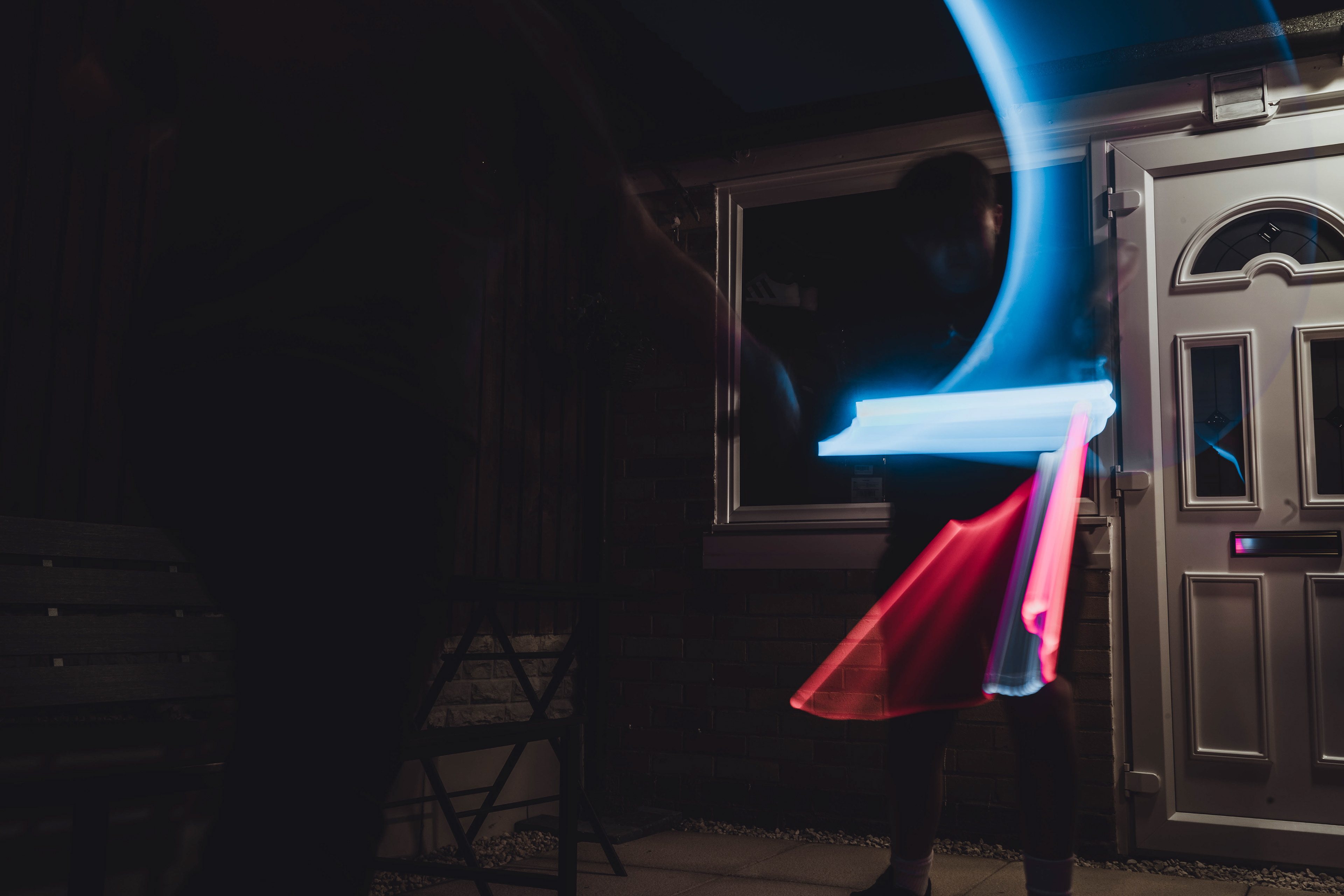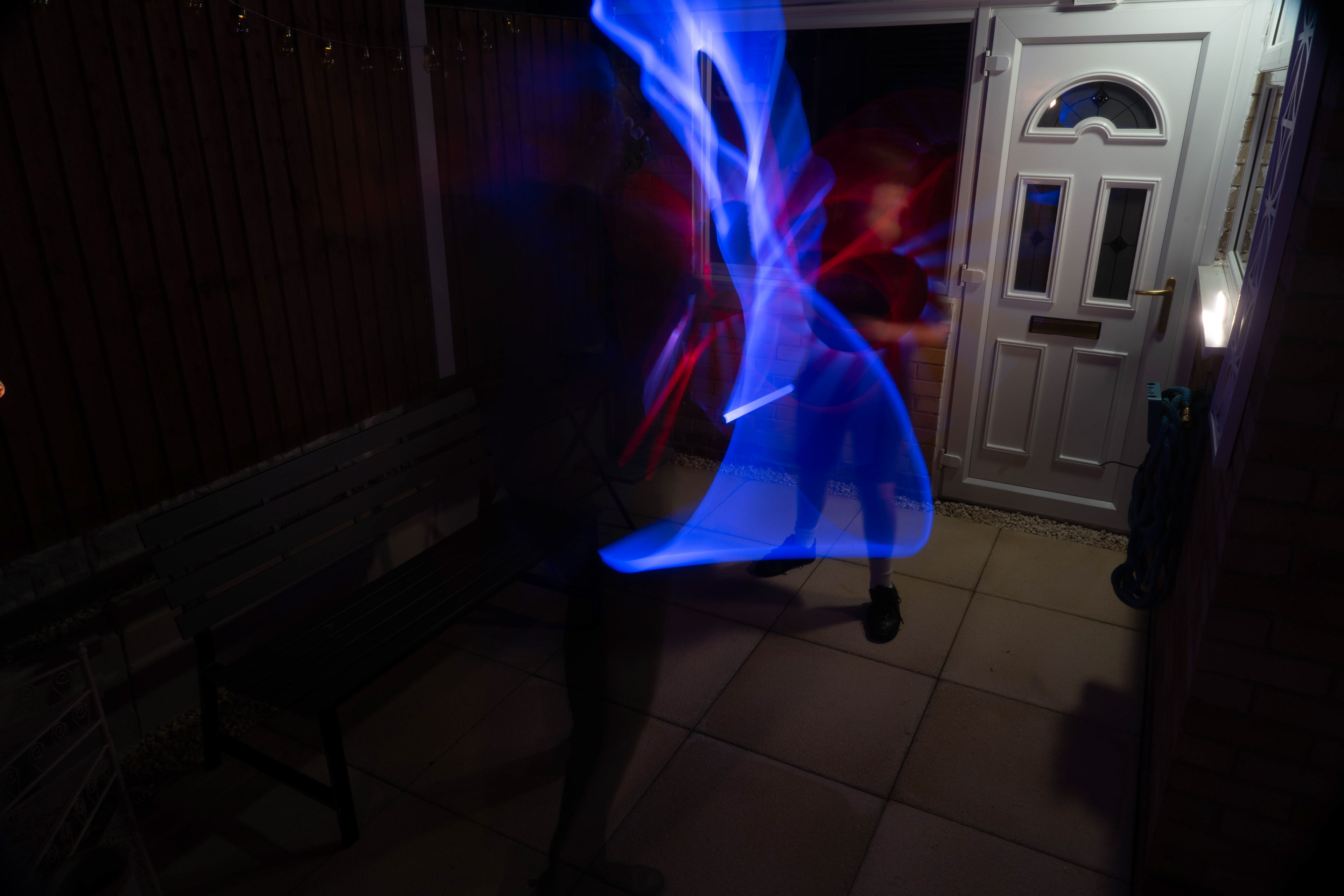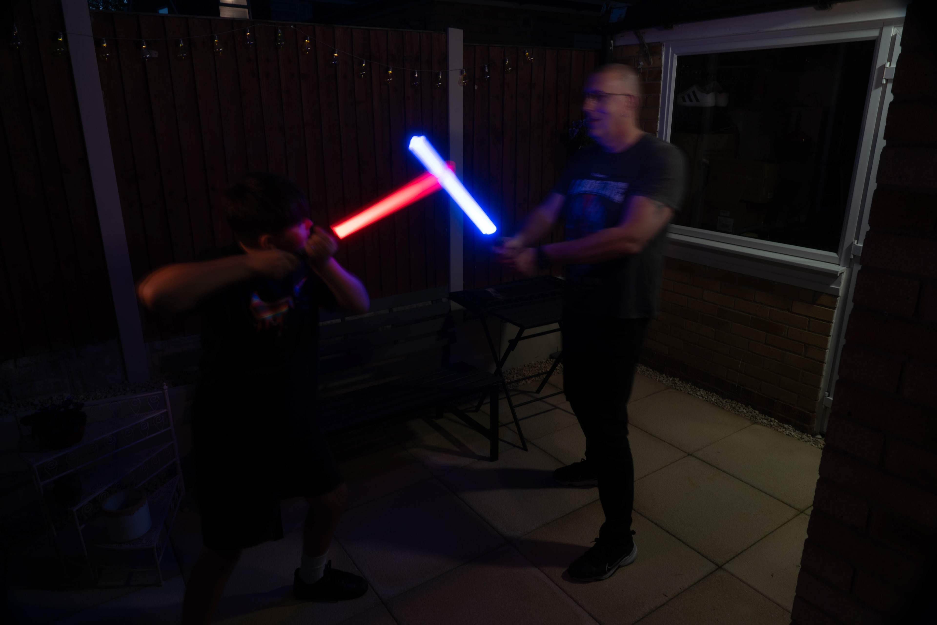 These images were taken in my back garden with my brother and dad. this is a series of images showing a fight scene inspired by star wars. all of these photos are taken on a long exposure time of around a second with lights placed camera left and right to light the subjects and surrounding area so that not only the lightsabers can be seen. the first image shows the start of the "fight" and shows the 2 subjects with their blades touching, this photo was taken on --1 second-- with the models slightly moving their lightsabers to create a wider effect of light- this is not a feature i will be using in future progressions of this as I feel it takes stability away from the photo. the red light from the lightsaber is hitting the subjects face illuminating him in a red shade which could be inferred as making him more "evil" in this situation, his elbow is also rim lit by the light behind. the subject camera right is lit a lot by a light off screen showing he is the "good" guy as he is not shrowded in darkness like the other.