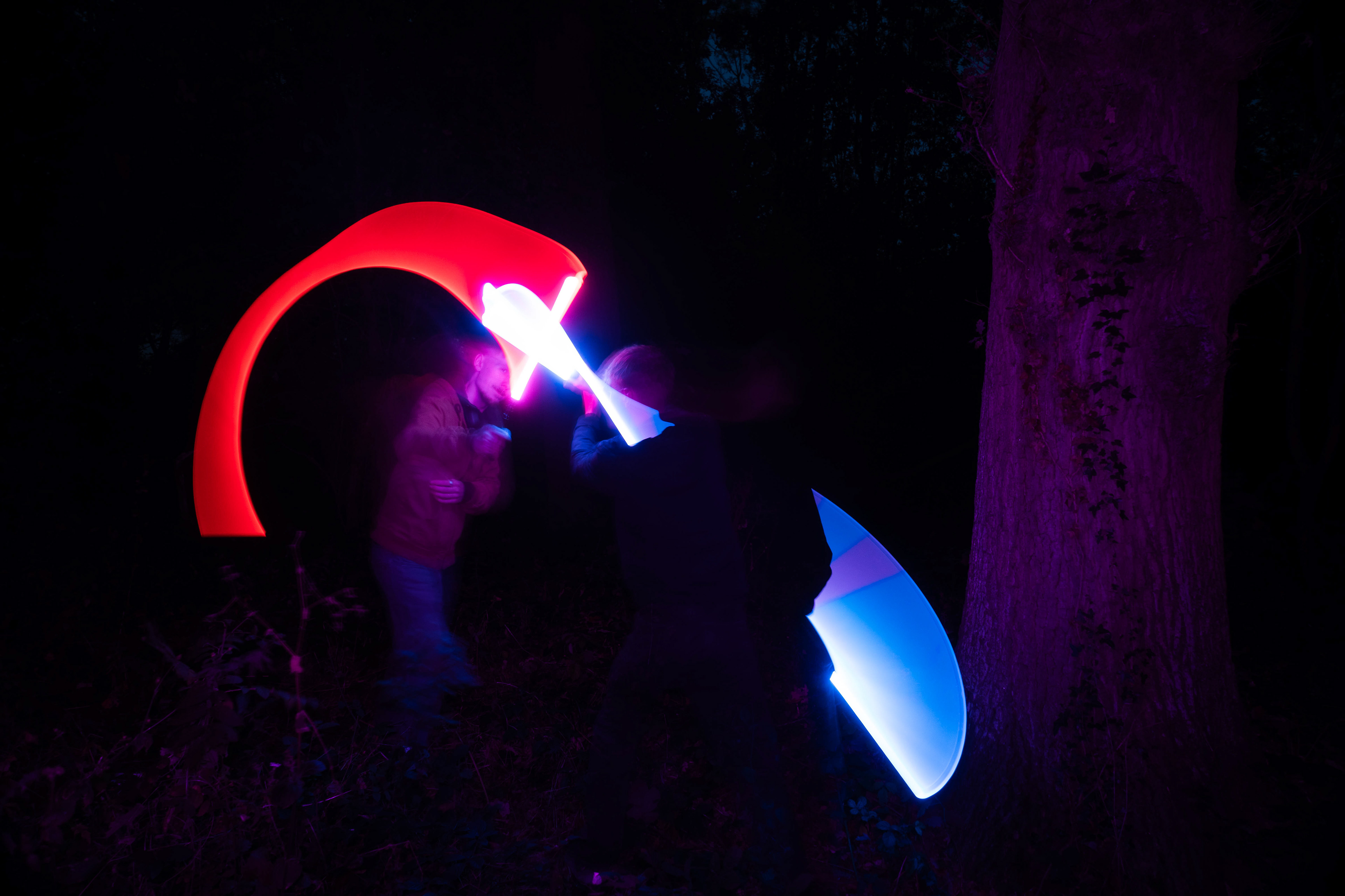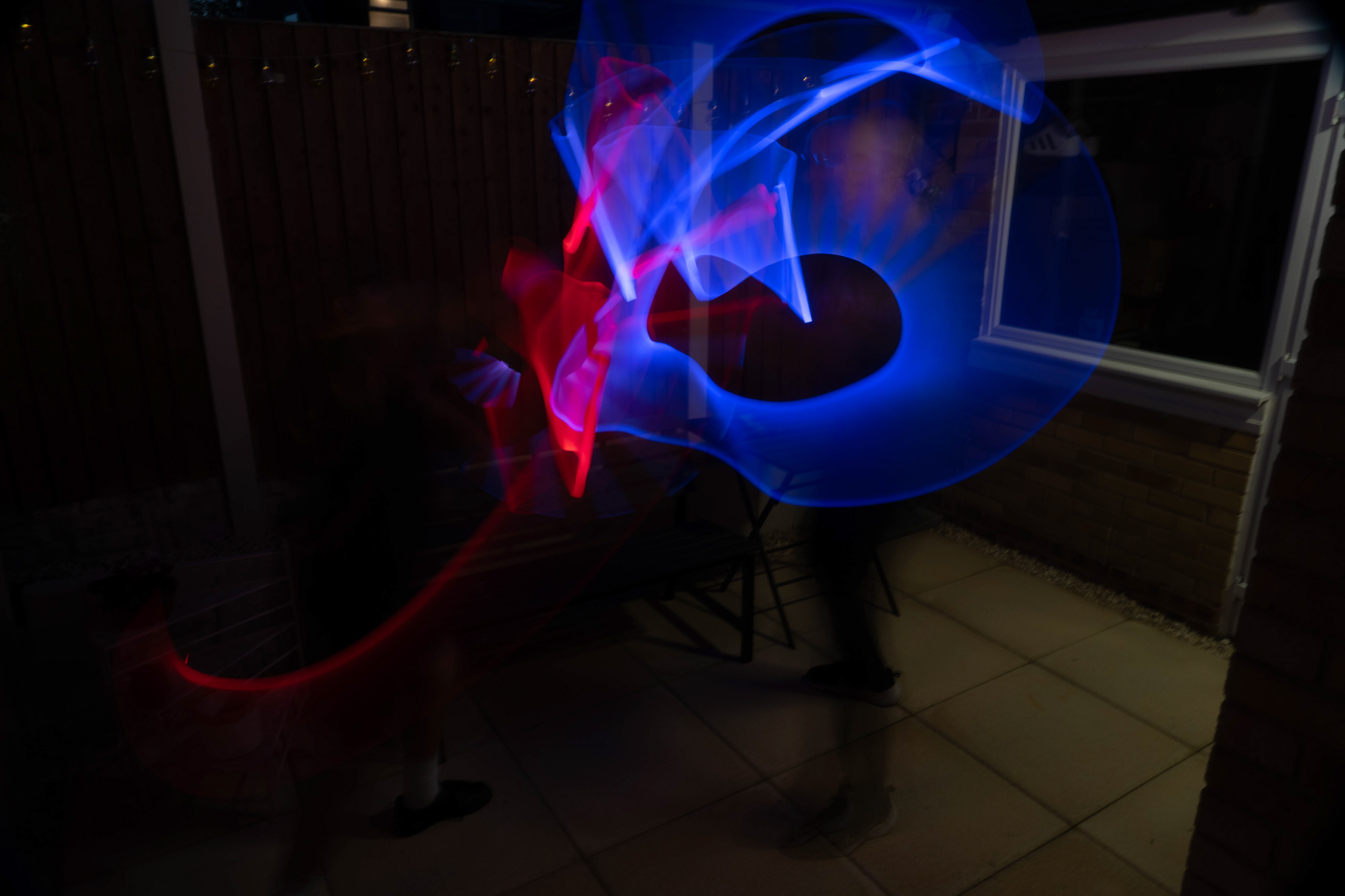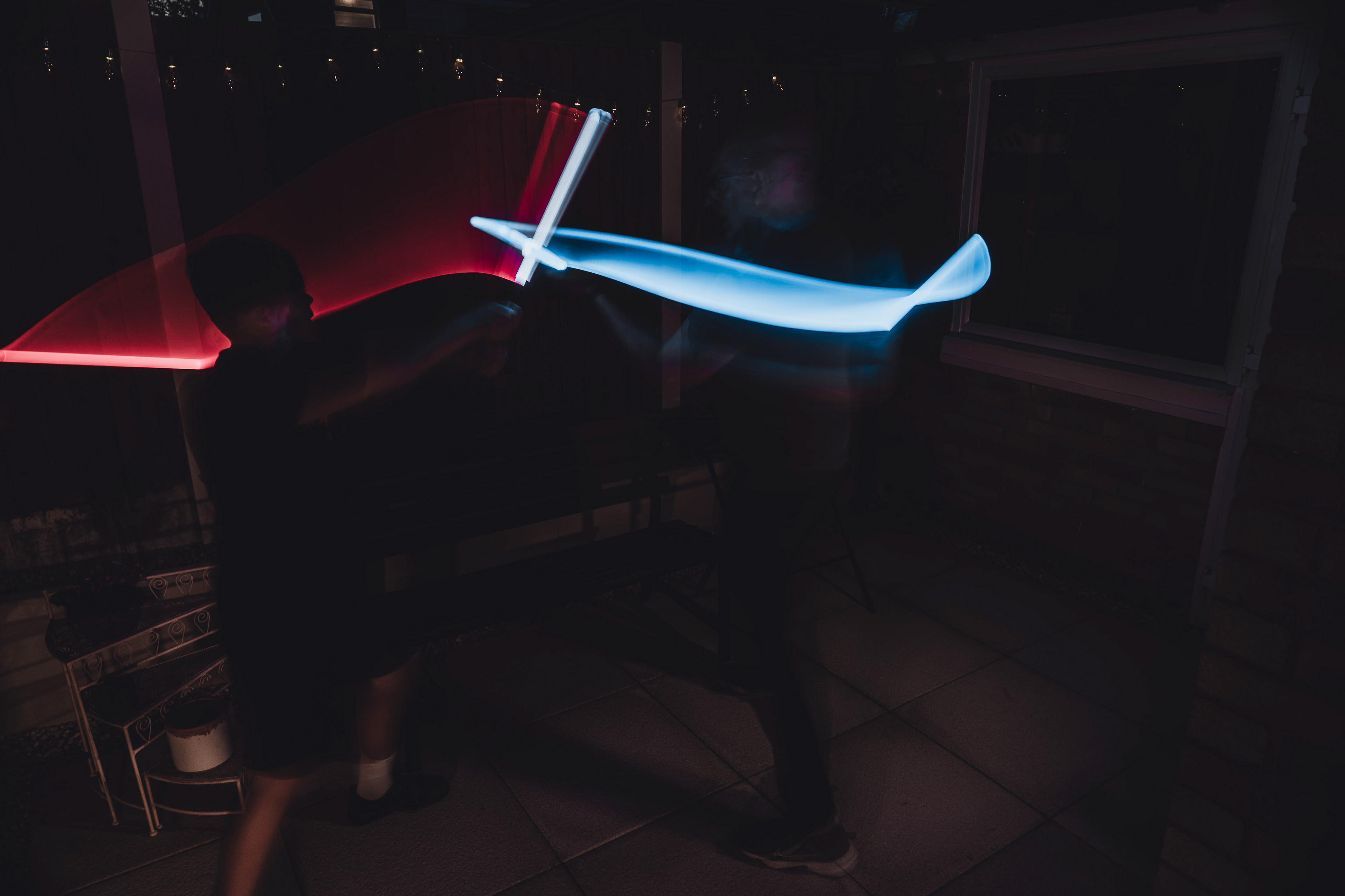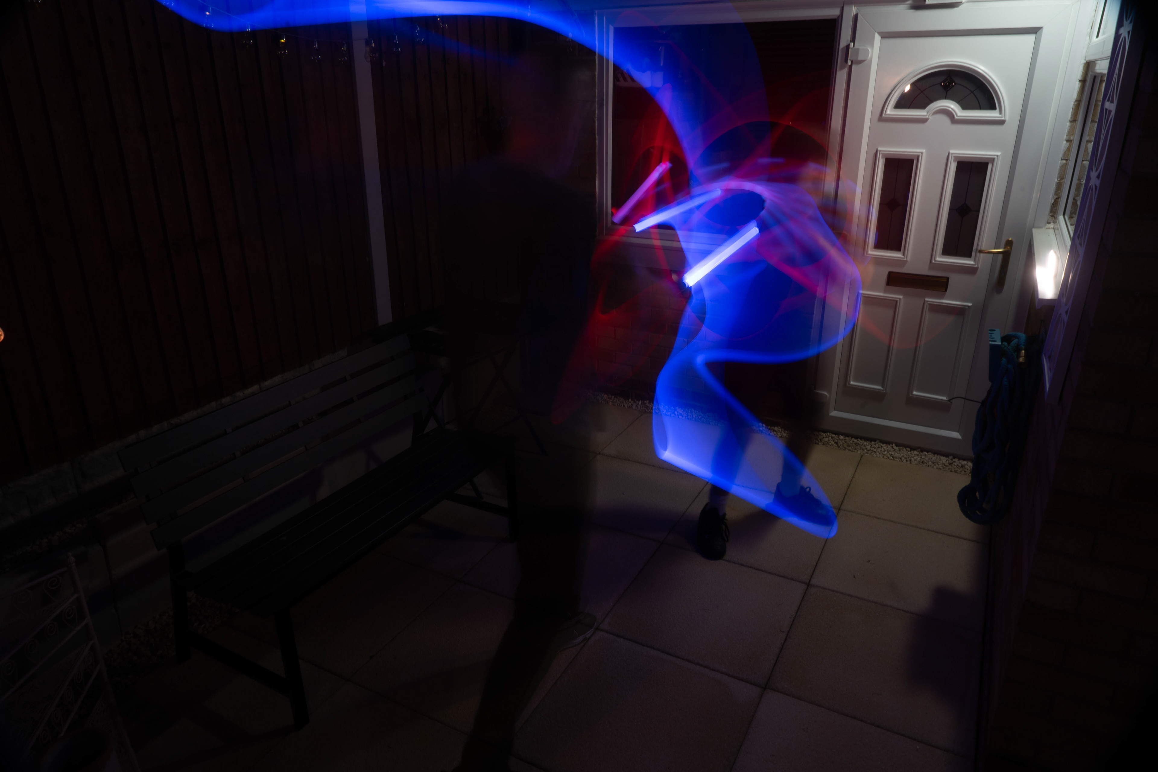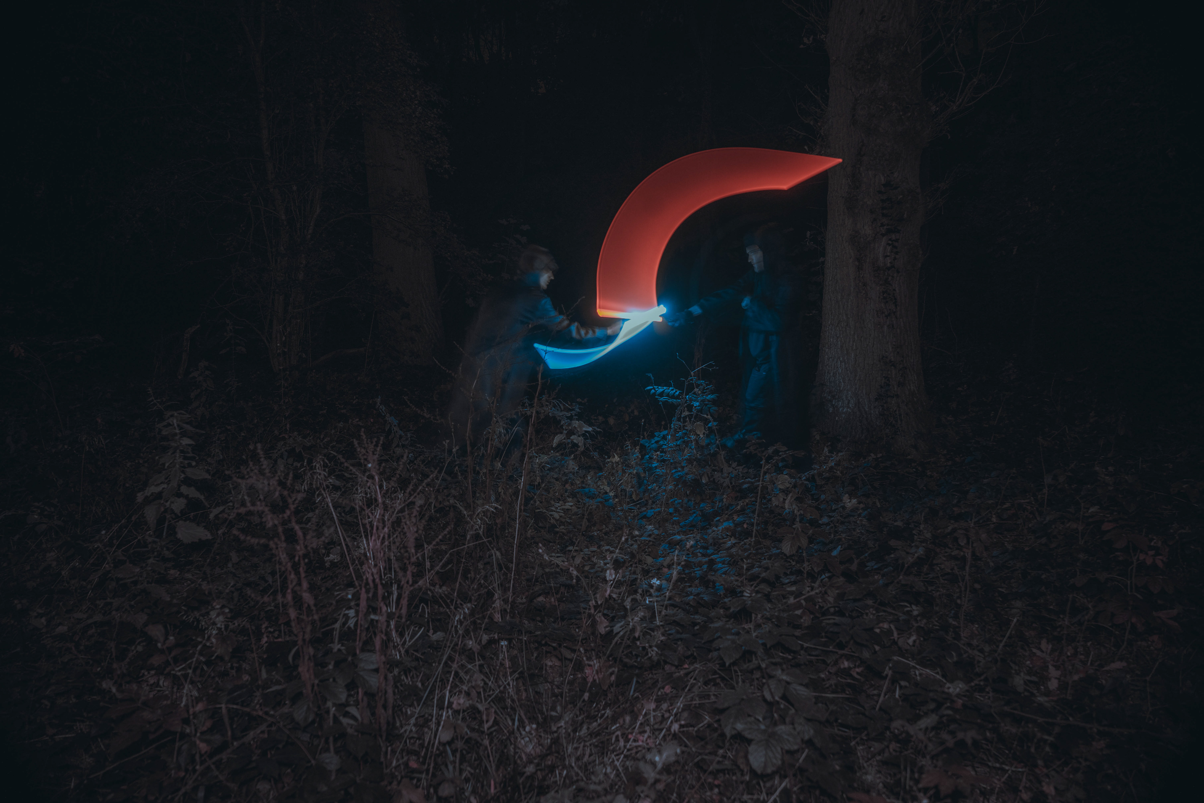 These images were taken in my back garden with my brother and dad. this is a series of images showing a fight scene inspired by star wars. all of these photos are taken on a long exposure time of around a second with lights placed camera left and right to light the subjects and surrounding area so that not only the lightsabers can be seen. the first image shows the start of the "fight" and shows the 2 subjects with their blades touching, this photo was taken on --1 second-- with the models slightly moving their lightsabers to create a wider effect of light- this is not a feature i will be using in future progressions of this as I feel it takes stability away from the photo. the red light from the lightsaber is hitting the subjects face illuminating him in a red shade which could be inferred as making him more "evil" in this situation, his elbow is also rim lit by the light behind. the subject camera right is lit a lot by a light off screen showing he is the "good" guy as he is not shrowded in darkness like the other.