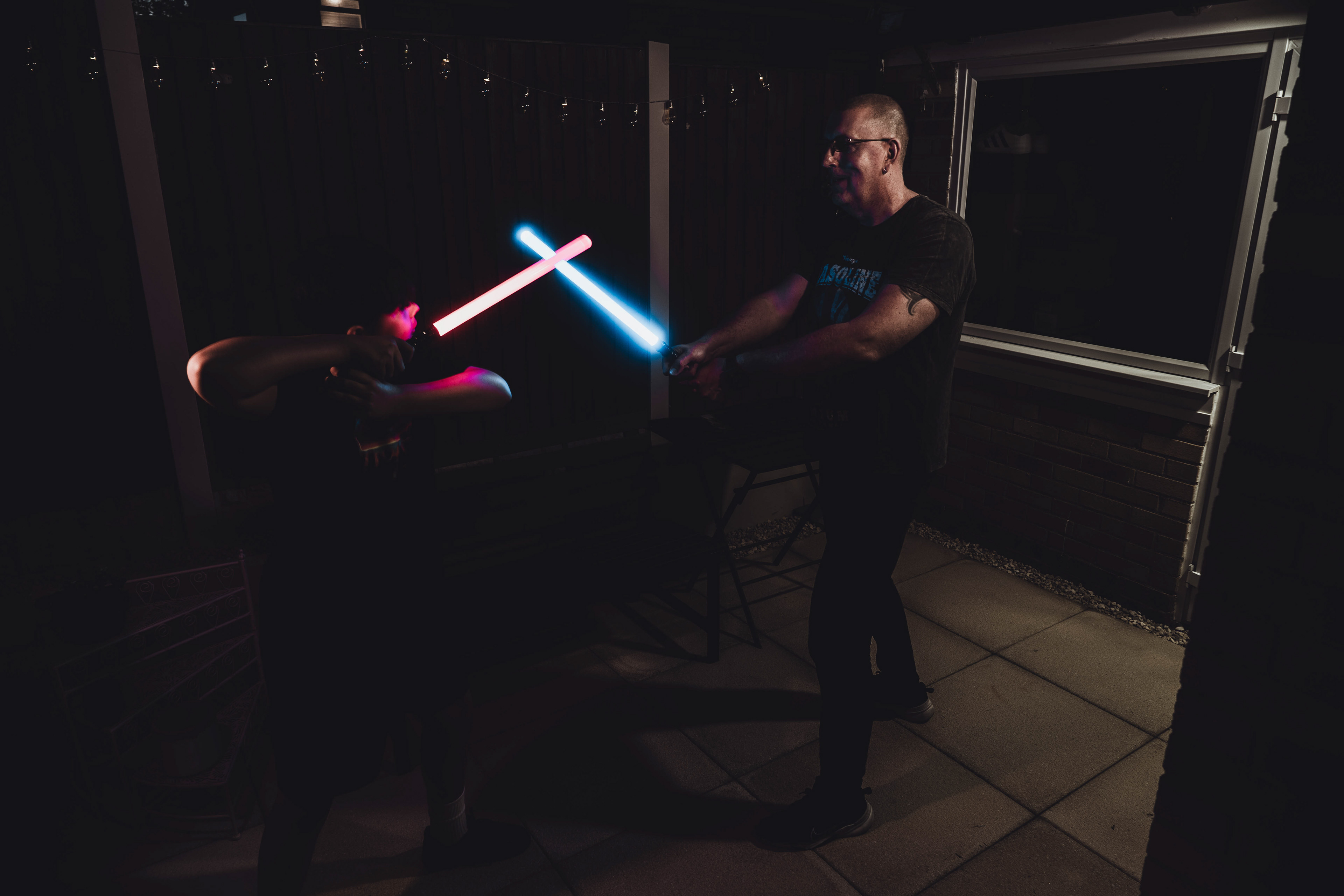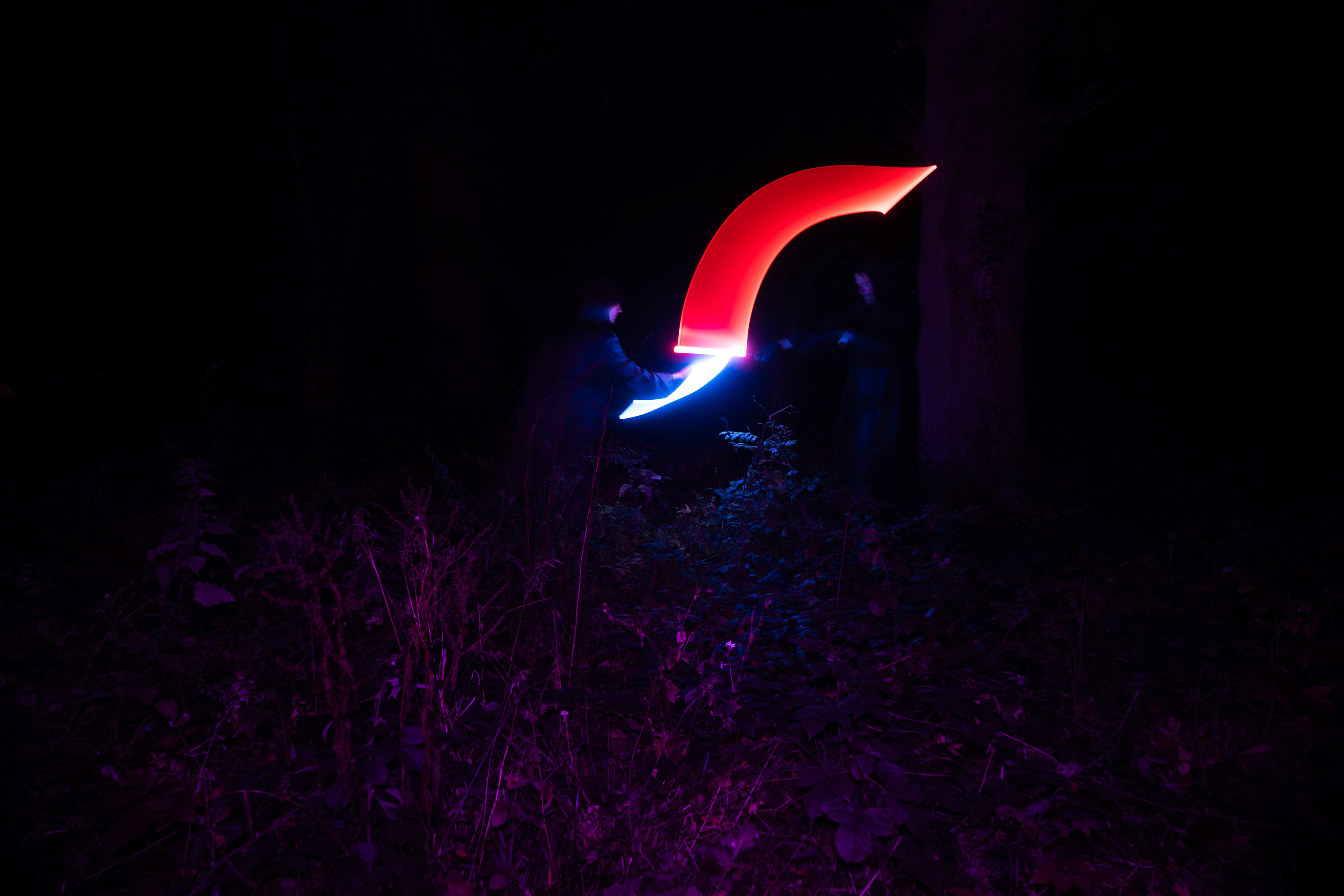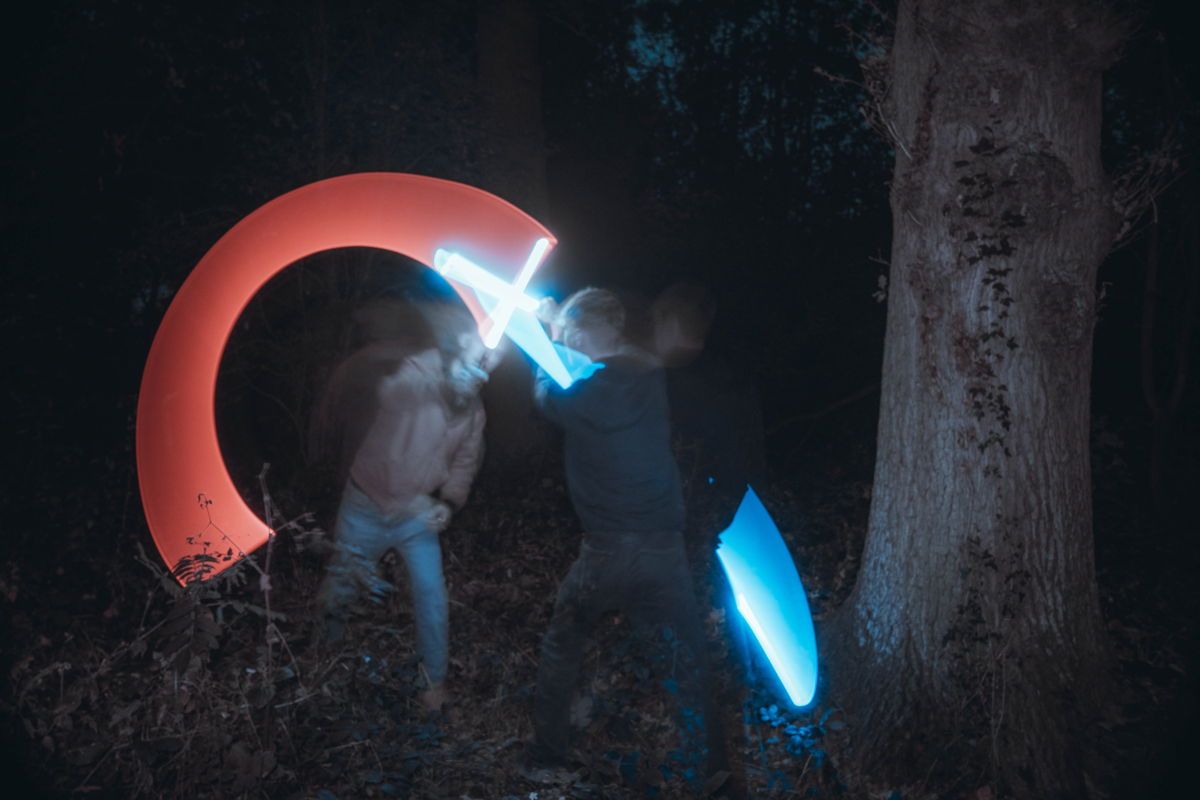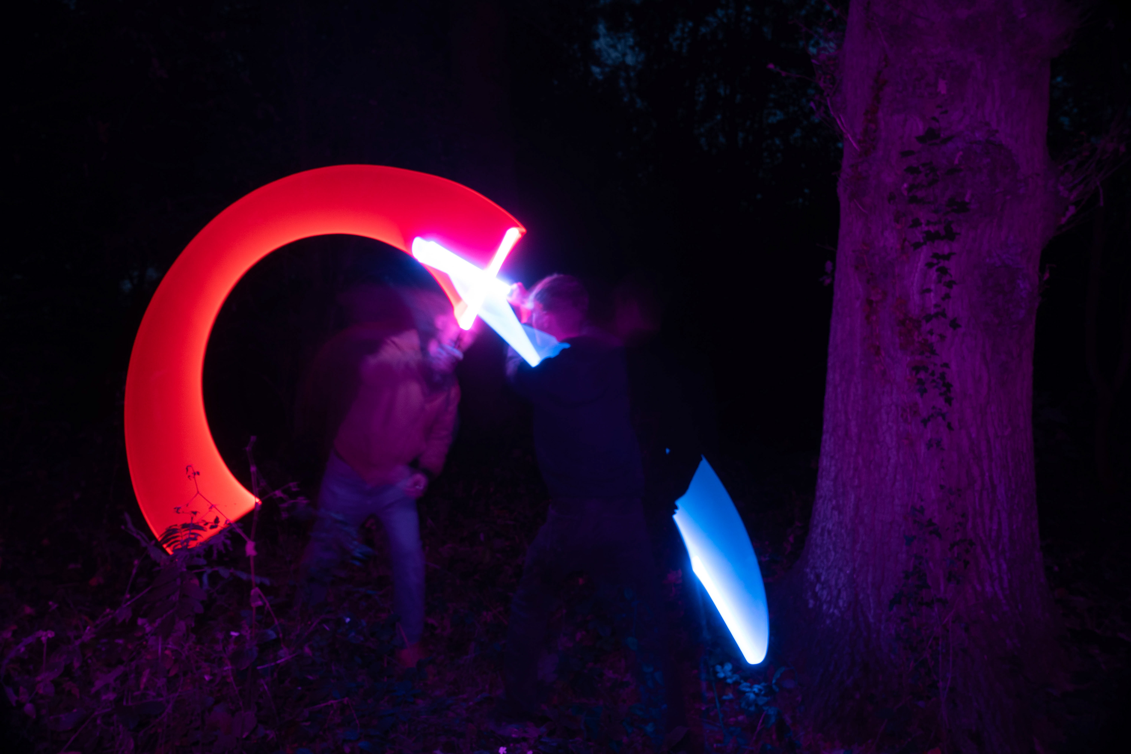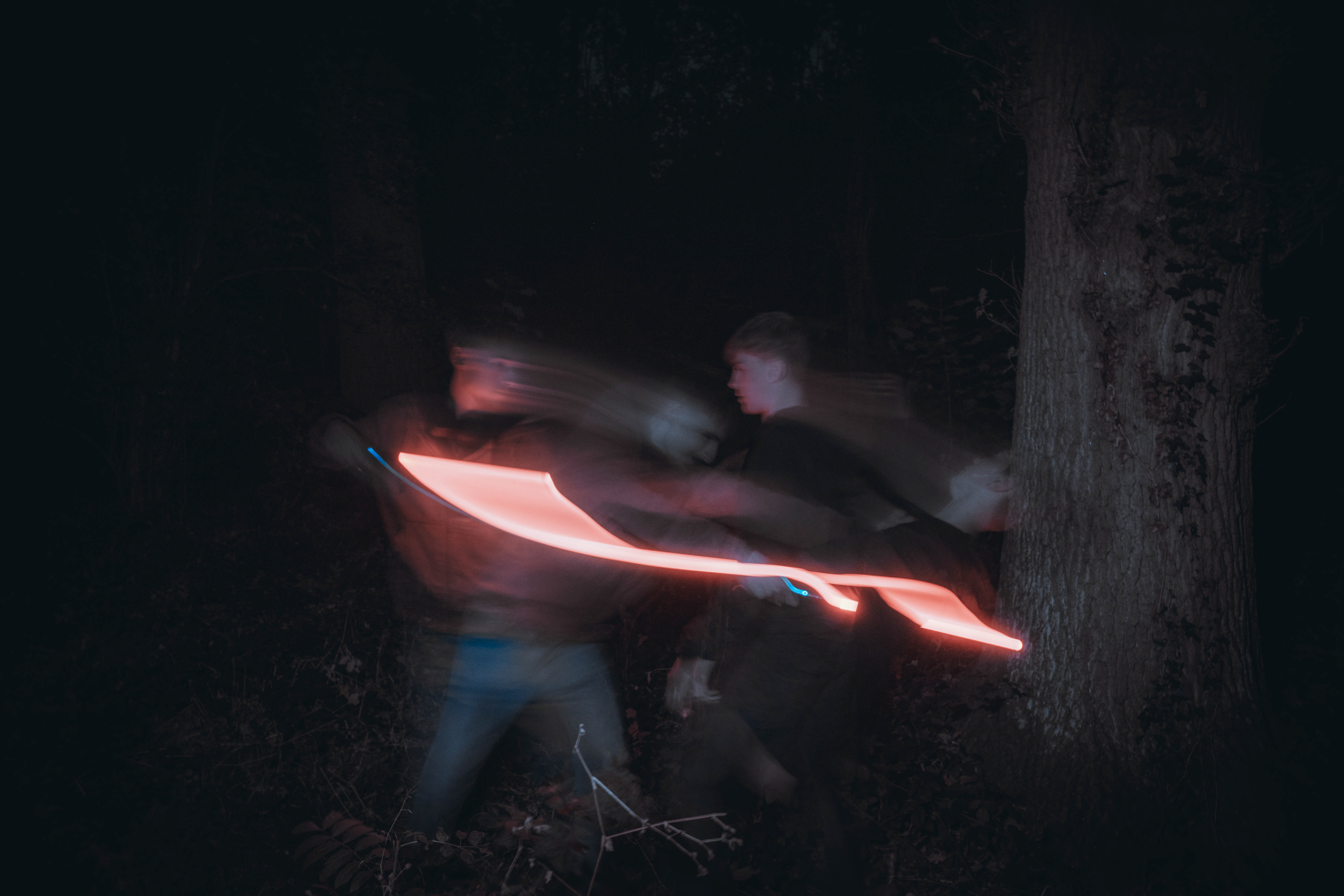 These images were taken in my back garden with my brother and dad. this is a series of images showing a fight scene inspired by star wars. all of these photos are taken on a long exposure time of around a second with lights placed camera left and right to light the subjects and surrounding area so that not only the lightsabers can be seen. the first image shows the start of the "fight" and shows the 2 subjects with their blades touching, this photo was taken on --1 second-- with the models slightly moving their lightsabers to create a wider effect of light- this is not a feature i will be using in future progressions of this as I feel it takes stability away from the photo. the red light from the lightsaber is hitting the subjects face illuminating him in a red shade which could be inferred as making him more "evil" in this situation, his elbow is also rim lit by the light behind. the subject camera right is lit a lot by a light off screen showing he is the "good" guy as he is not shrowded in darkness like the other.