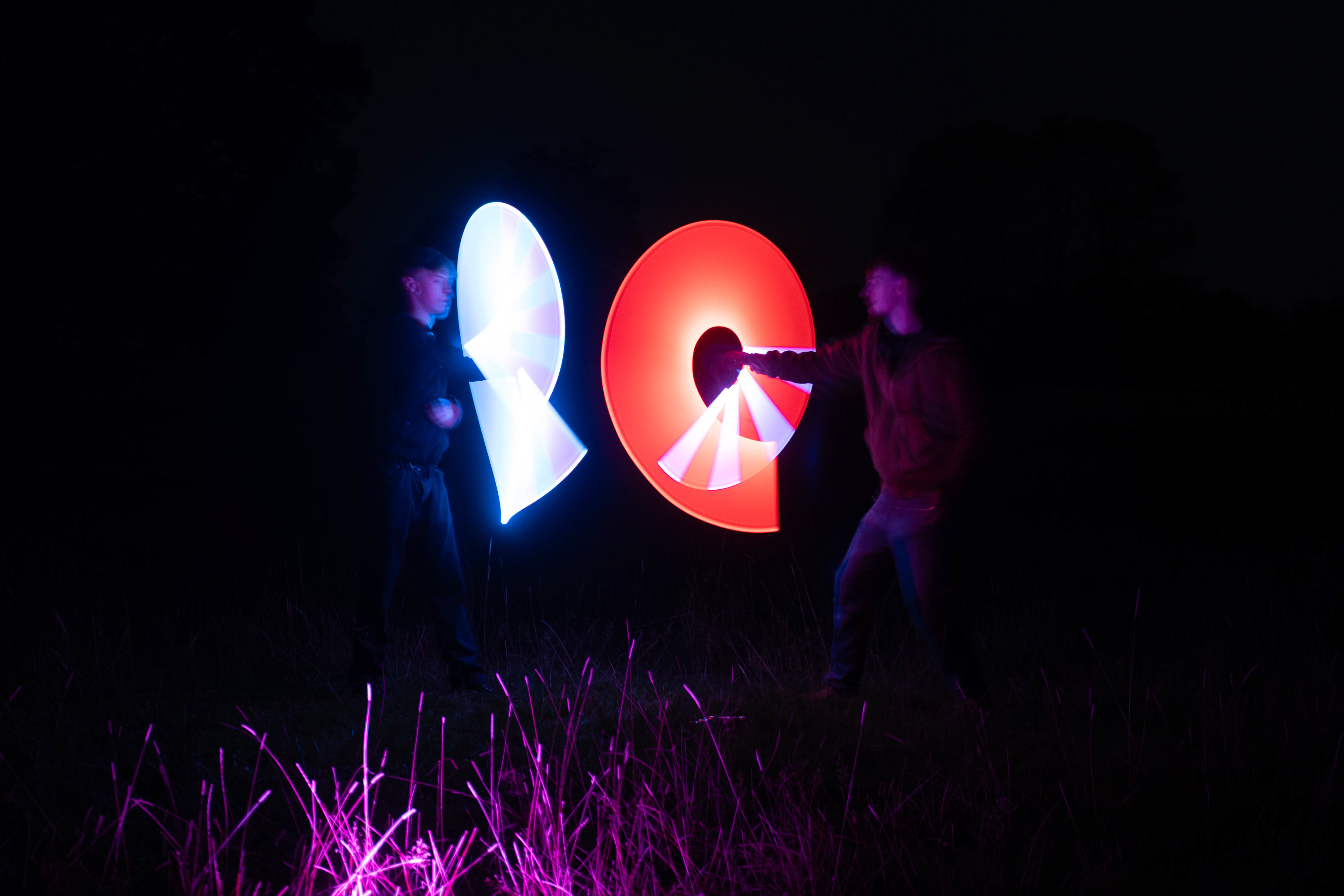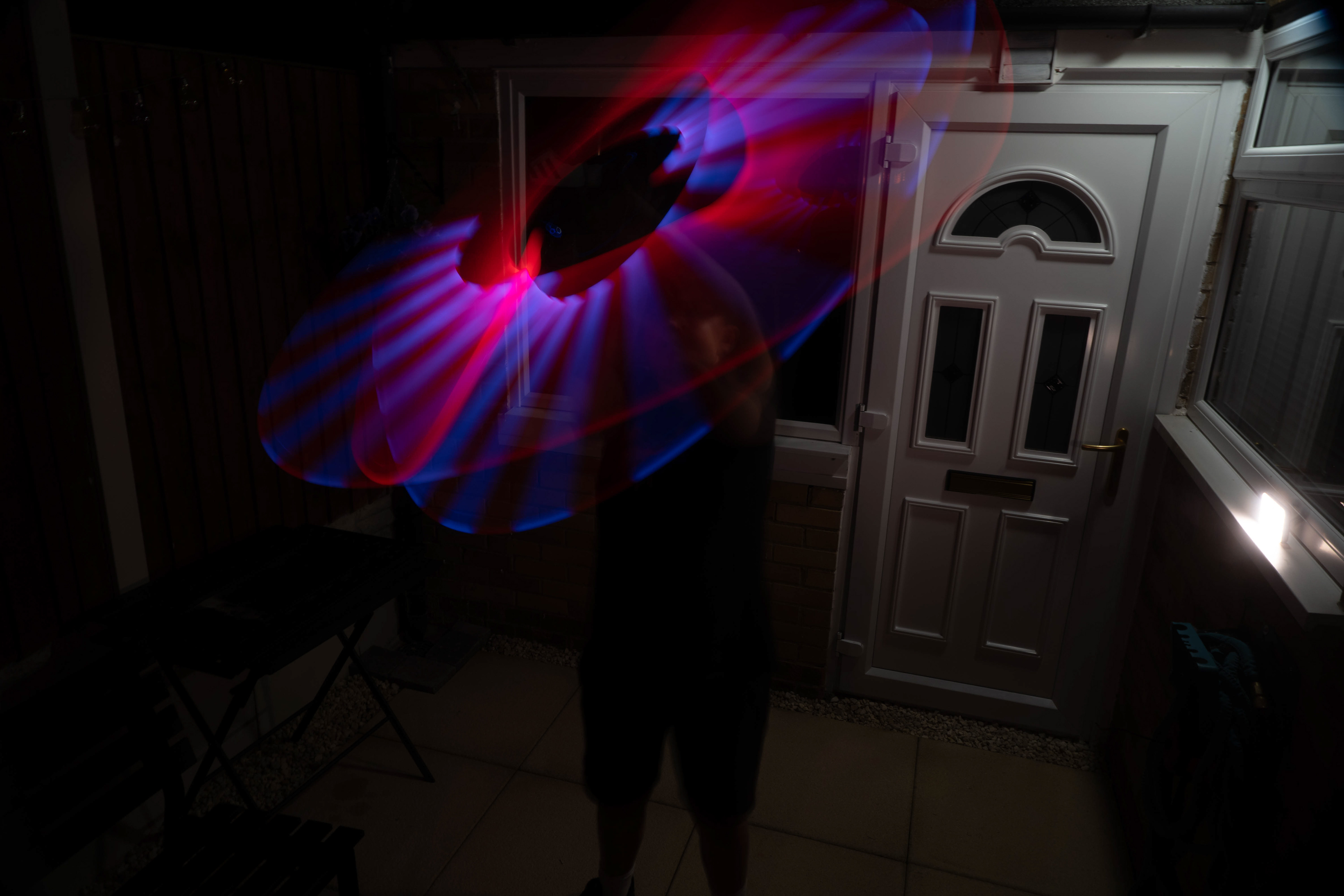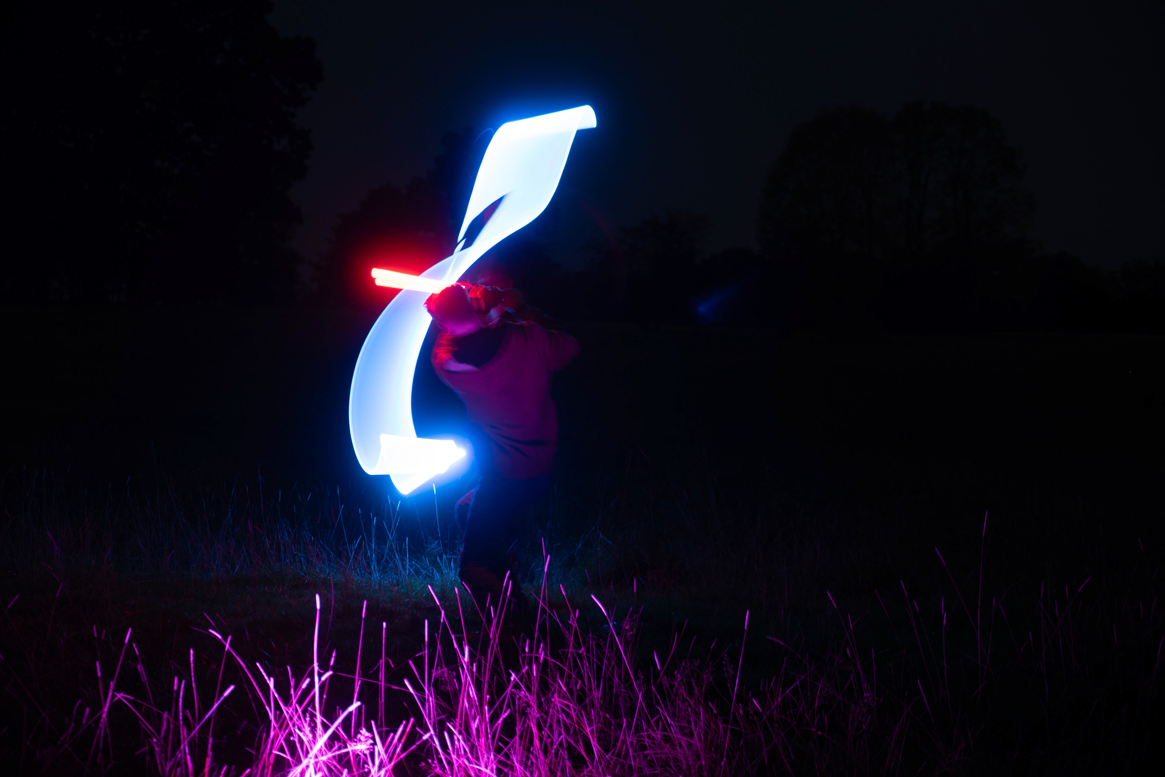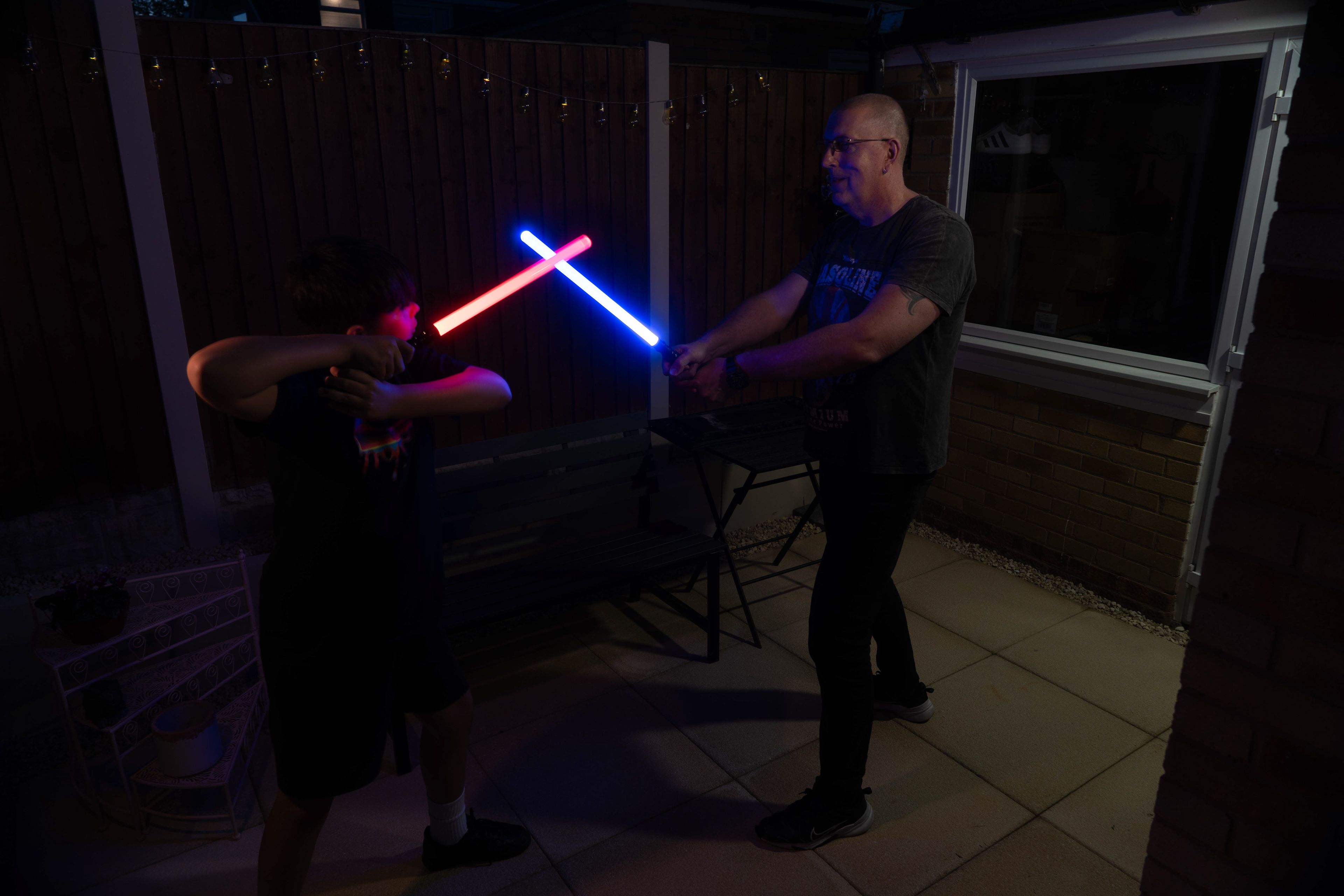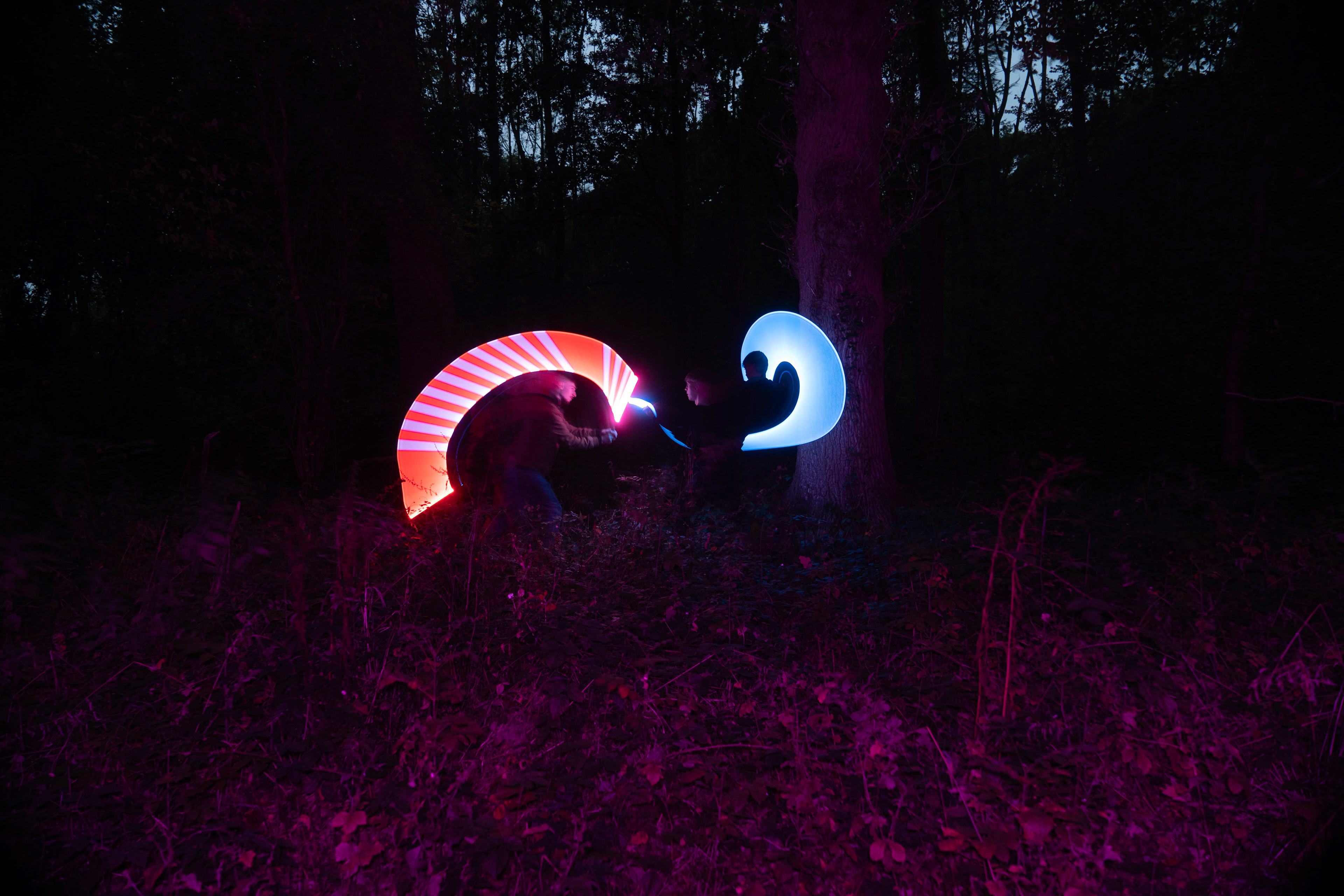 These images were taken in my back garden with my brother and dad. this is a series of images showing a fight scene inspired by star wars. all of these photos are taken on a long exposure time of around a second with lights placed camera left and right to light the subjects and surrounding area so that not only the lightsabers can be seen. the first image shows the start of the "fight" and shows the 2 subjects with their blades touching, this photo was taken on --1 second-- with the models slightly moving their lightsabers to create a wider effect of light- this is not a feature i will be using in future progressions of this as I feel it takes stability away from the photo. the red light from the lightsaber is hitting the subjects face illuminating him in a red shade which could be inferred as making him more "evil" in this situation, his elbow is also rim lit by the light behind. the subject camera right is lit a lot by a light off screen showing he is the "good" guy as he is not shrowded in darkness like the other.