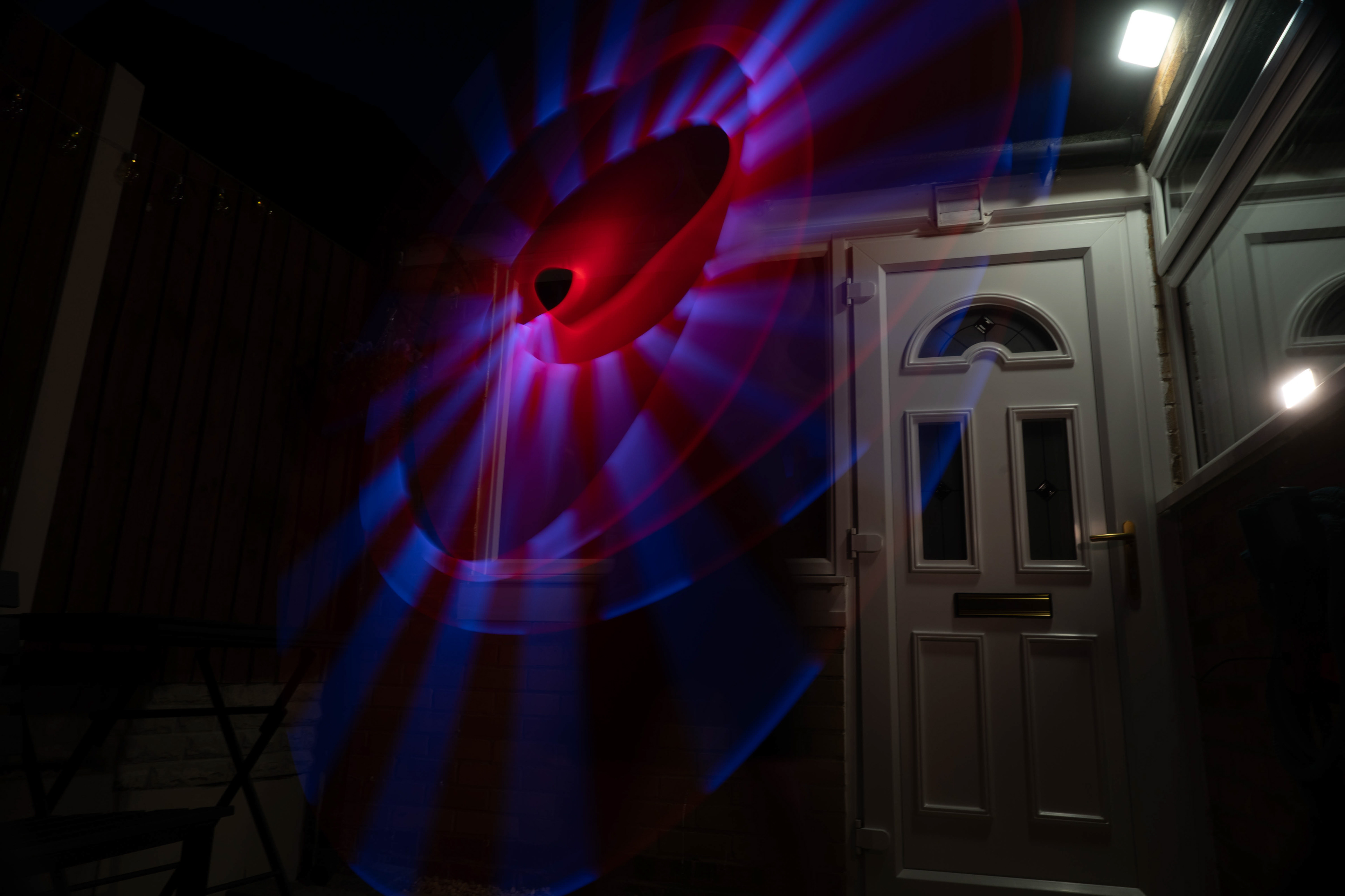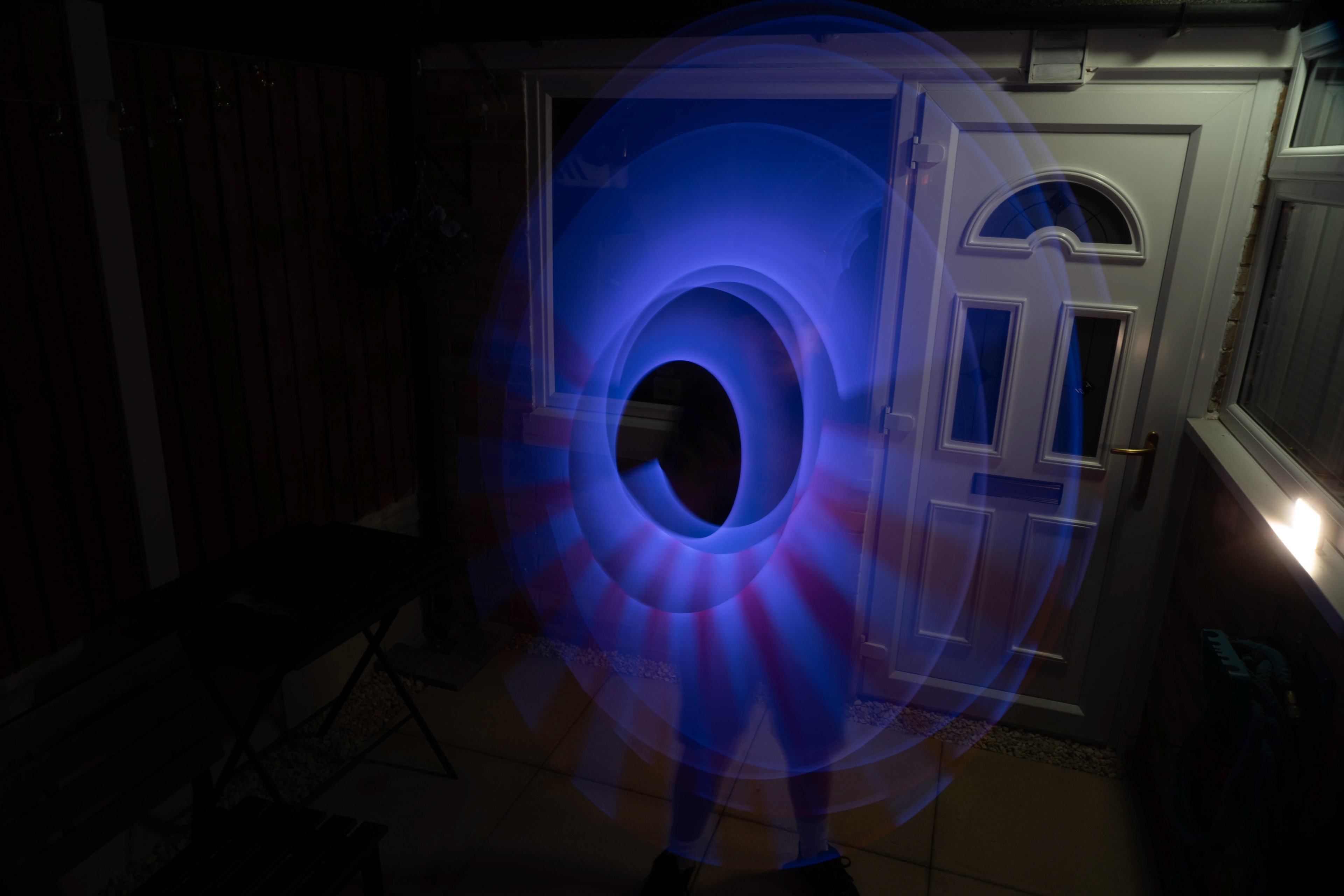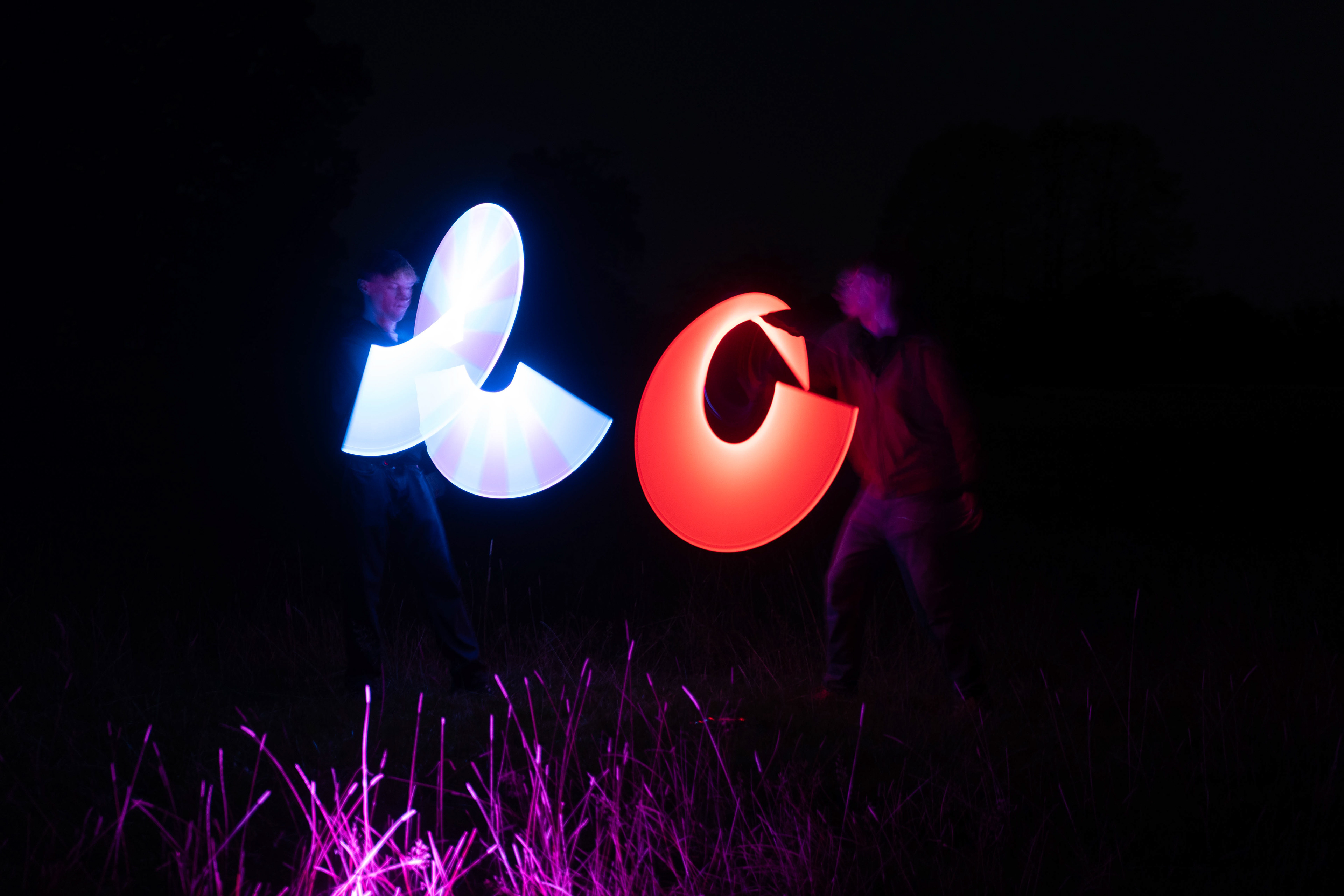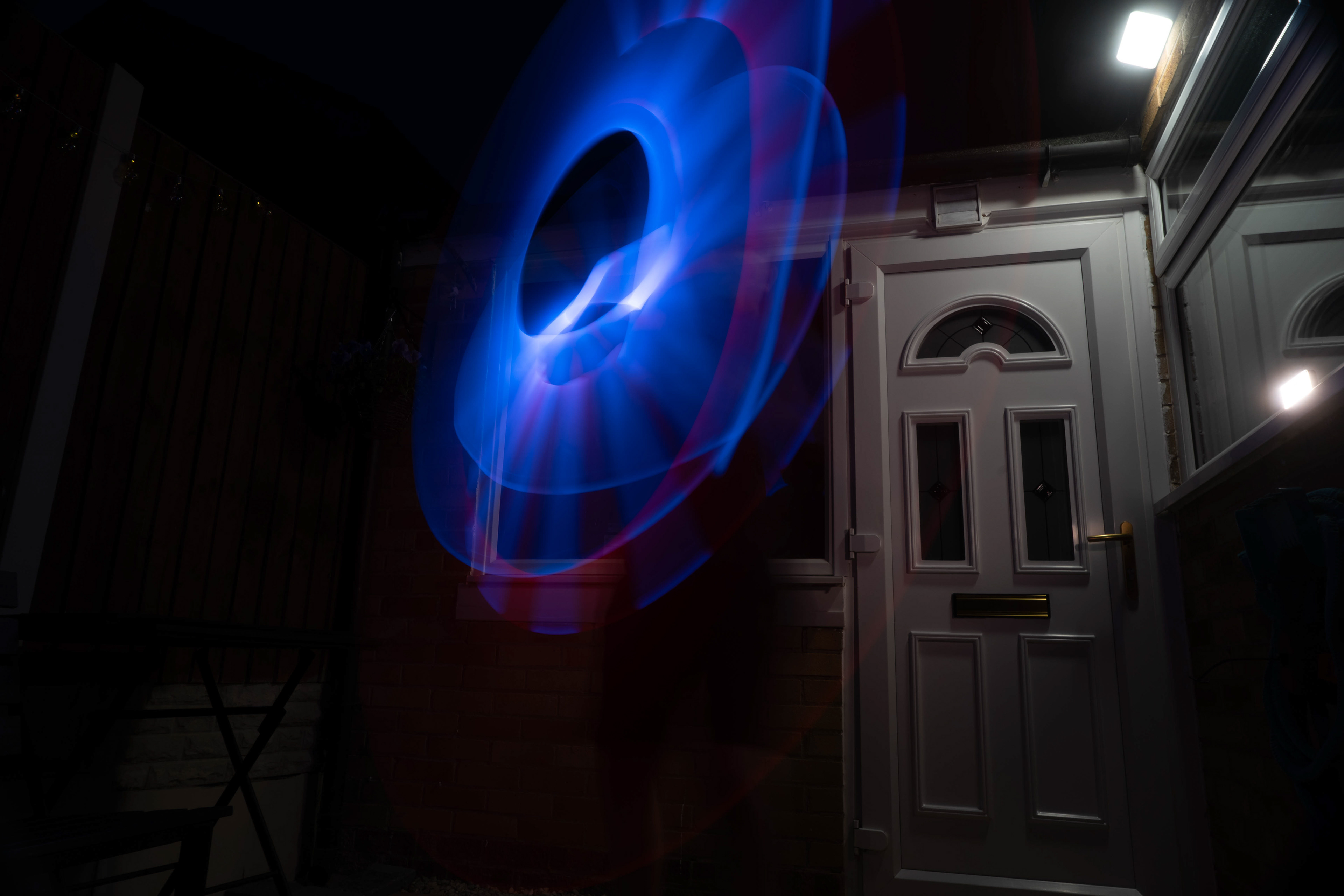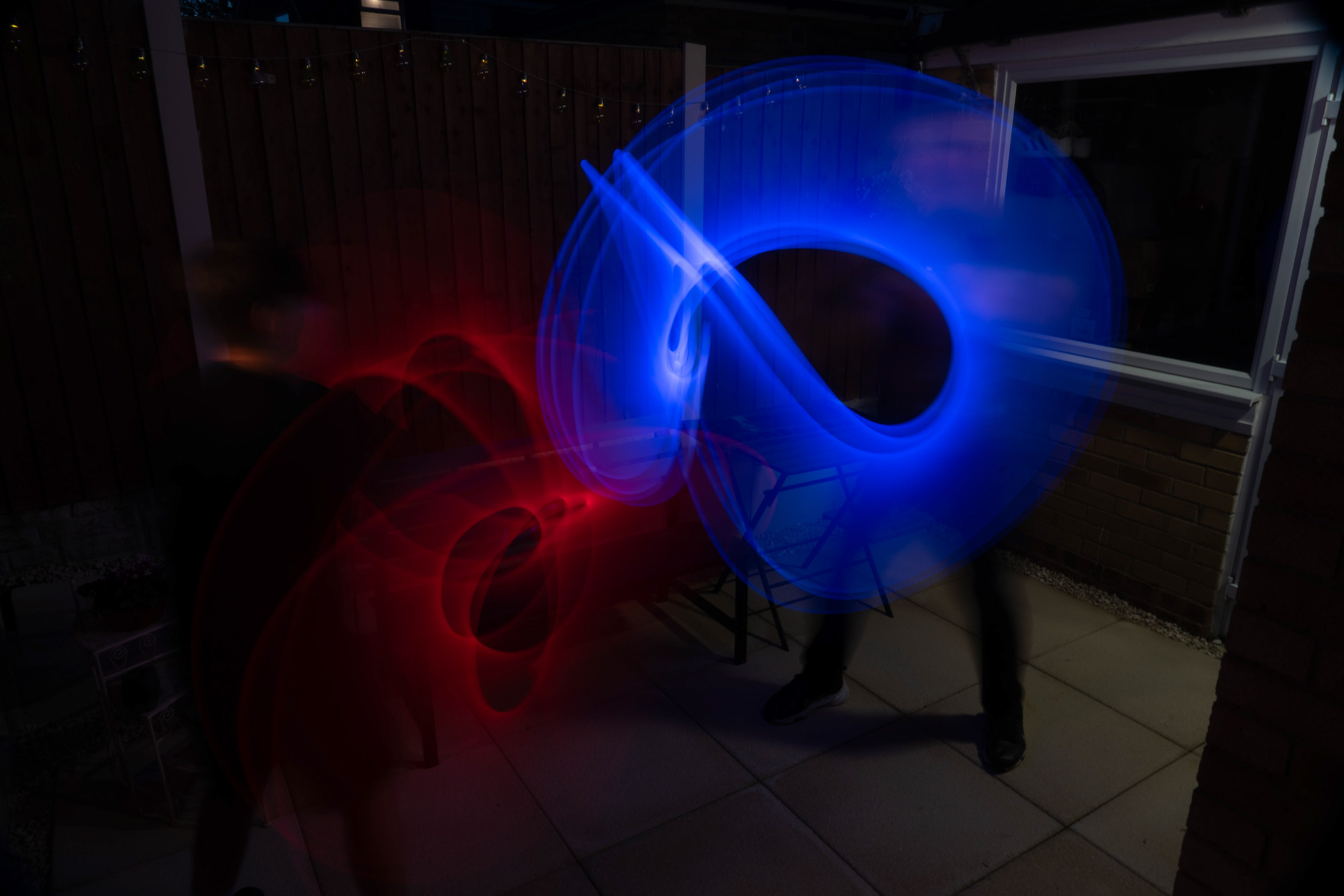 These images were taken in my back garden with my brother and dad. this is a series of images showing a fight scene inspired by star wars. all of these photos are taken on a long exposure time of around a second with lights placed camera left and right to light the subjects and surrounding area so that not only the lightsabers can be seen. the first image shows the start of the "fight" and shows the 2 subjects with their blades touching, this photo was taken on --1 second-- with the models slightly moving their lightsabers to create a wider effect of light- this is not a feature i will be using in future progressions of this as I feel it takes stability away from the photo. the red light from the lightsaber is hitting the subjects face illuminating him in a red shade which could be inferred as making him more "evil" in this situation, his elbow is also rim lit by the light behind. the subject camera right is lit a lot by a light off screen showing he is the "good" guy as he is not shrowded in darkness like the other.