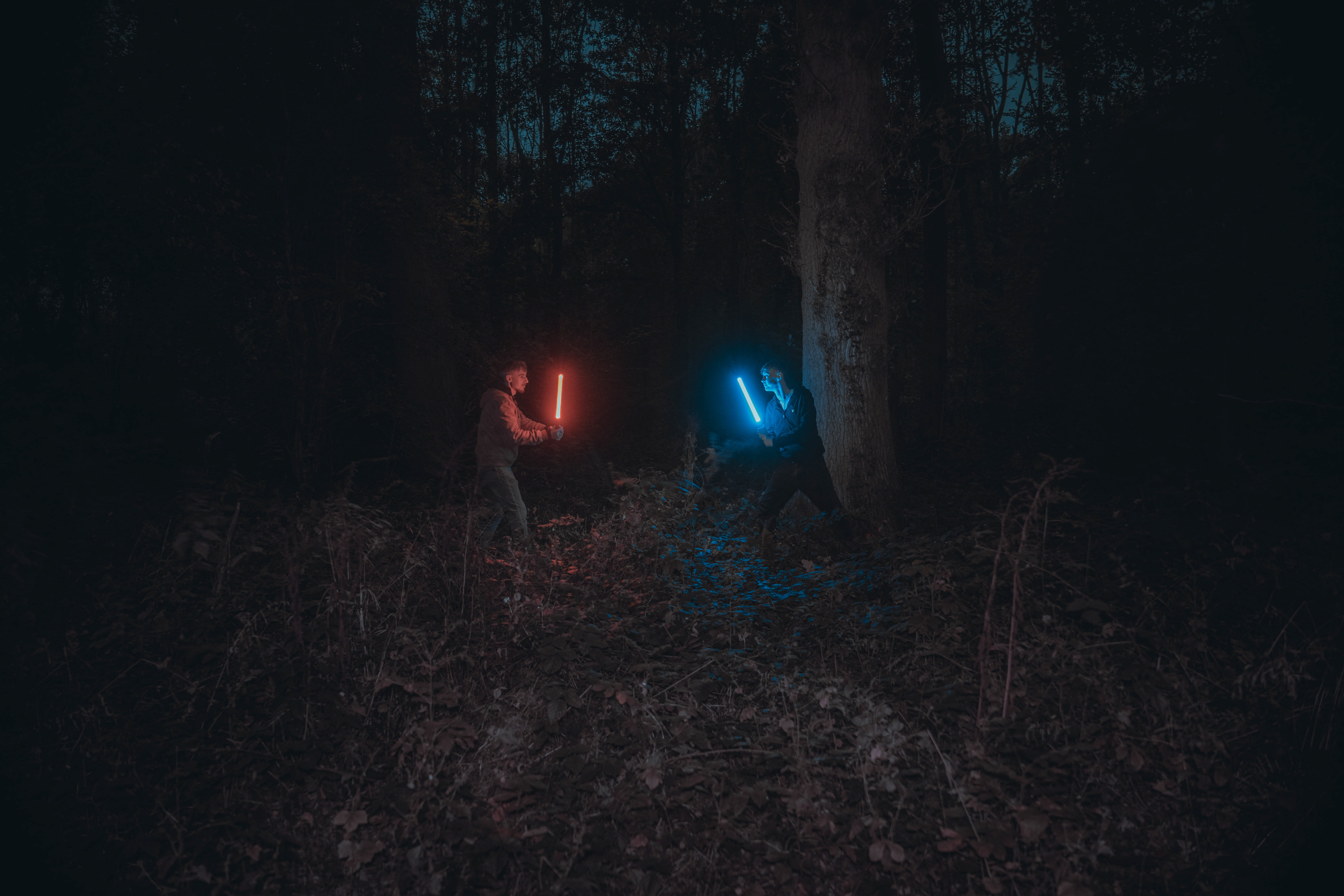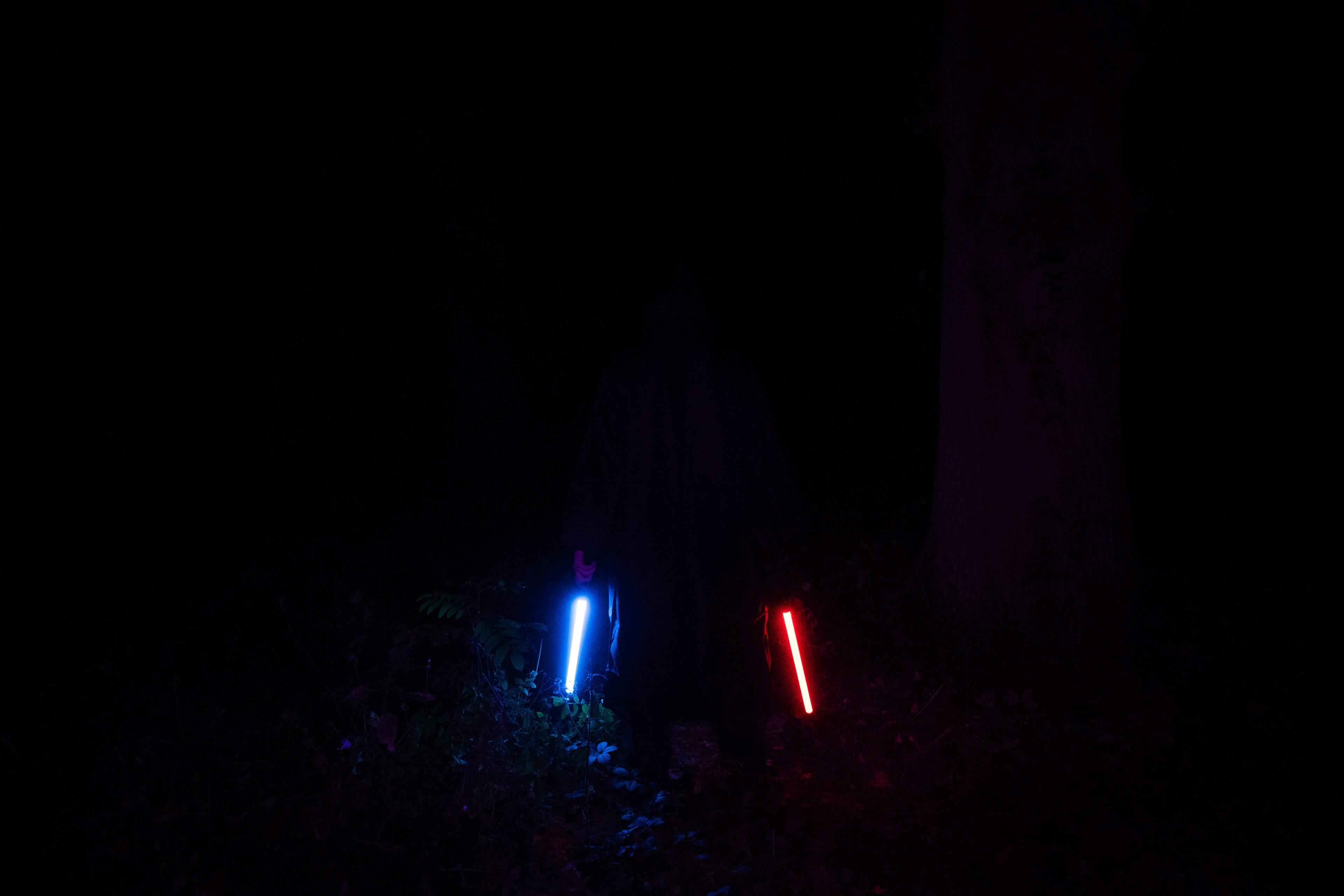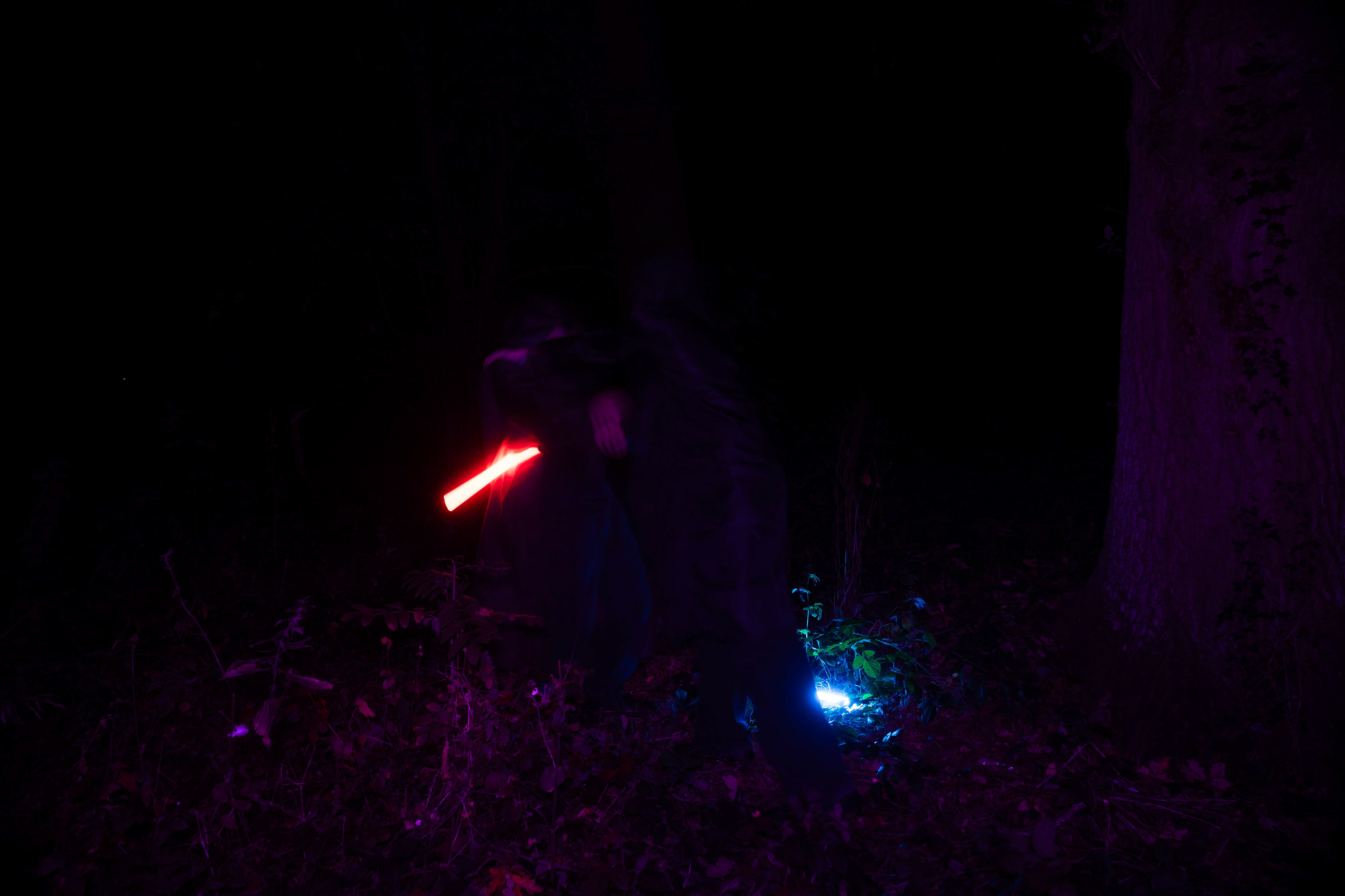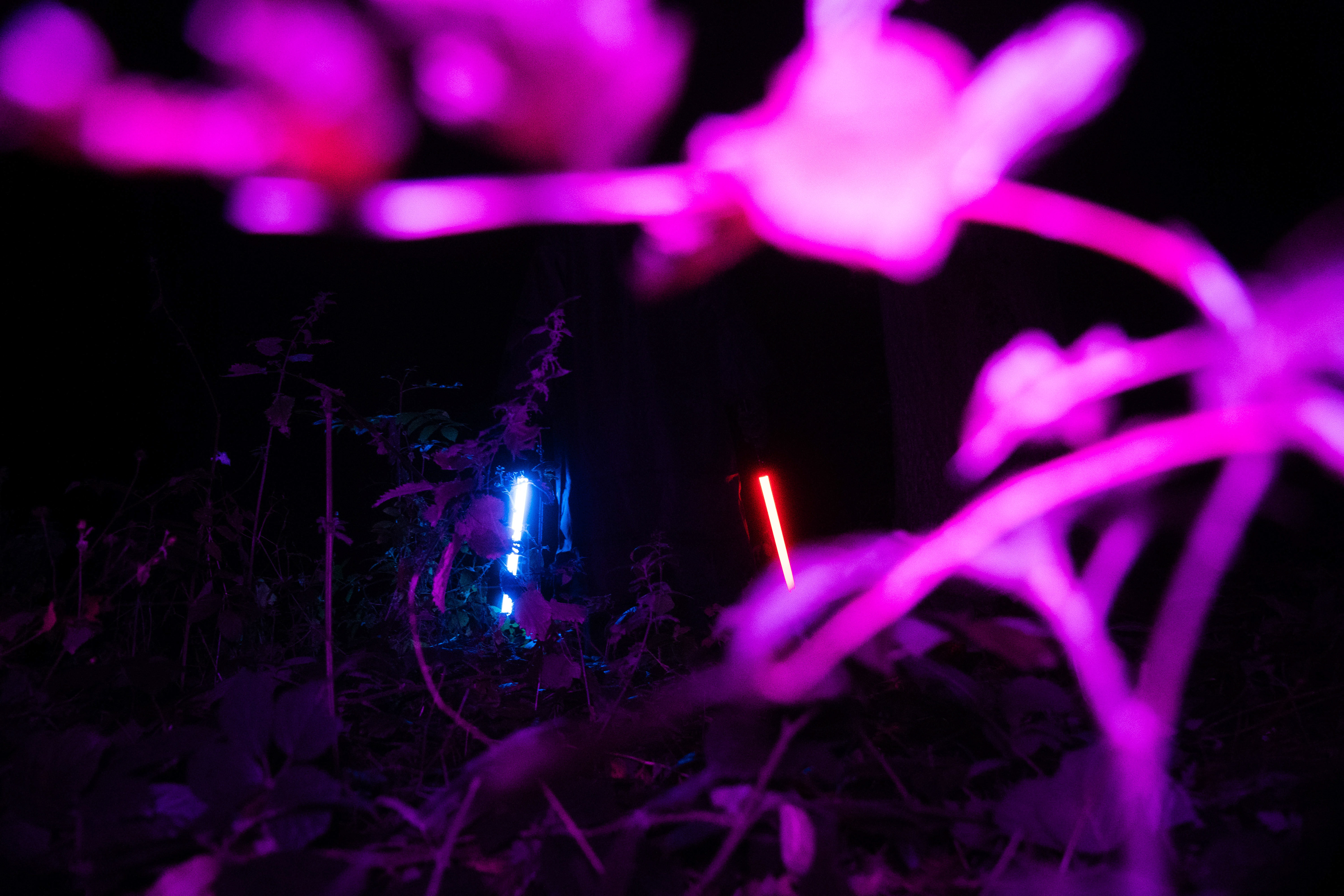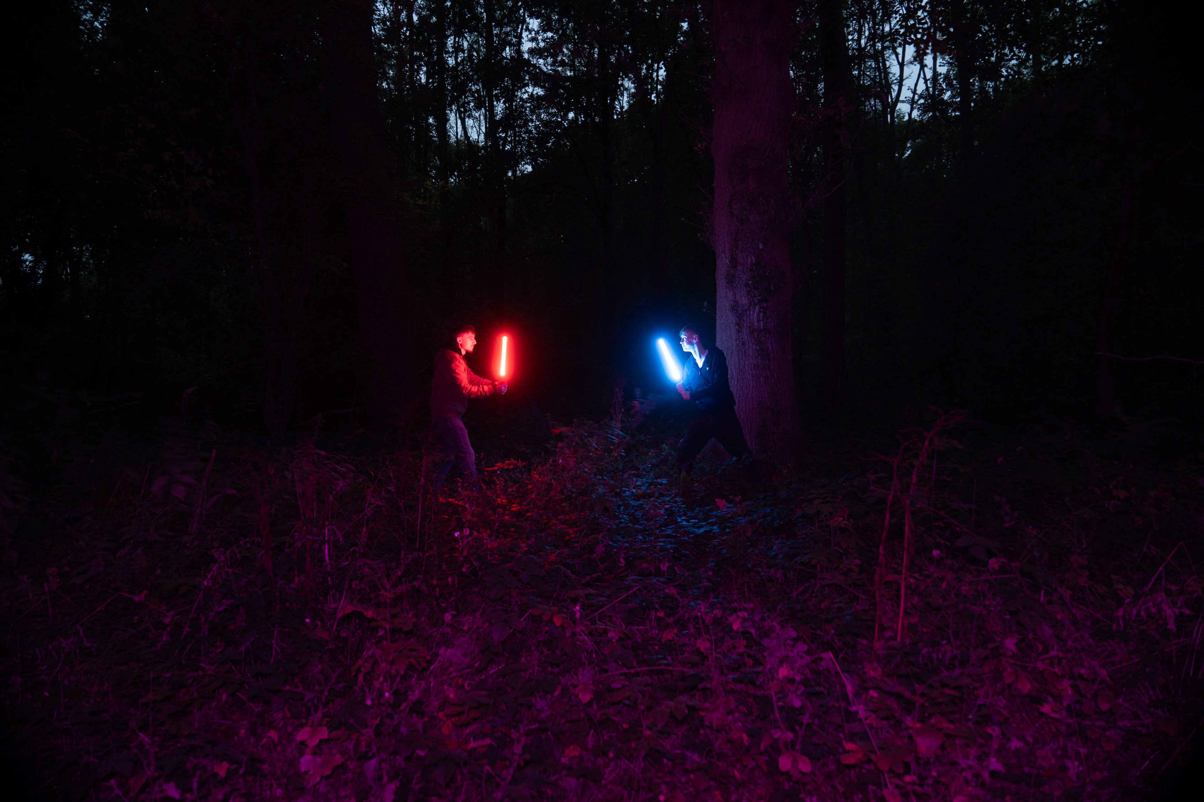 For this sequence of photos I took a similar idea but took it out to a forest location to give the look of a star wars planet. for these photos I added a black mist diffusion filter to the camera to create the look i attempted on the first image from the previous set. this means that the light sabers get more of a glowing effect around the direct light source, this adds a more "cinematic" feel to the lighting. all these photos were lit with a rectangular "aperture mc" light on a pink setting, this allowed for the foreground and some of the background to be more visible in the dark location. in post I created a desaturated look but I feel the use of the pink still helps lighting and can be seen slightly in some of the foreground leaves- i chose pink as I thought it would create a more "sci-fi" look but later felt it was too much and a more cinematic look worked better for this set.