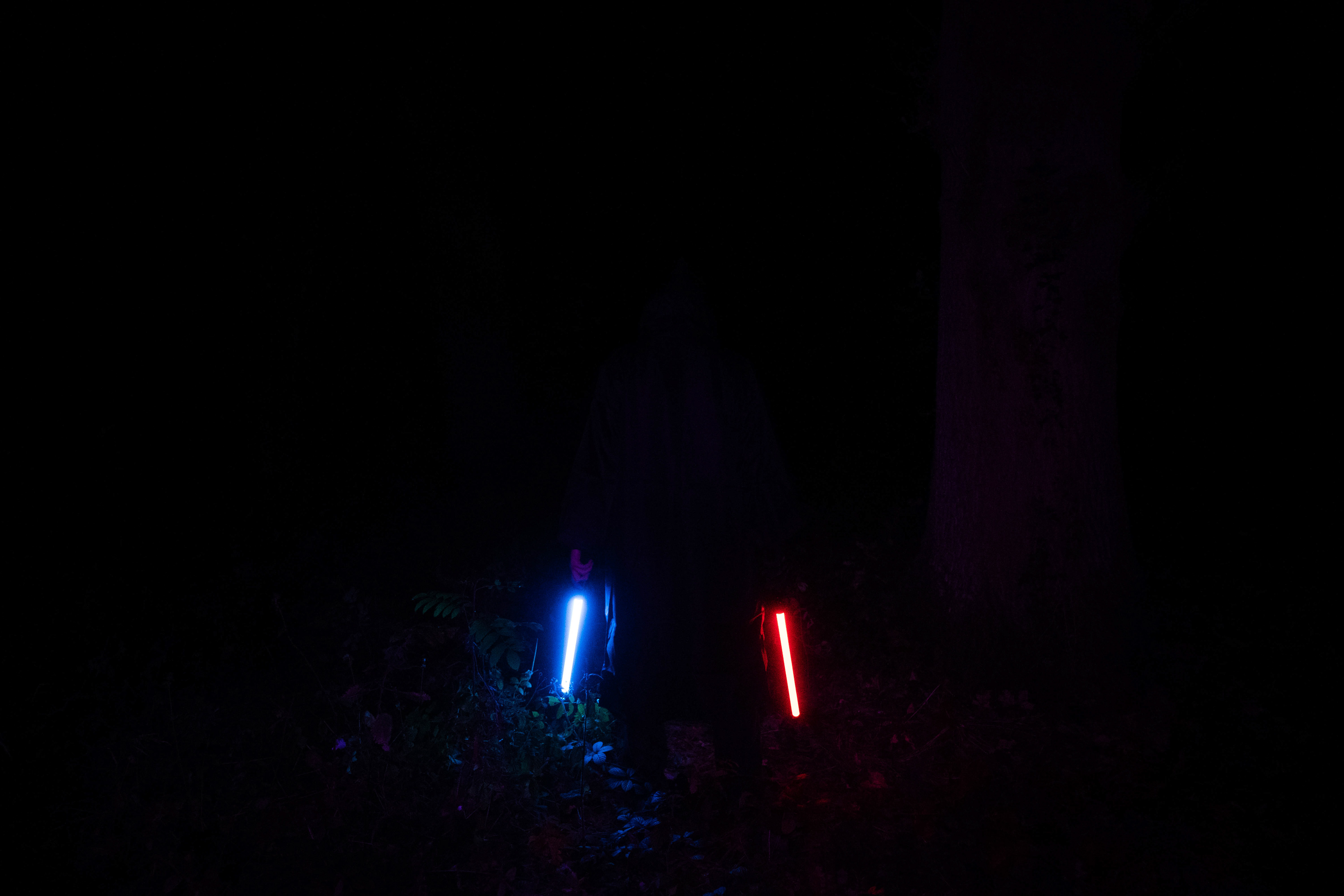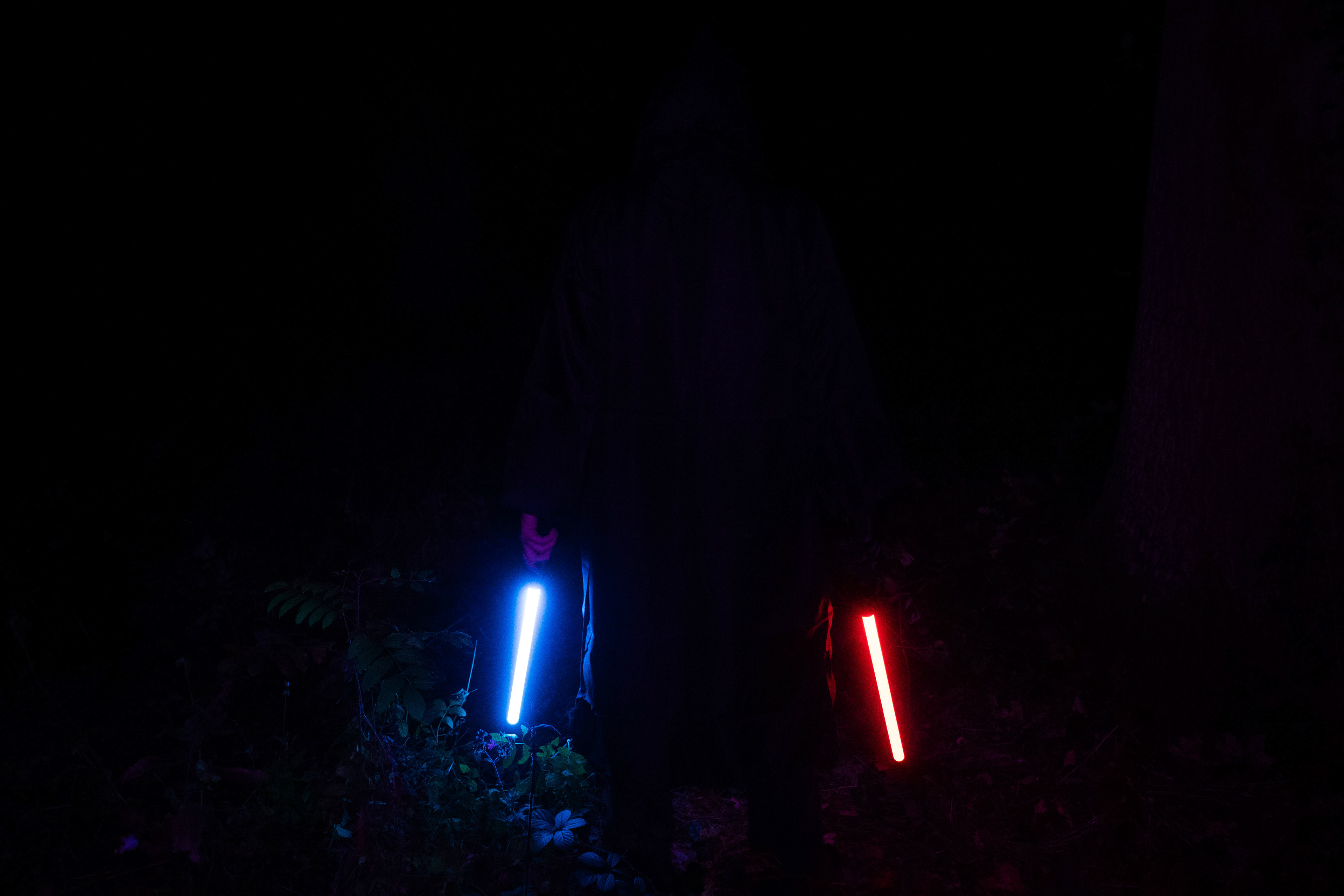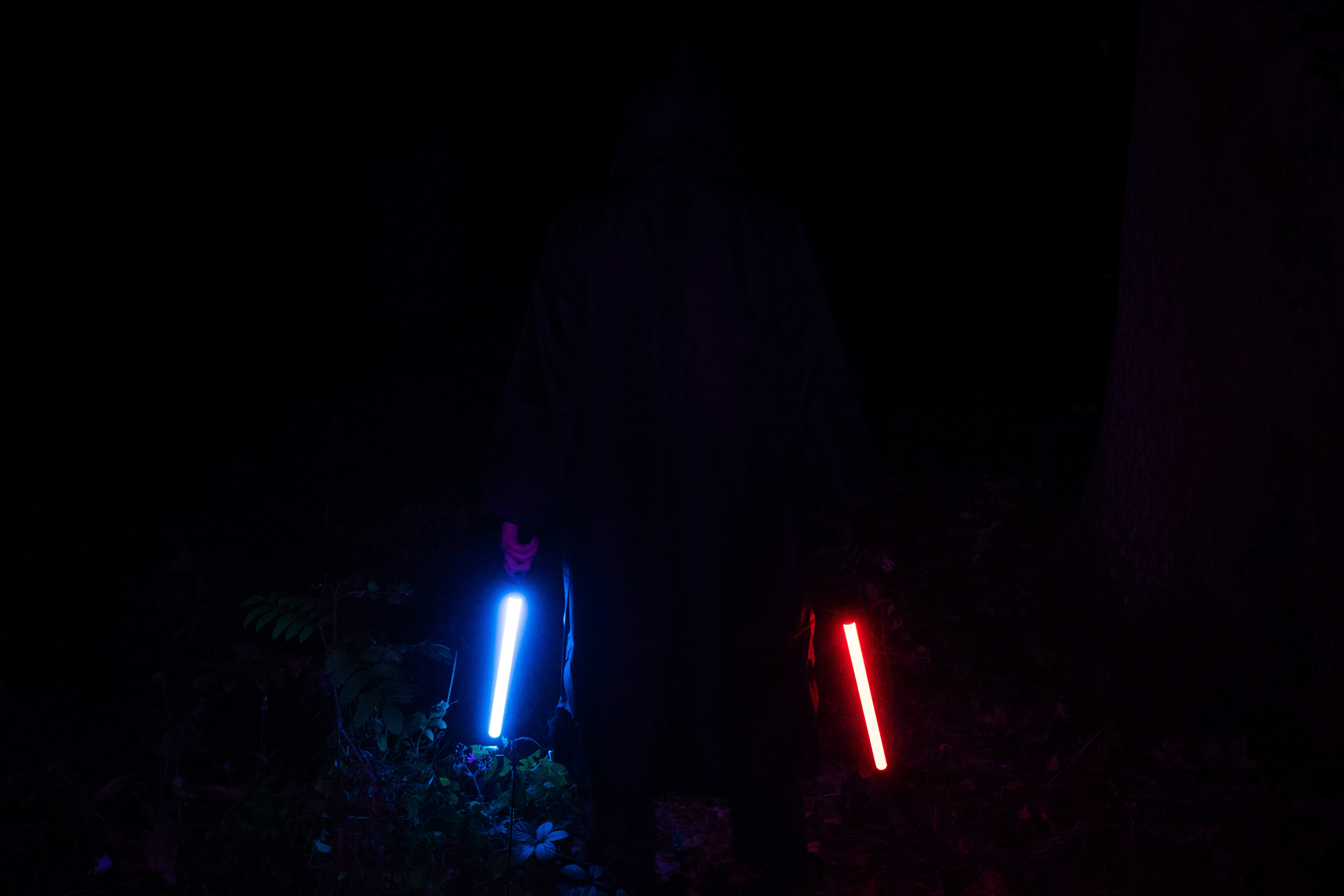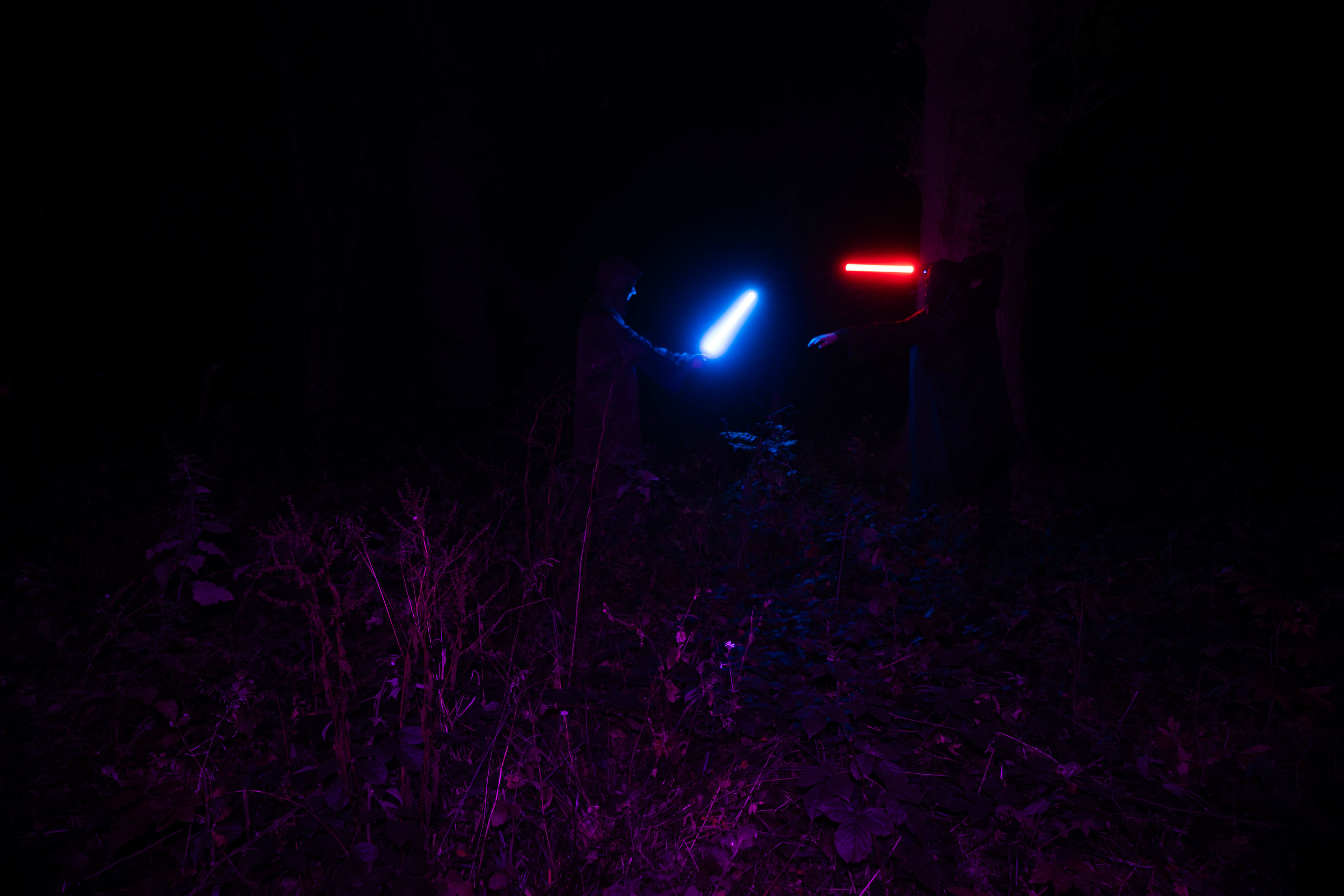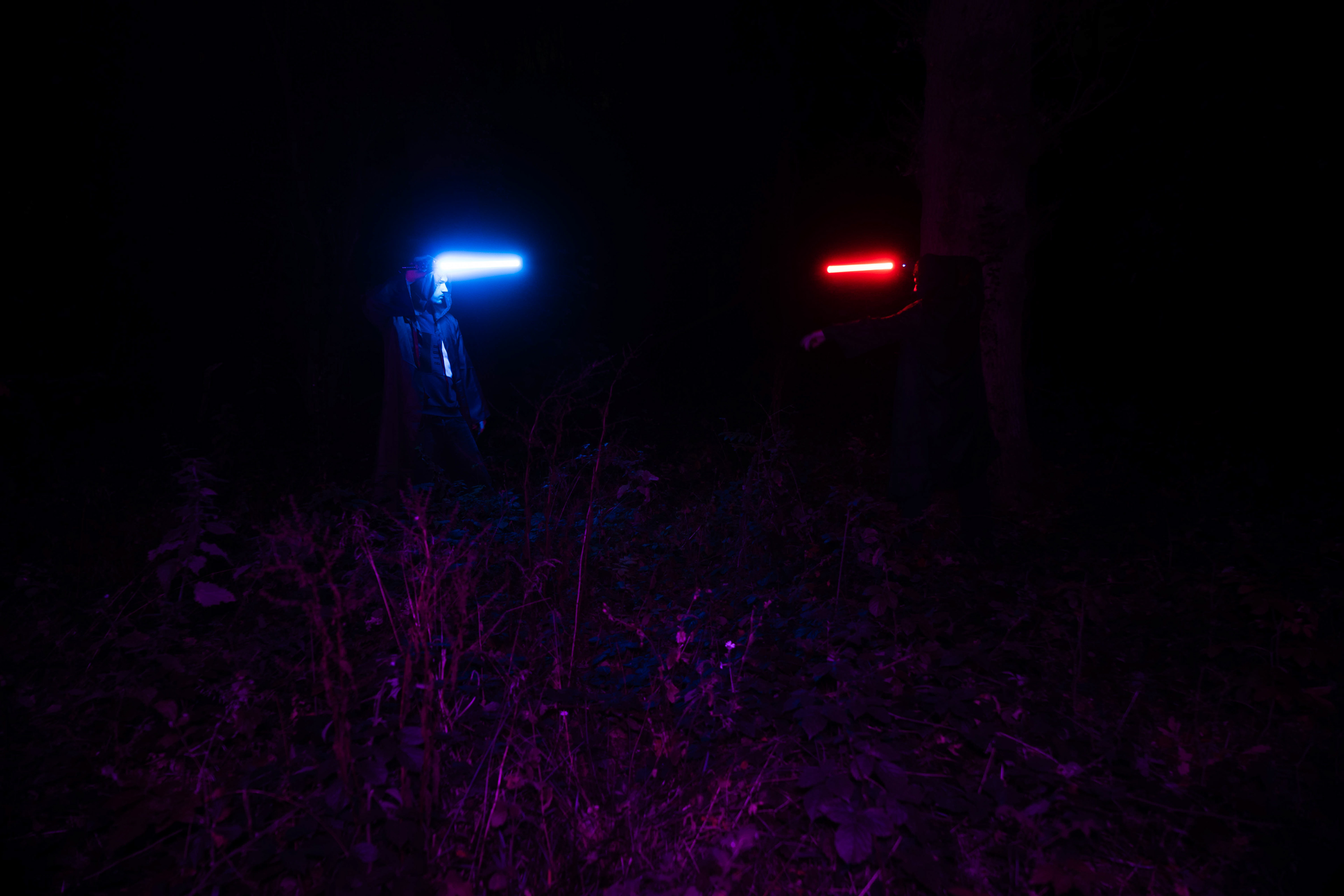 For this sequence of photos I took a similar idea but took it out to a forest location to give the look of a star wars planet. for these photos I added a black mist diffusion filter to the camera to create the look i attempted on the first image from the previous set. this means that the light sabers get more of a glowing effect around the direct light source, this adds a more "cinematic" feel to the lighting. all these photos were lit with a rectangular "aperture mc" light on a pink setting, this allowed for the foreground and some of the background to be more visible in the dark location. in post I created a desaturated look but I feel the use of the pink still helps lighting and can be seen slightly in some of the foreground leaves- i chose pink as I thought it would create a more "sci-fi" look but later felt it was too much and a more cinematic look worked better for this set.