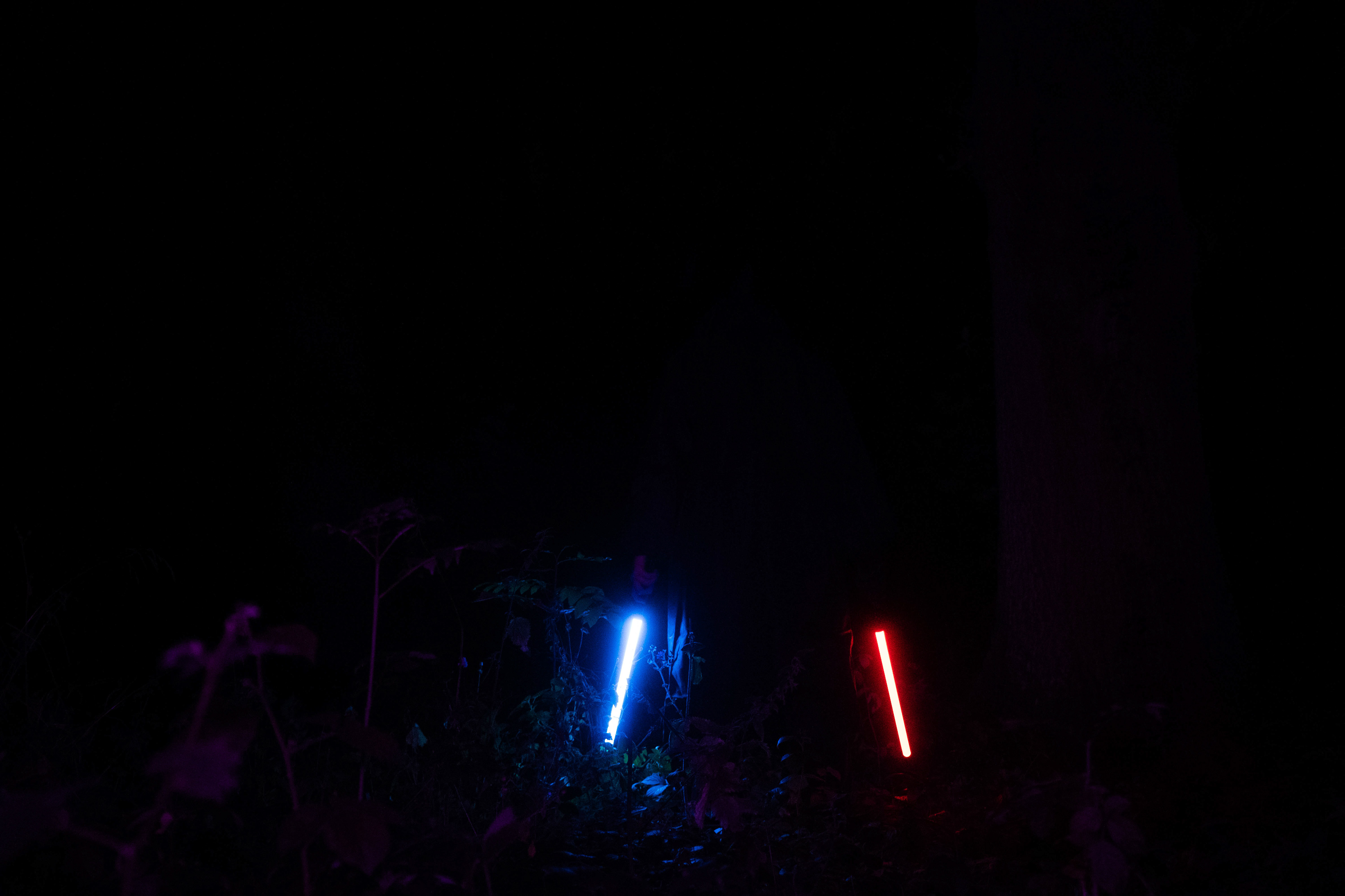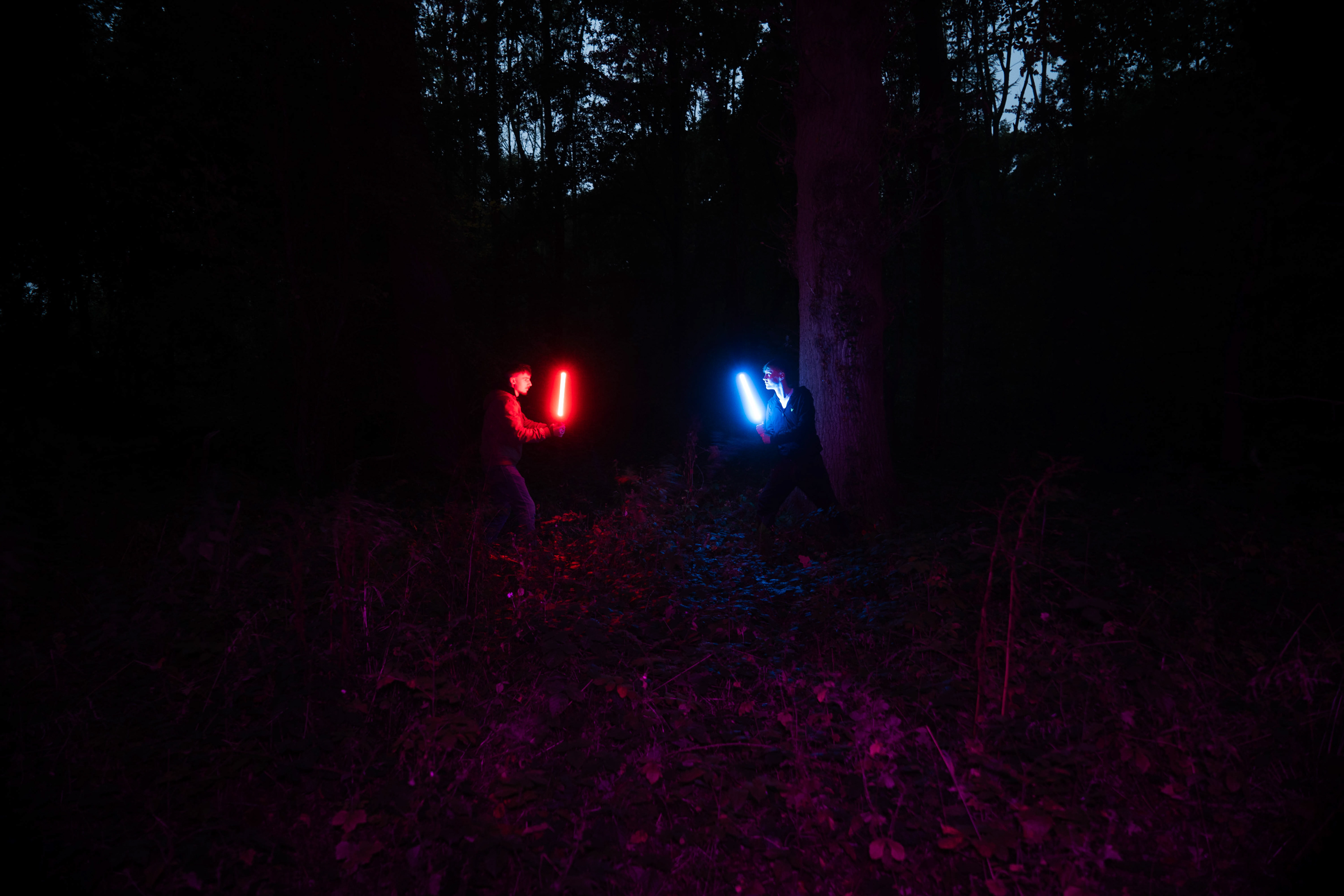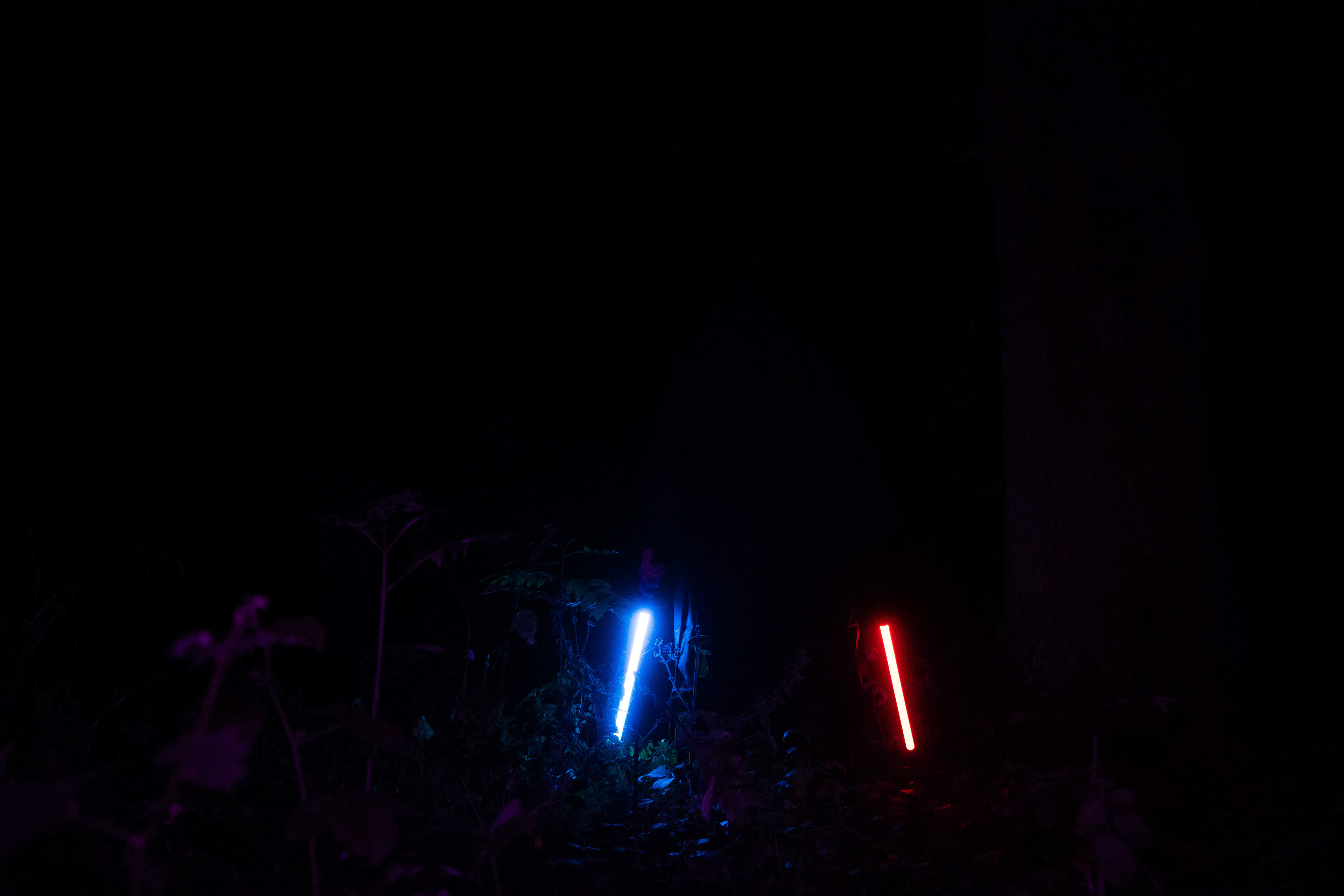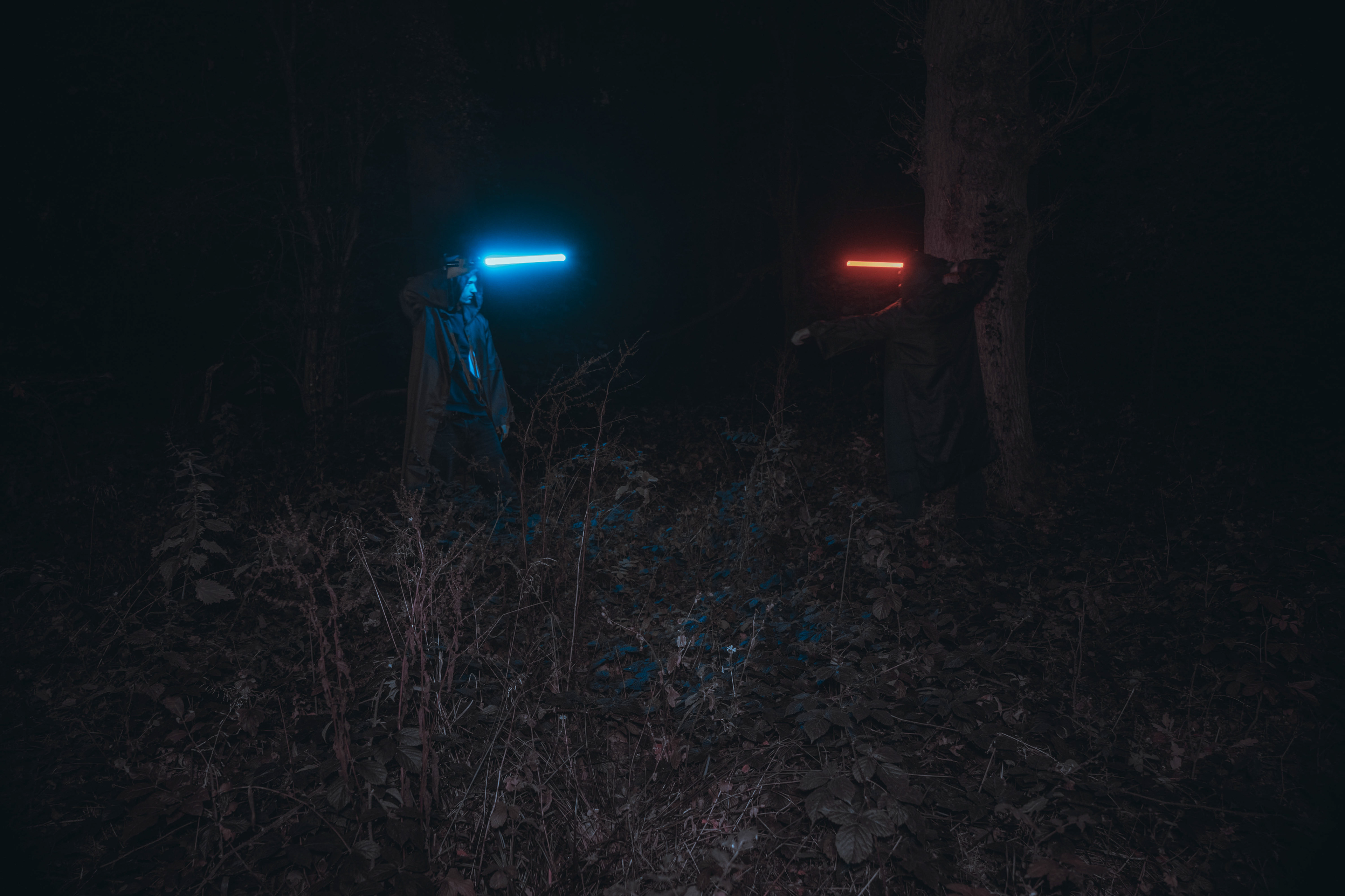 For this sequence of photos I took a similar idea but took it out to a forest location to give the look of a star wars planet. for these photos I added a black mist diffusion filter to the camera to create the look i attempted on the first image from the previous set. this means that the light sabers get more of a glowing effect around the direct light source, this adds a more "cinematic" feel to the lighting. all these photos were lit with a rectangular "aperture mc" light on a pink setting, this allowed for the foreground and some of the background to be more visible in the dark location. in post I created a desaturated look but I feel the use of the pink still helps lighting and can be seen slightly in some of the foreground leaves- i chose pink as I thought it would create a more "sci-fi" look but later felt it was too much and a more cinematic look worked better for this set.