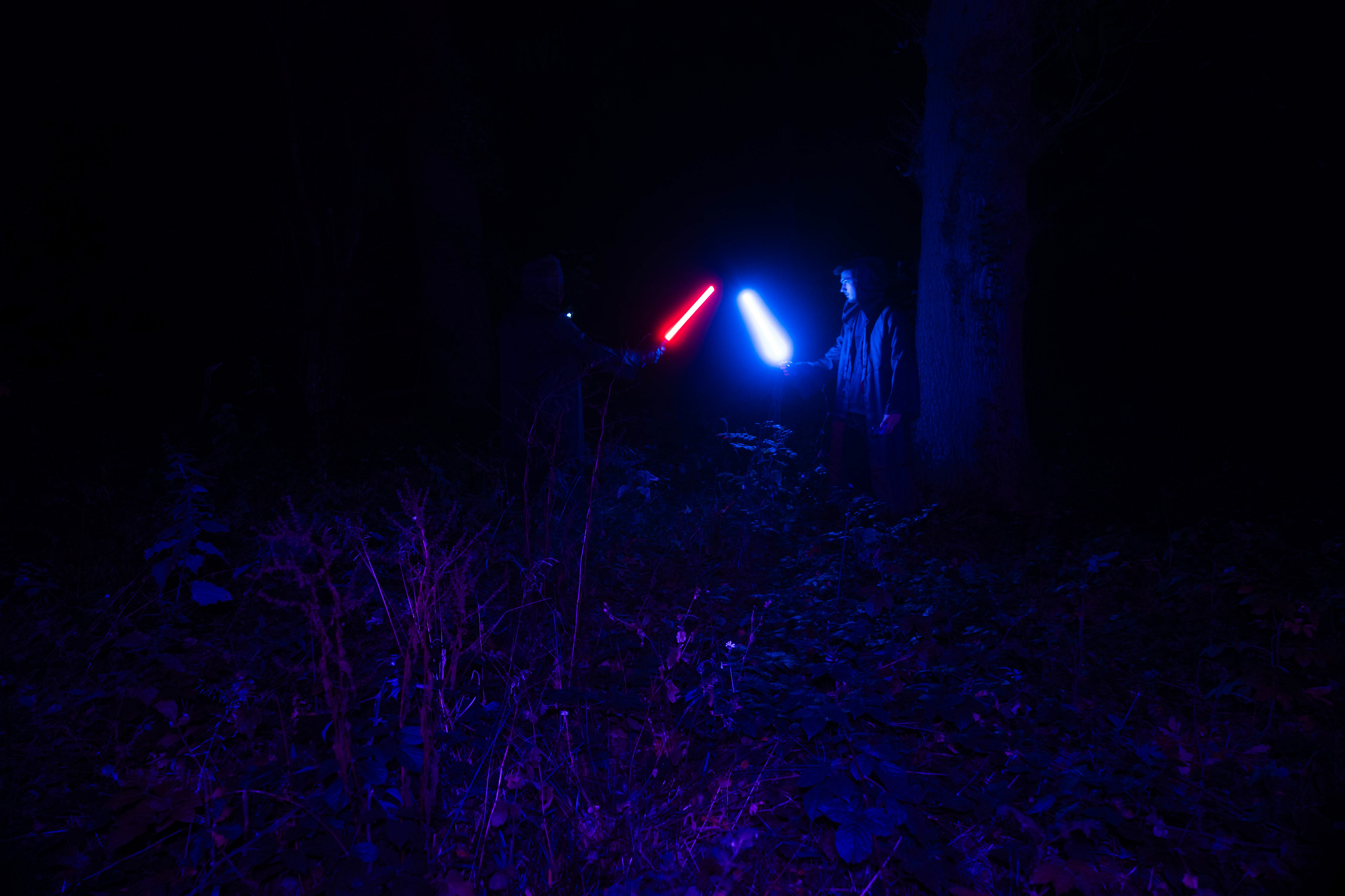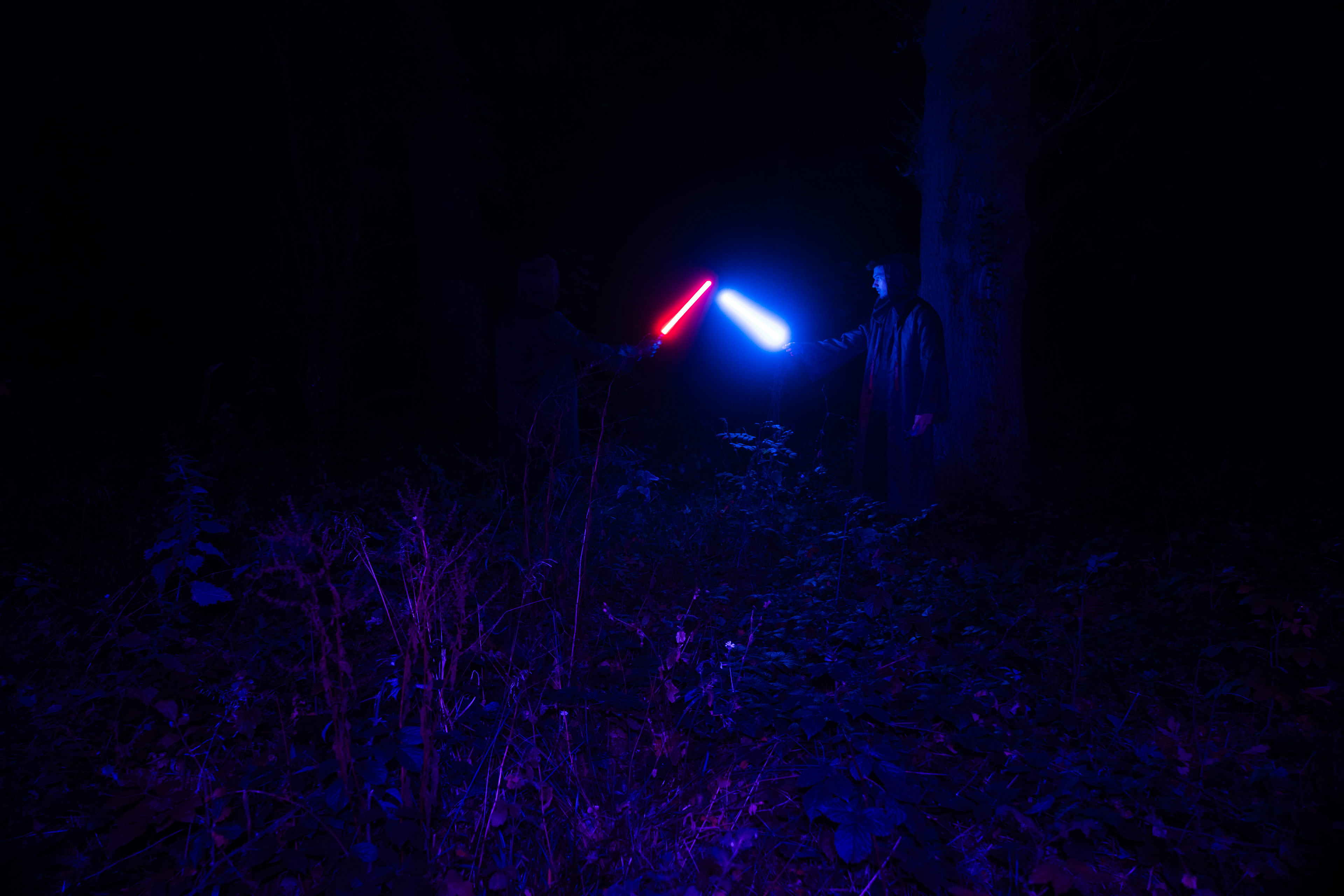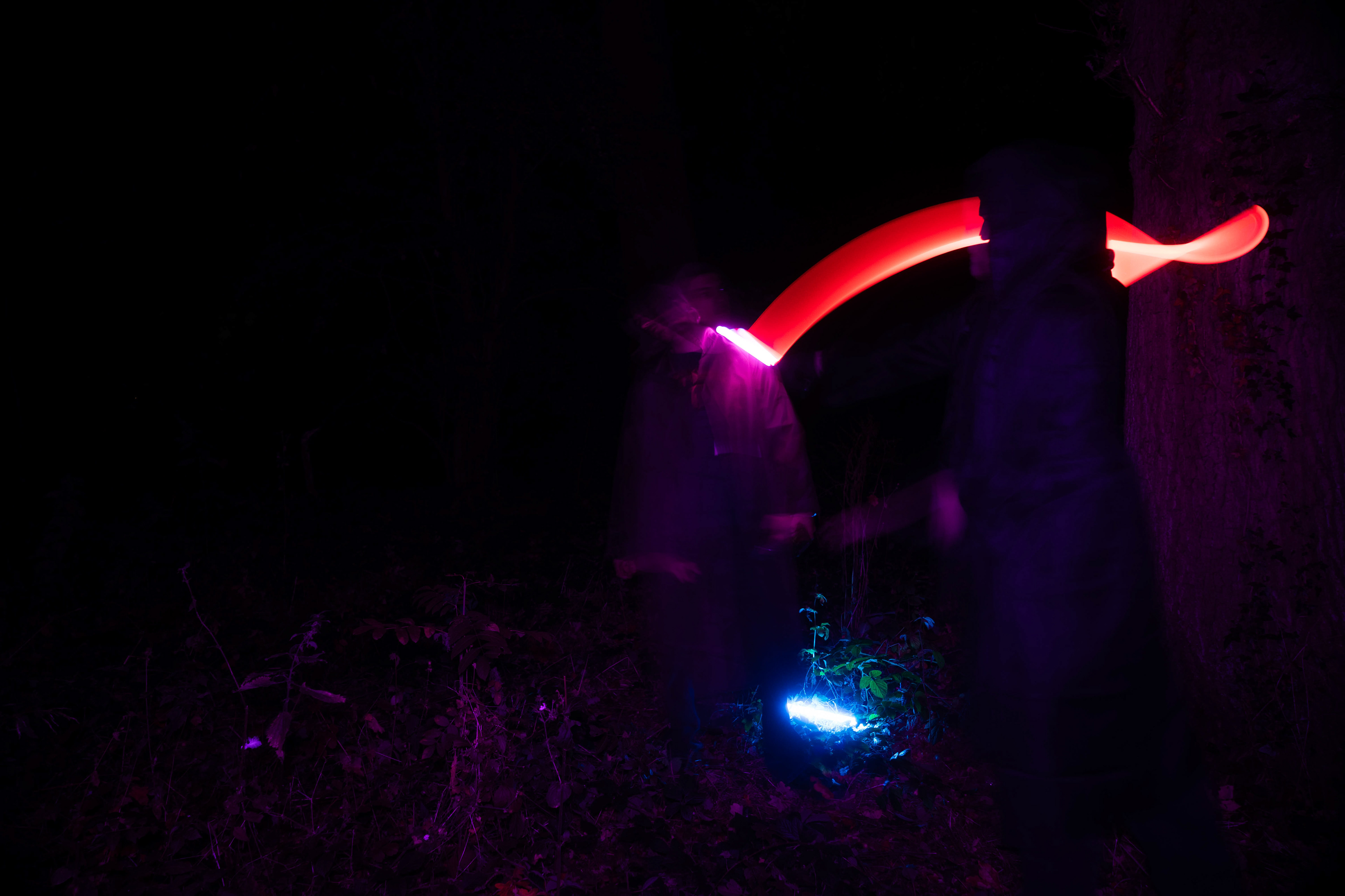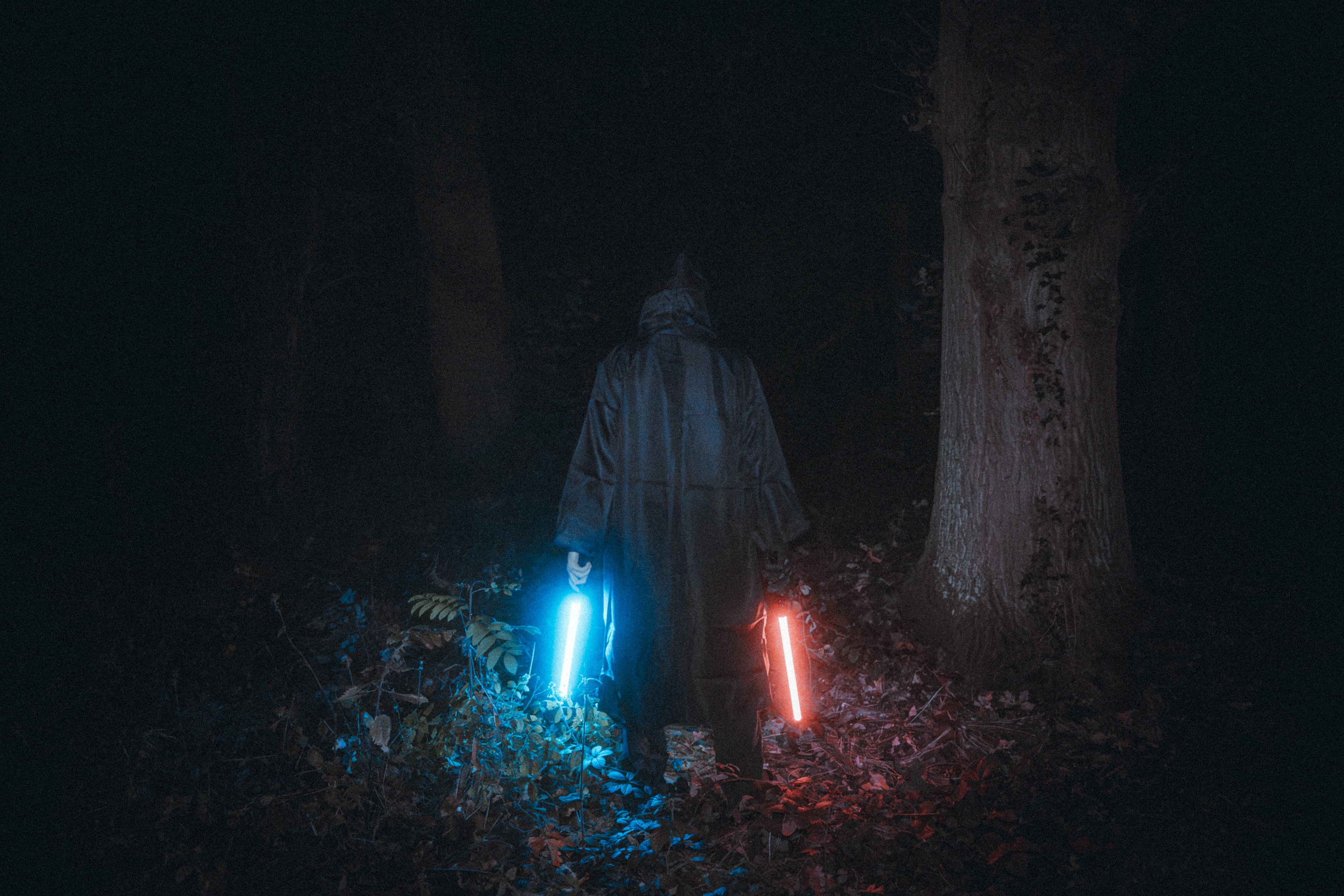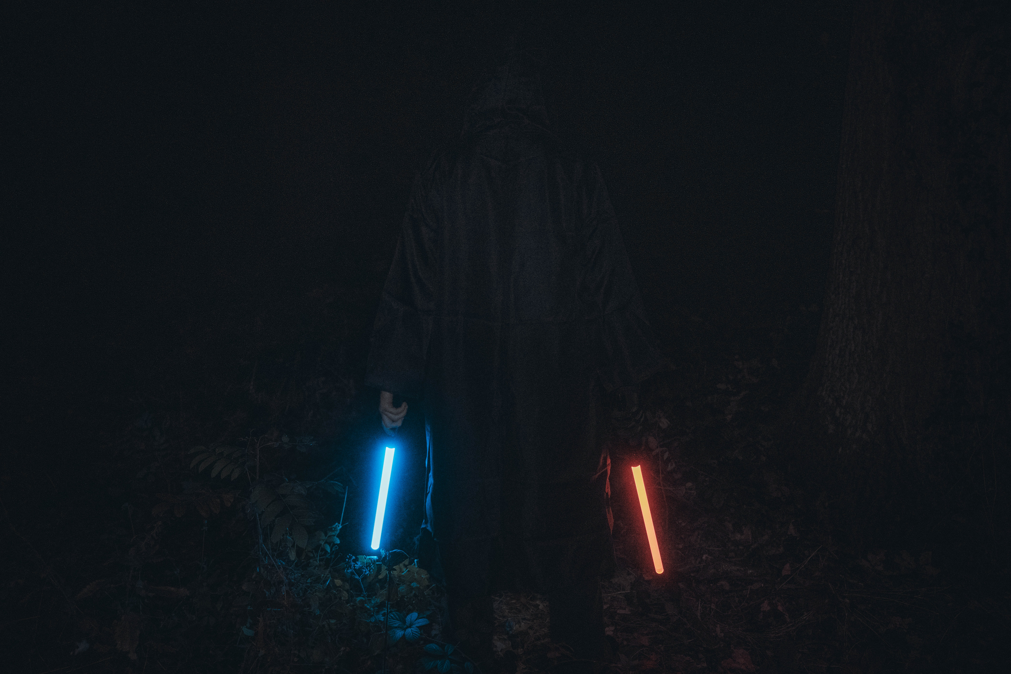 For this sequence of photos I took a similar idea but took it out to a forest location to give the look of a star wars planet. for these photos I added a black mist diffusion filter to the camera to create the look i attempted on the first image from the previous set. this means that the light sabers get more of a glowing effect around the direct light source, this adds a more "cinematic" feel to the lighting. all these photos were lit with a rectangular "aperture mc" light on a pink setting, this allowed for the foreground and some of the background to be more visible in the dark location. in post I created a desaturated look but I feel the use of the pink still helps lighting and can be seen slightly in some of the foreground leaves- i chose pink as I thought it would create a more "sci-fi" look but later felt it was too much and a more cinematic look worked better for this set.
