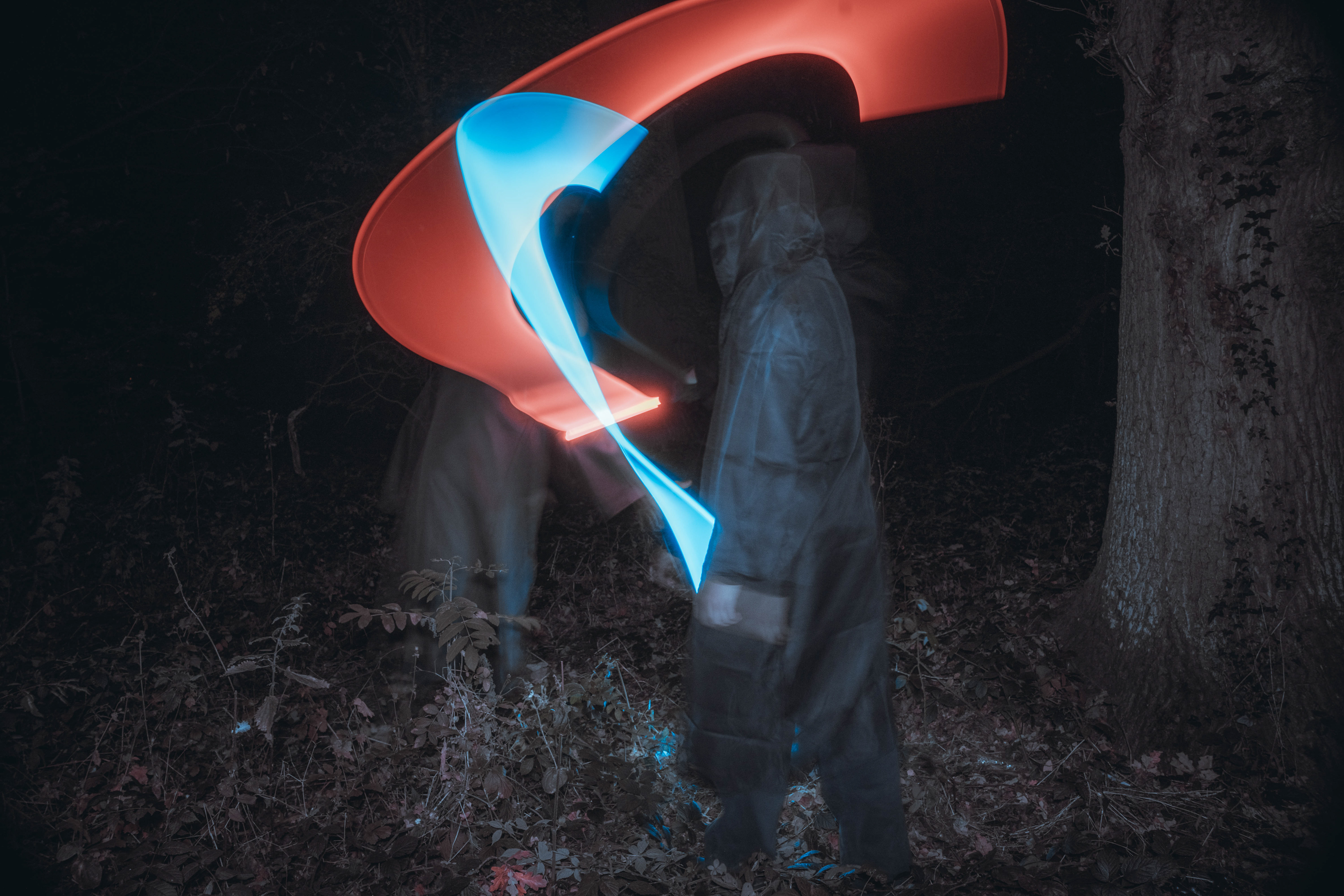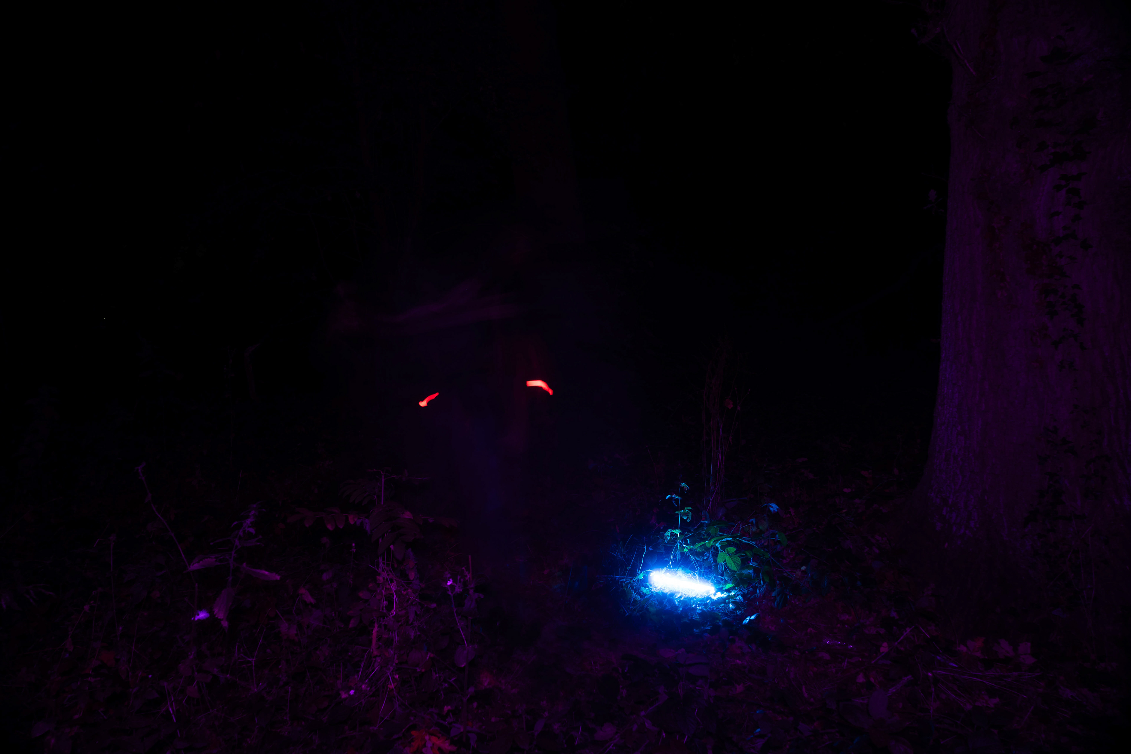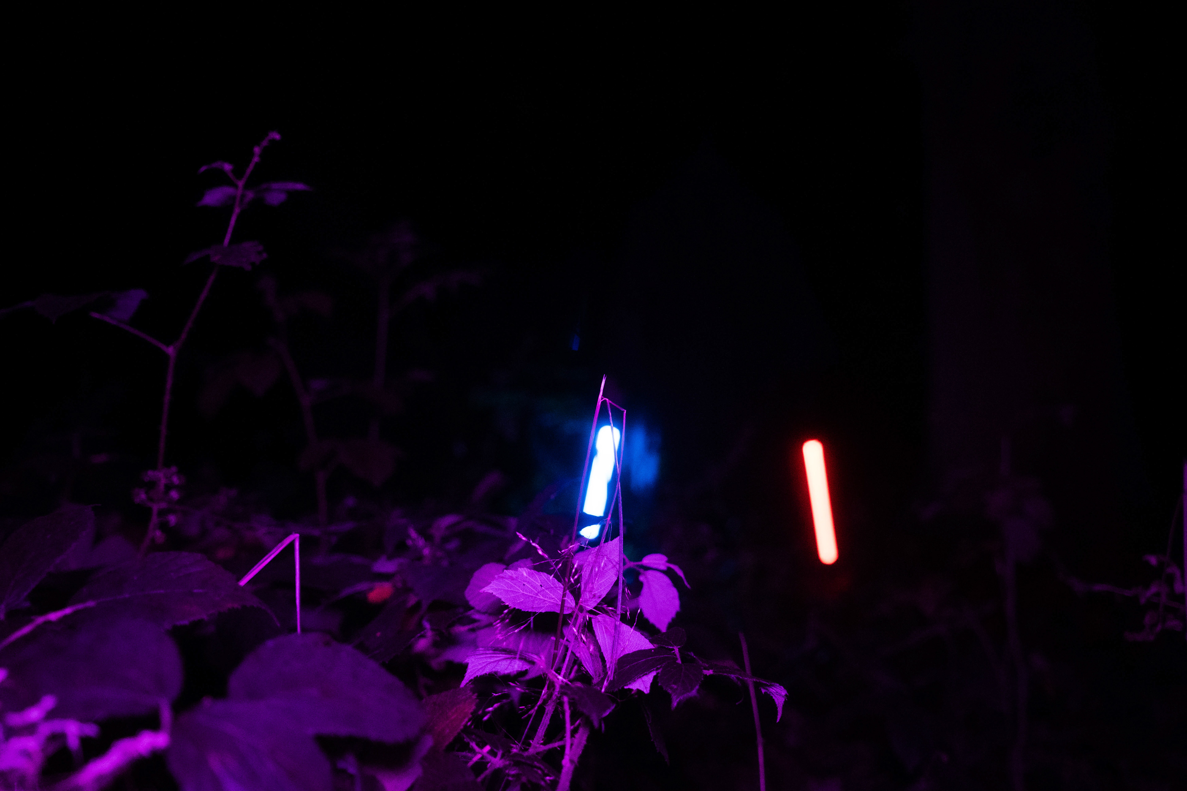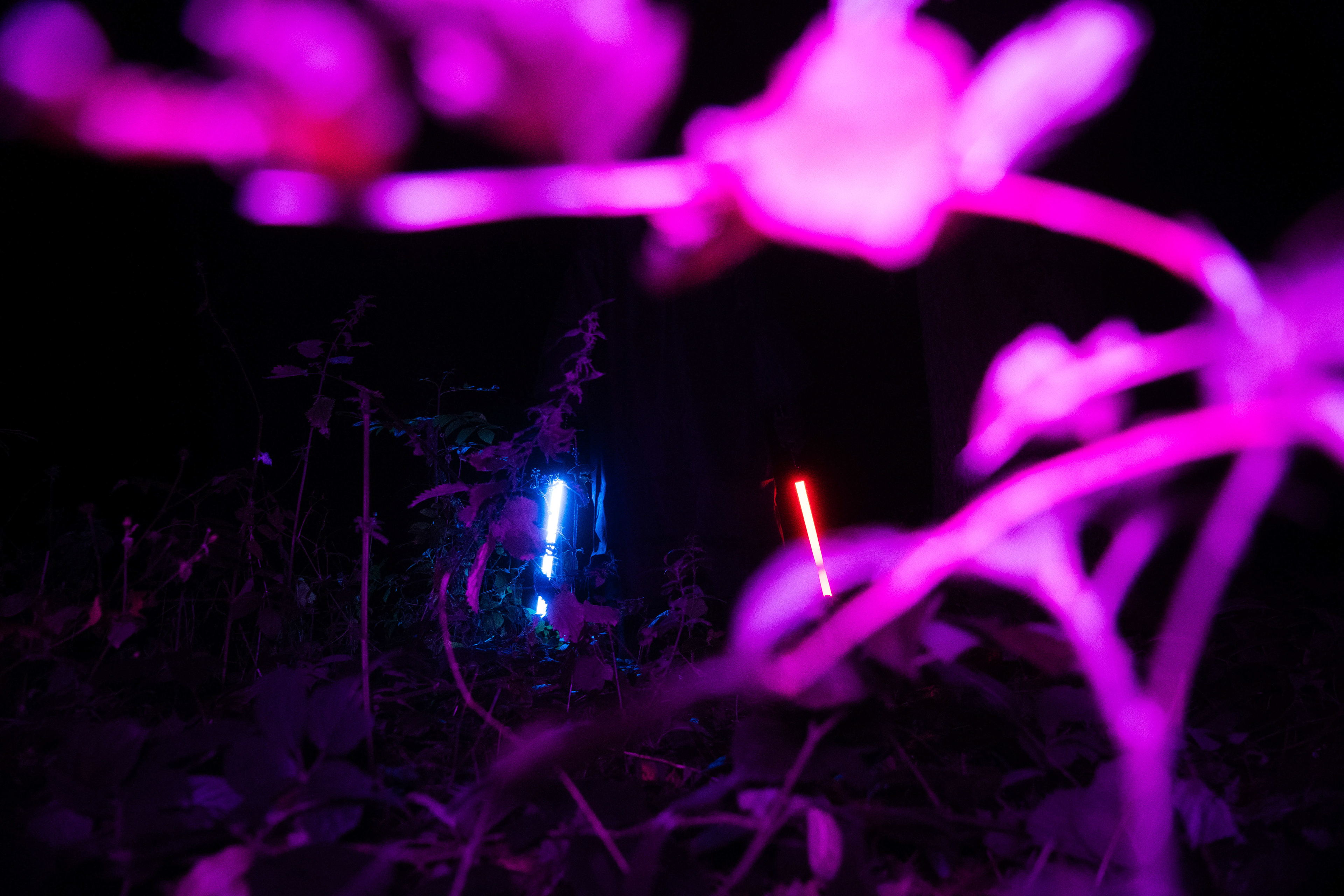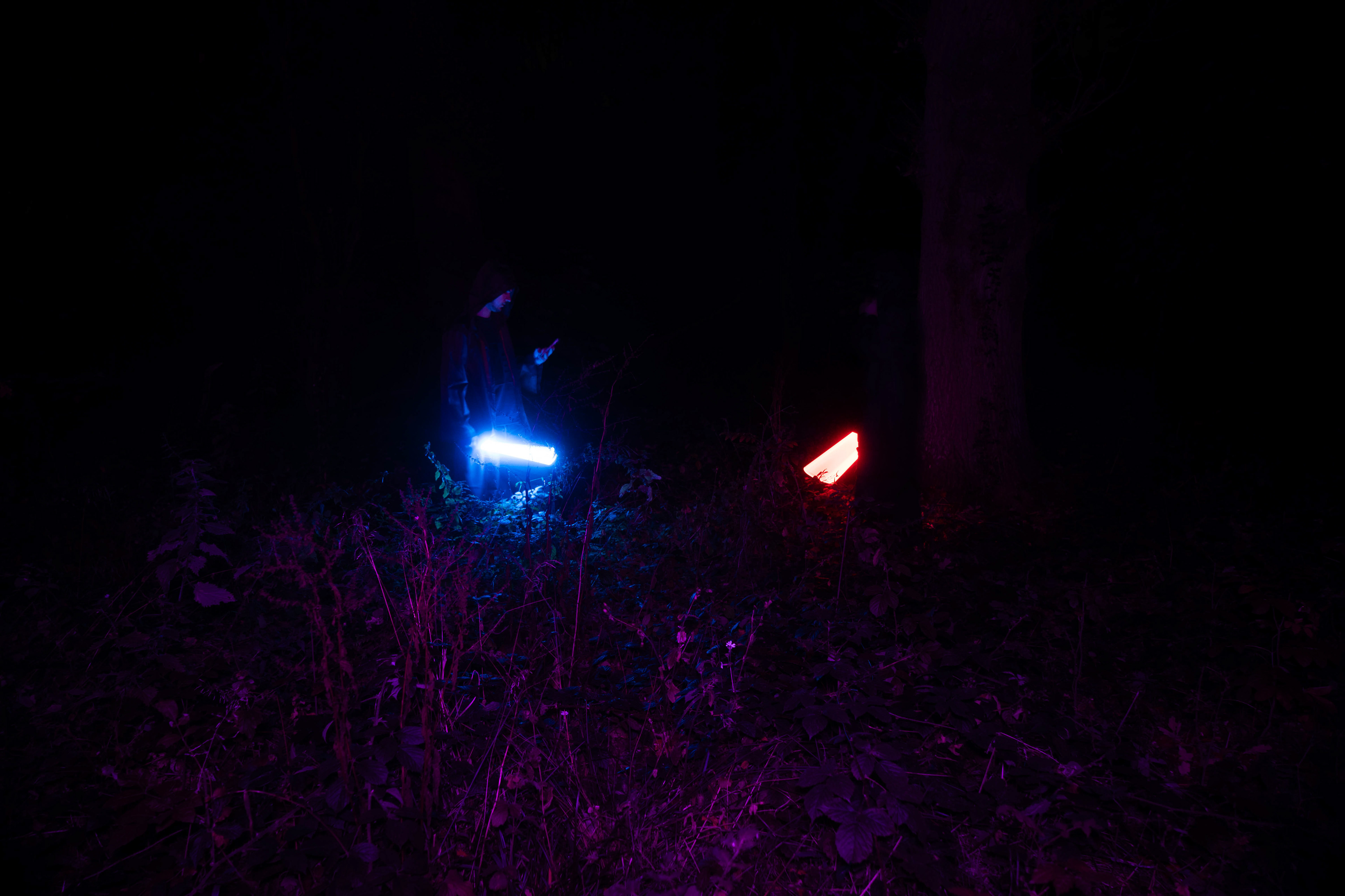 For this sequence of photos I took a similar idea but took it out to a forest location to give the look of a star wars planet. for these photos I added a black mist diffusion filter to the camera to create the look i attempted on the first image from the previous set. this means that the light sabers get more of a glowing effect around the direct light source, this adds a more "cinematic" feel to the lighting. all these photos were lit with a rectangular "aperture mc" light on a pink setting, this allowed for the foreground and some of the background to be more visible in the dark location. in post I created a desaturated look but I feel the use of the pink still helps lighting and can be seen slightly in some of the foreground leaves- i chose pink as I thought it would create a more "sci-fi" look but later felt it was too much and a more cinematic look worked better for this set.