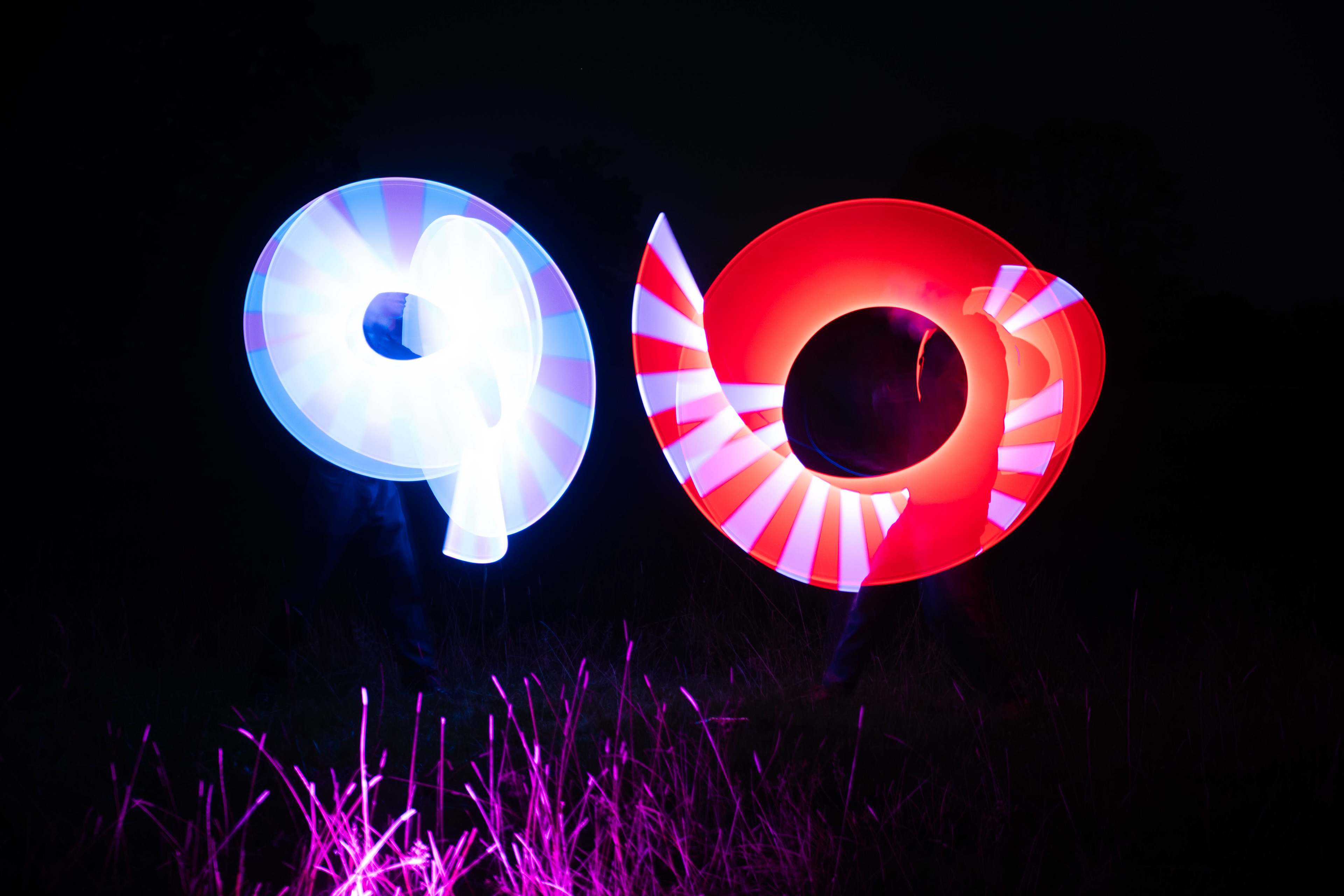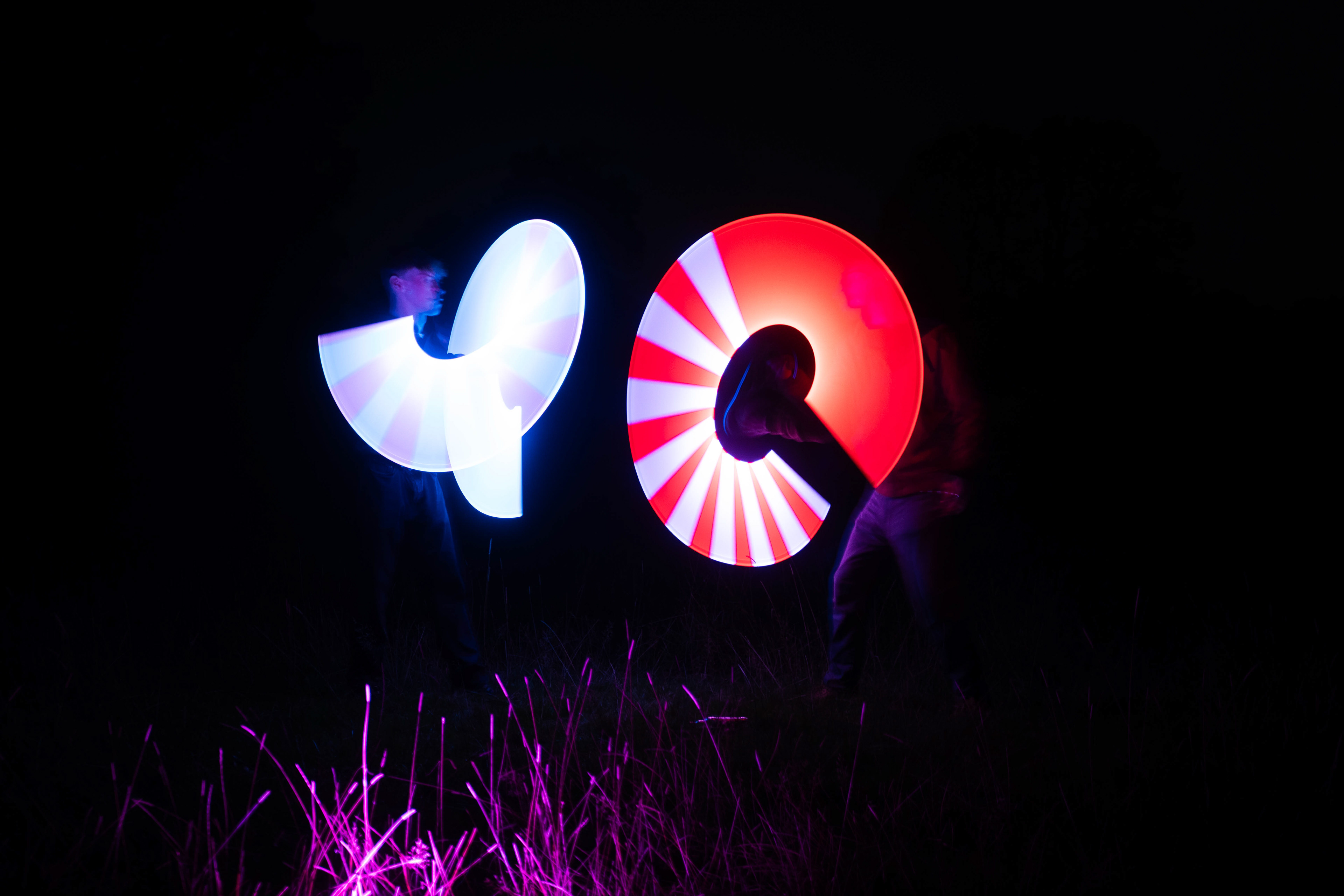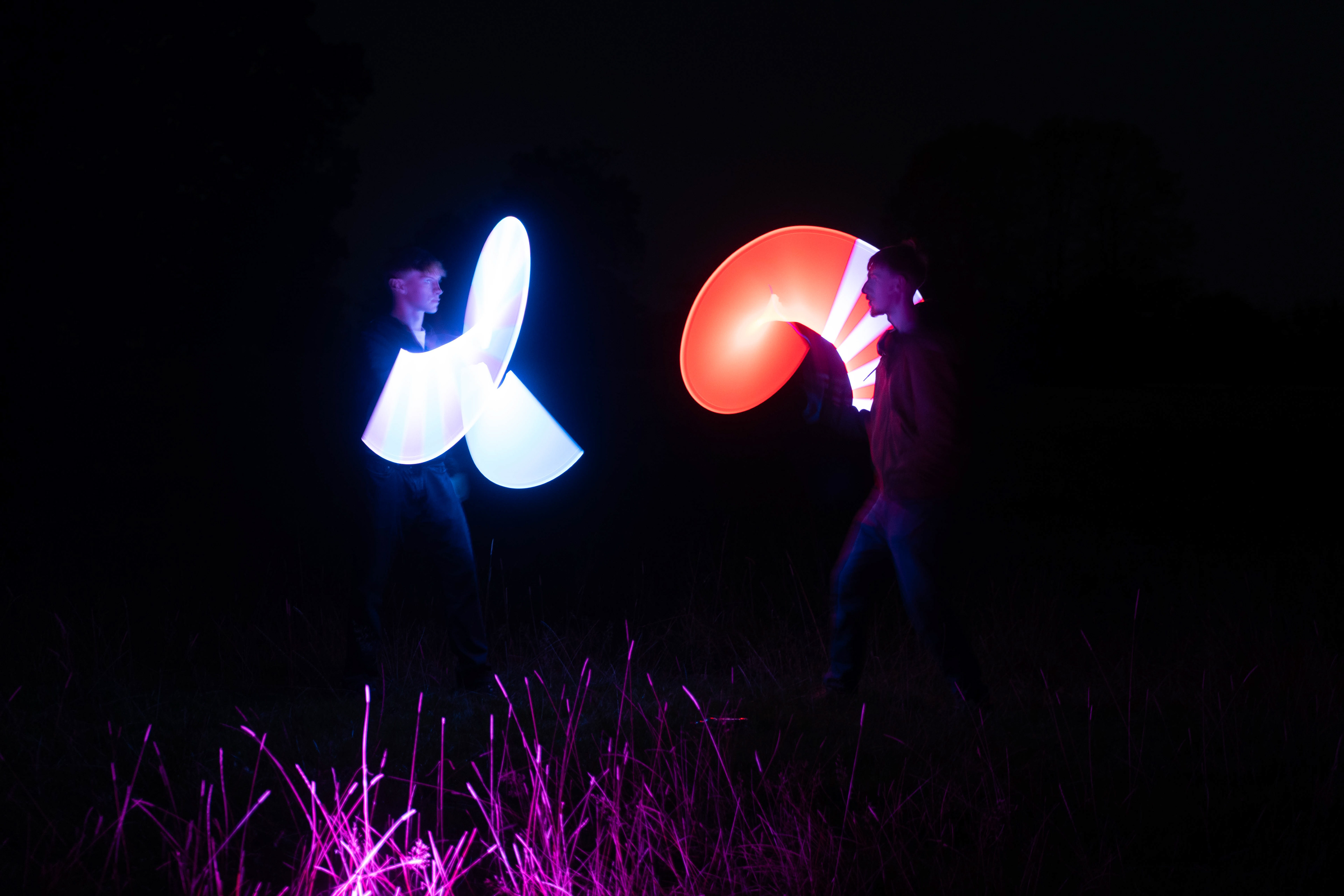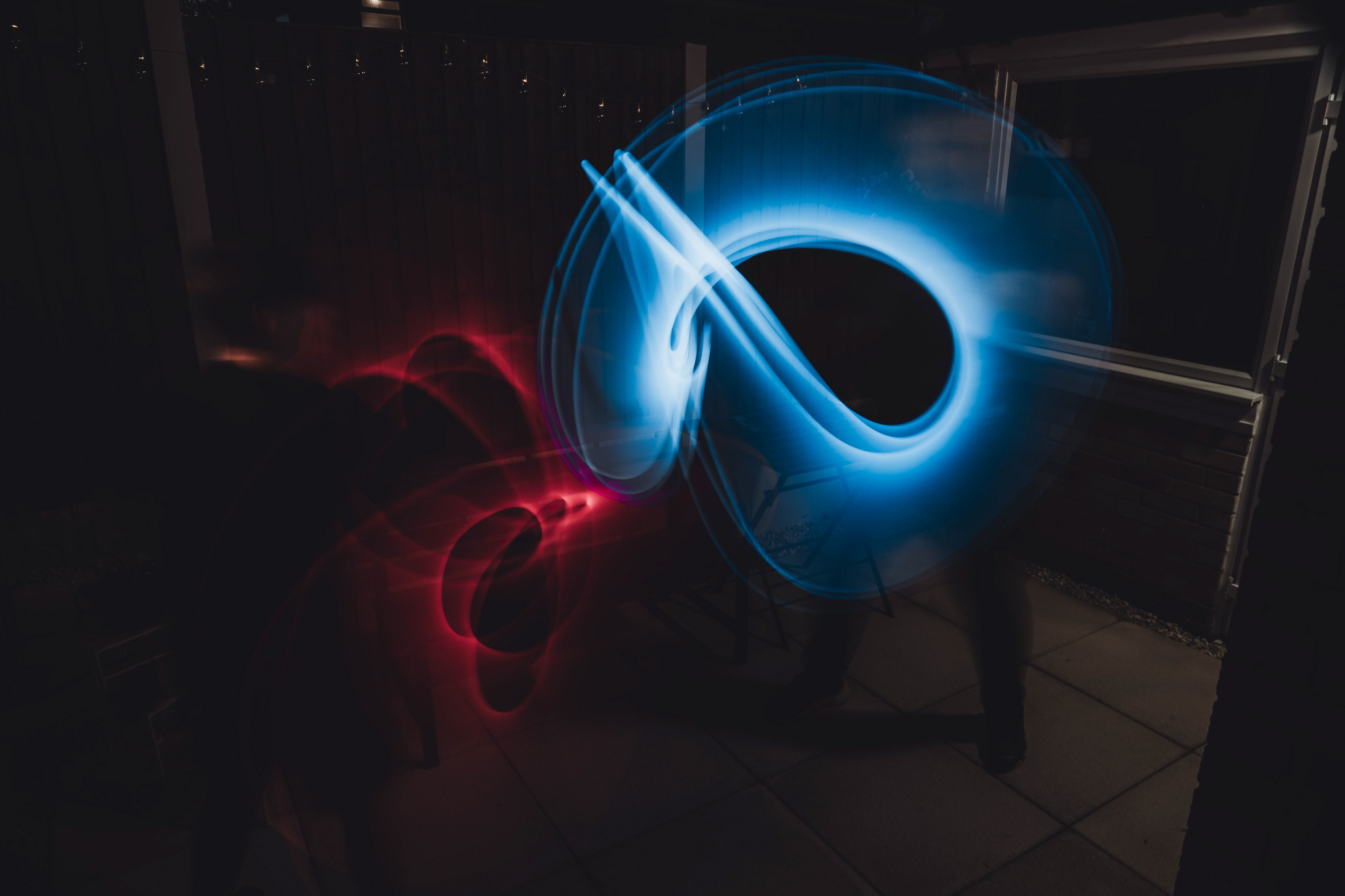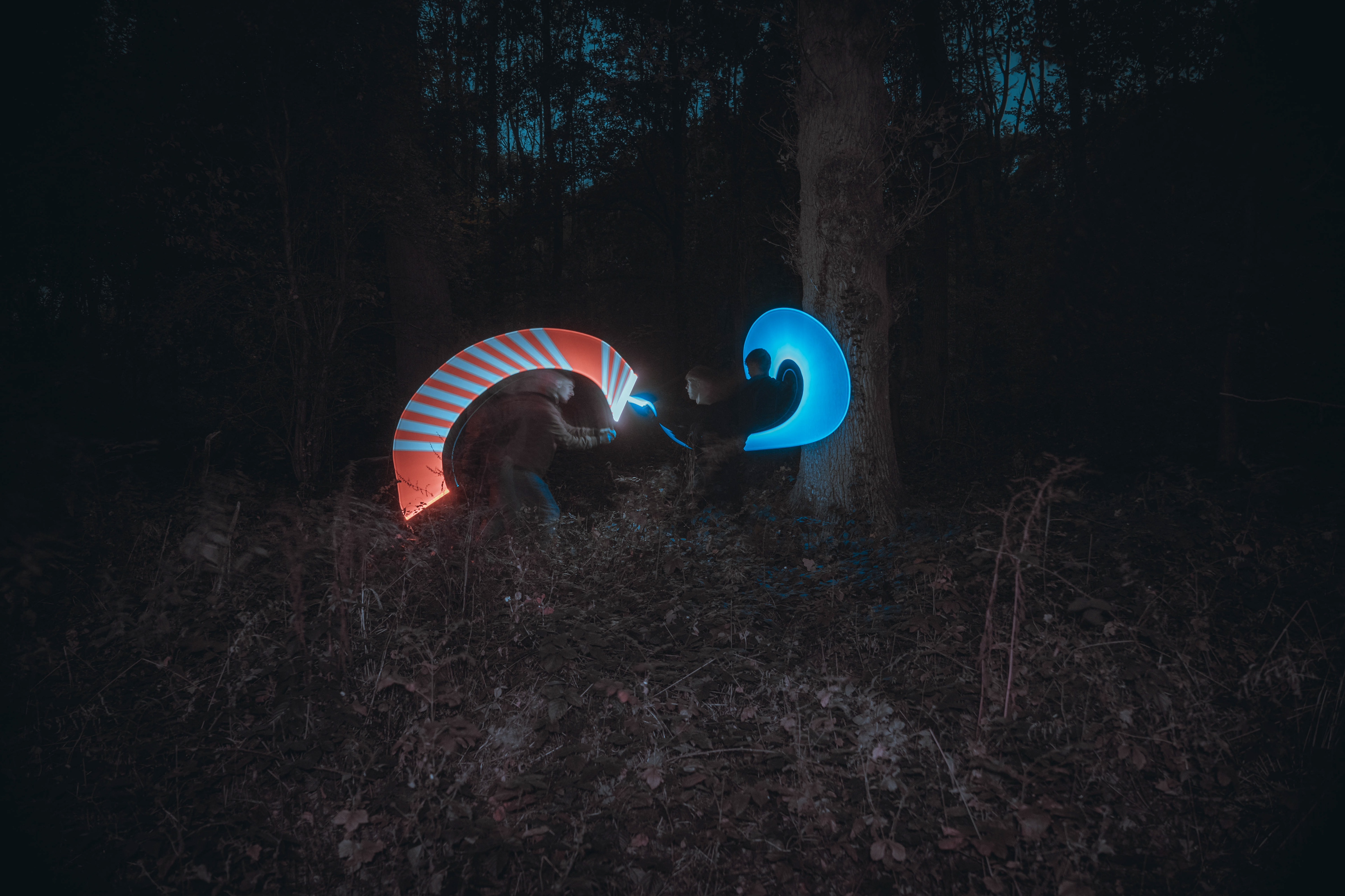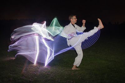 The third photo was taken at --- seconds- with the same method used of keeping the final position for an extra amount of time to increase the final light. this long shutter speed also allows to see the starting and finishing positions of the subjects bodies and heads which almost shows 2 scenes inside of 1 photo. this photo shows an attack from red which blue has to block, leading into the next photo.