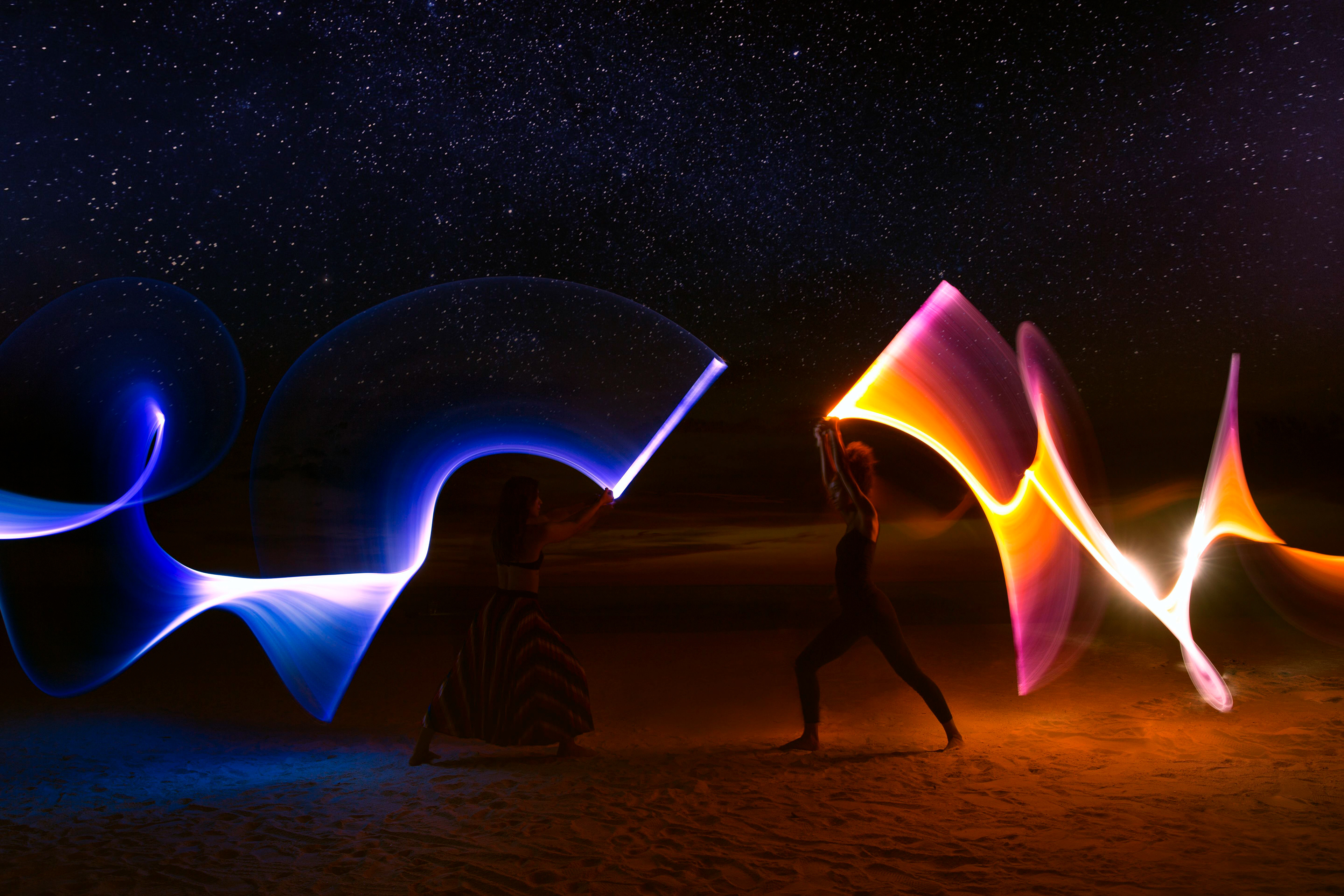 this image shows a lightsaber duel using long exposure. this photo was taken in a vast what looks to be desert at night. we can see the stars in the photo and we can also see the light from the blades bouncing off the floor of the sand. the blades show a clear path of the attack and hold just before the connecting moment. the begining of the light is on the outside of the frame from both subjects, i think this is effective as it shows a long build up to the connecting moment, i also think the use of spins is effective, although on the red light we can see that the spin has looped over itself and created a blown out highlight which i think deteriorates this image. i think this photo was taken at a slow shutter speed of around 10 seconds because of how clear the subjects are, i feel this image started with coming from the outside and did the choreography very slowly and then held in the final position we see them in for a while to make them clear in this position, this is further increased by the light showing on the red fighters back and head. i also think this image was taken at a very high aperture as we can see the sand dunes stretching until the back of the frame. this is a well coregraphed photo and i would like to create something with aspects of this image myself.