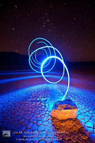 This image features a long exposure using a light painting technique. The photo is set in a vast rocky landscape, the photo was taken at night on what looks to be quite a long exposure, maybe over a minute- I know this because the stars have moved in the sky, although this could be because the tripod was moved. the subject of the image is a rock with a light coming out of it in a spiral shape. This was likely made with a handheld light with someone walking away from the rock. we can see the light on the floor of the scene but it is working in triangles, leading the eye towards the rock. this could indicate exposure stacking or another light being turned on during the exposure to create this effect, regardless i feel this was done purposefully to lead the eye towards the subject. another point is that no person can be seen holding the light which again indicates a long exposure time as the person who is moving has not been picked up in the photo. the aperture on this image would have been high as there is very little blur in the background and all of the light painting is in focus as well as the rock. I feel this image could have a better direct composition if the light trail was following a more linier path- i feel there is little realism and immersion as we can tell the light was not supposed to be there- the lines on the floor help to combat this but I feel more could have been done to create an immersive image.