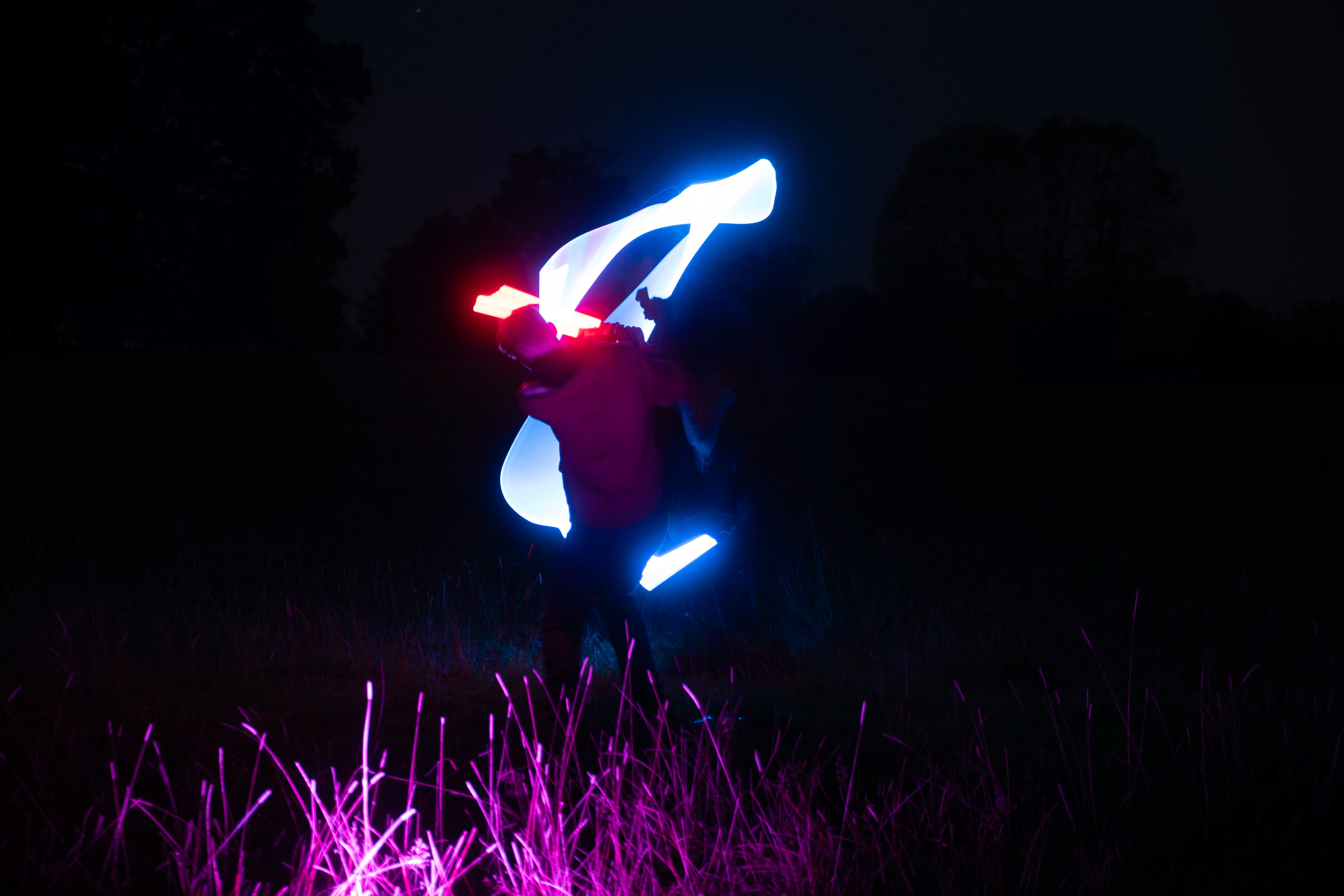 the second image in the set shows the first attack with blue coming from below and red blocking from above and meeting in the middle. this image was taken at --- seconds- and i had the subjects hold at the final hit of the scene just before the blades touched to allow slightly more exposure to the final placements of the blades.